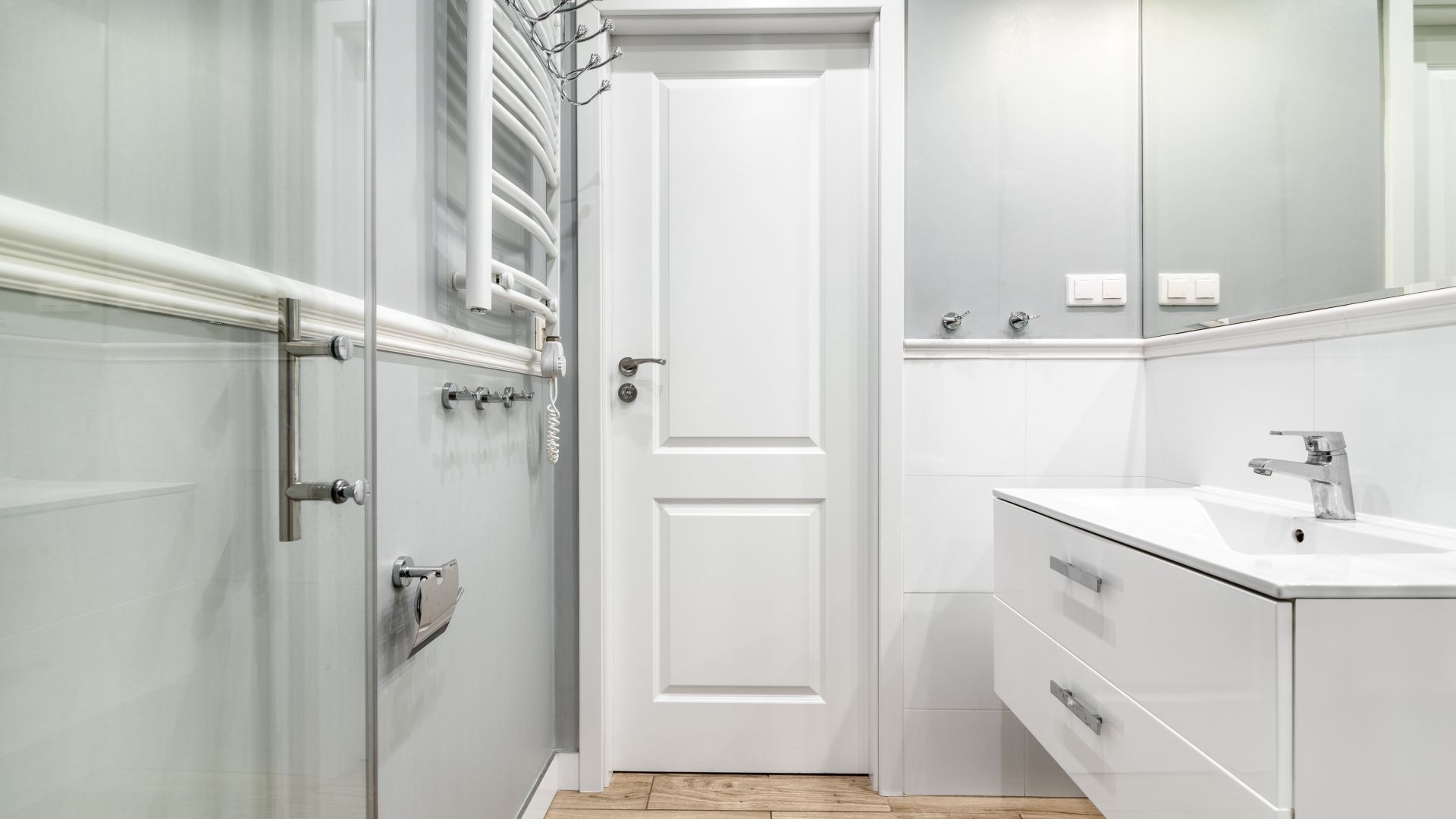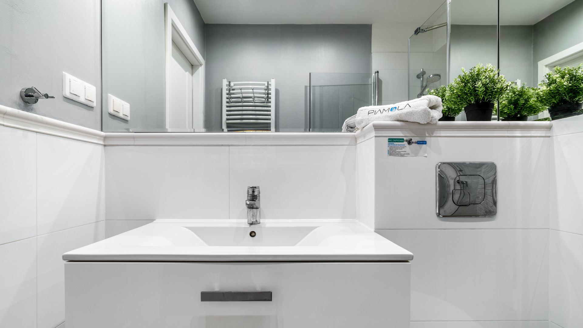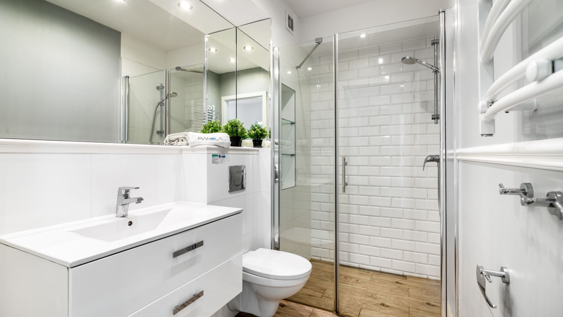 W przestronnej łazience znajduje się kabina prysznicowa oraz suszarka do włosów, co zapewnia dodatkowy komfort i wygodę.