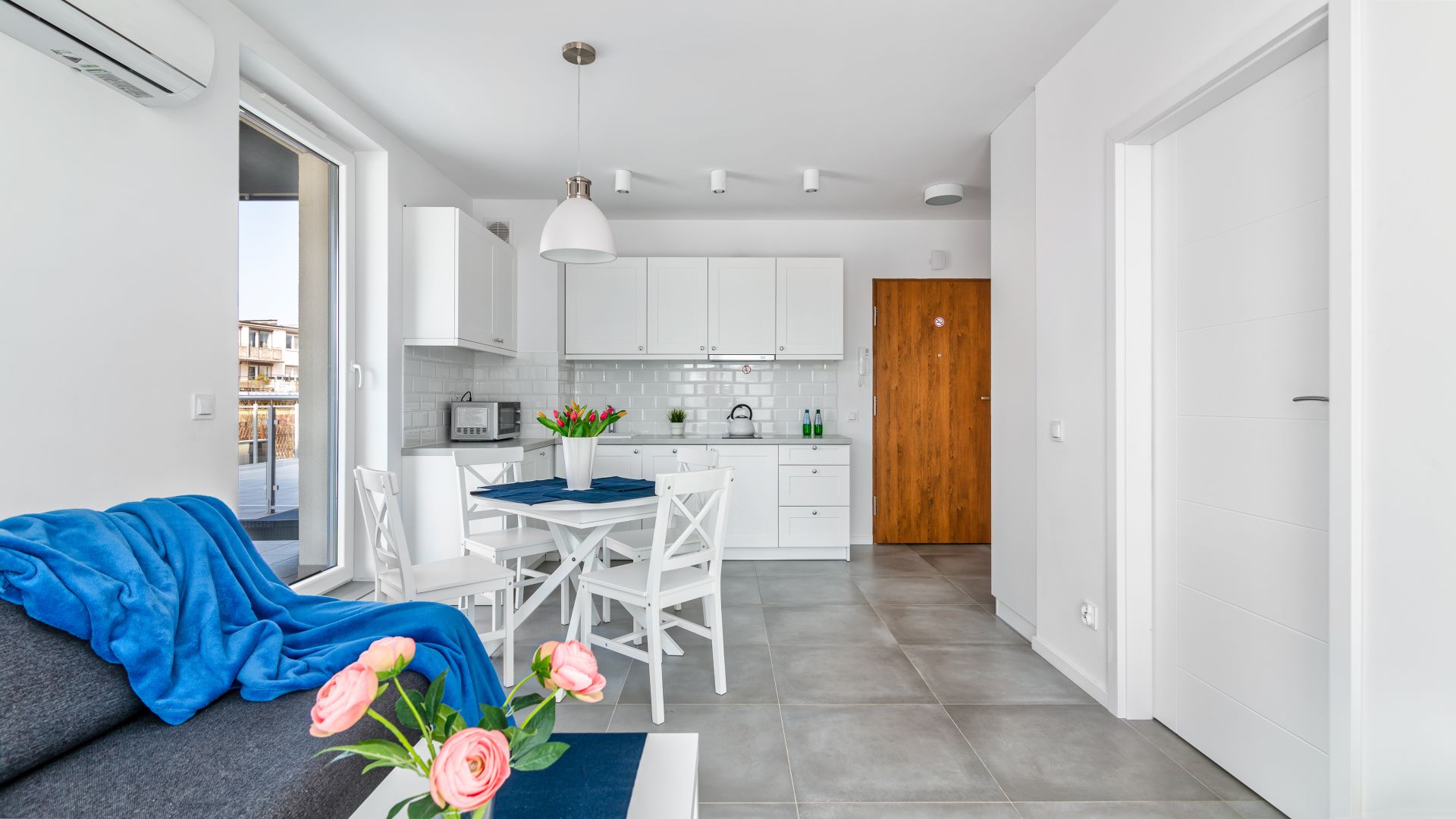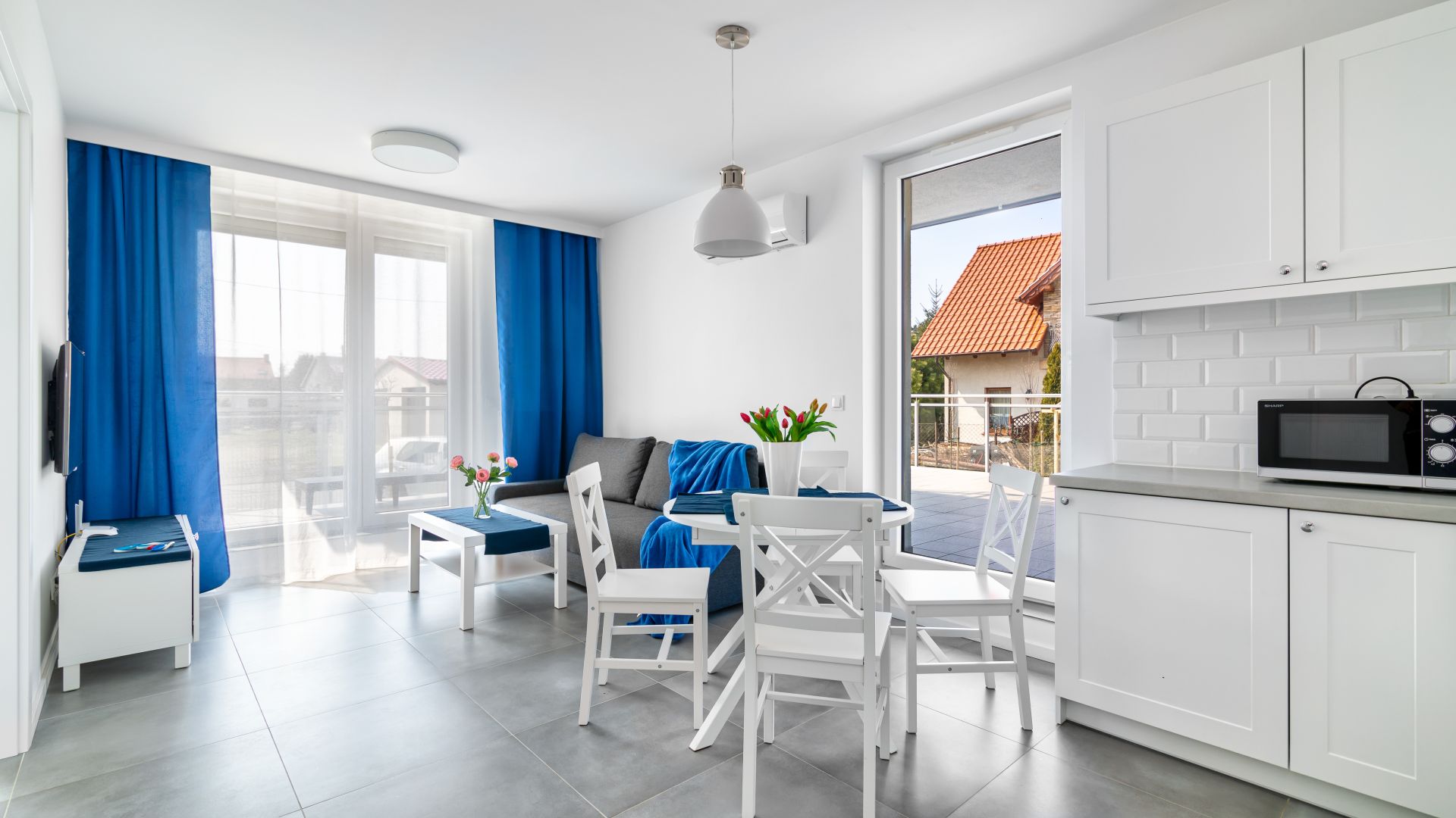 Oferujemy Państwu nowoczesny apartament, który został wyposażony i zaprojektowany z myślą o komforcie i wygodzie naszych Gości. Jest to idealne miejsce na wakacyjny pobyt, zlokalizowane w ścisłym centrum nadmorskiej miejscowości Kąty Rybackie. Apartament ma 32 m2 powierzchni i posiada bardzo duży ponad 70 metrowy taras z meblami ogrodowymi. W mieszkaniu może nocować do 4 osób. Otwarty salon połączono z w pełni wyposażonym aneksem kuchennym. Oprócz płyty grzewczej i lodówki znalazły się tam także mikrofalówka oraz czajnik. Dla naszych gości przygotowaliśmy także niezbędne naczynia, sztućce, kawę i herbatę. Na komfortowe zjedzenie posiłku pozwoli stół jadalniany. Apartament posiada własną łazienkę z prysznicem, WC oraz suszarką do włosów. W sypialni znajdują się podwójne łóżko oraz przestronna szafa, natomiast w salonie do dyspozycji Gości jest wygodna rozkładana sofa. Zapewniamy ręczniki i pościel. Do apartamentu przynależy prywatne miejsce postojowe w hali garażowej dedykowane dla jednego samochodu. Mieszkanie mieści się na parterze. Osiedle w którym znajduje się apartament jest nowe, ogrodzone i bezpieczne. Dużym atutem jest lokalizacja, gdyż wszystkie atrakcje, sklepy, restauracje i kawiarnie są na wyciągnięcie ręki. Jest to też świetna baza wypadowa np. do Trójmiasta (50 km). Obiekt znajduje się nieopodal lasu sosnowego, w którym znajdziemy ścieżkę prowadzącą na piaszczystą plażę (1,2 km). Istnieje również możliwość podjechania pod samą plażę meleksem, co stanowi dużą frajdę i atrakcję dla dzieci, jak i dla dorosłych. Dla osób ceniących sobie aktywny wypoczynek - liczne trasy rowerowe i nordic walking. Nasz apartament to idealne miejsce dla osób, które poszukują odskoczni od codzienności w błogiej ciszy w otoczeniu darów natury.