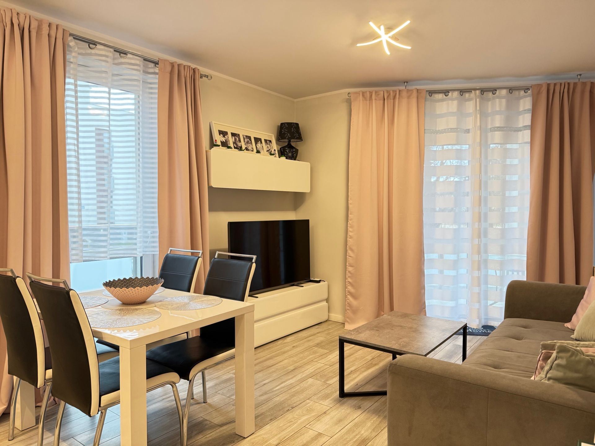 Wnętrze zostało zaprojektowane z myślą o wygodnym wypoczynku zarówno podczas krótkich, jak i dłuższych pobytów. Goście mają do dyspozycji bezpłatne Wi-Fi oraz telewizor, umożliwiające komfortowy odpoczynek po dniu spędzonym nad morzem lub na wycieczkach po okolicy. Apartament się zarówno dla rodzin, jak i par lub grupy przyjaciół.