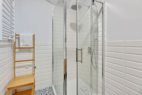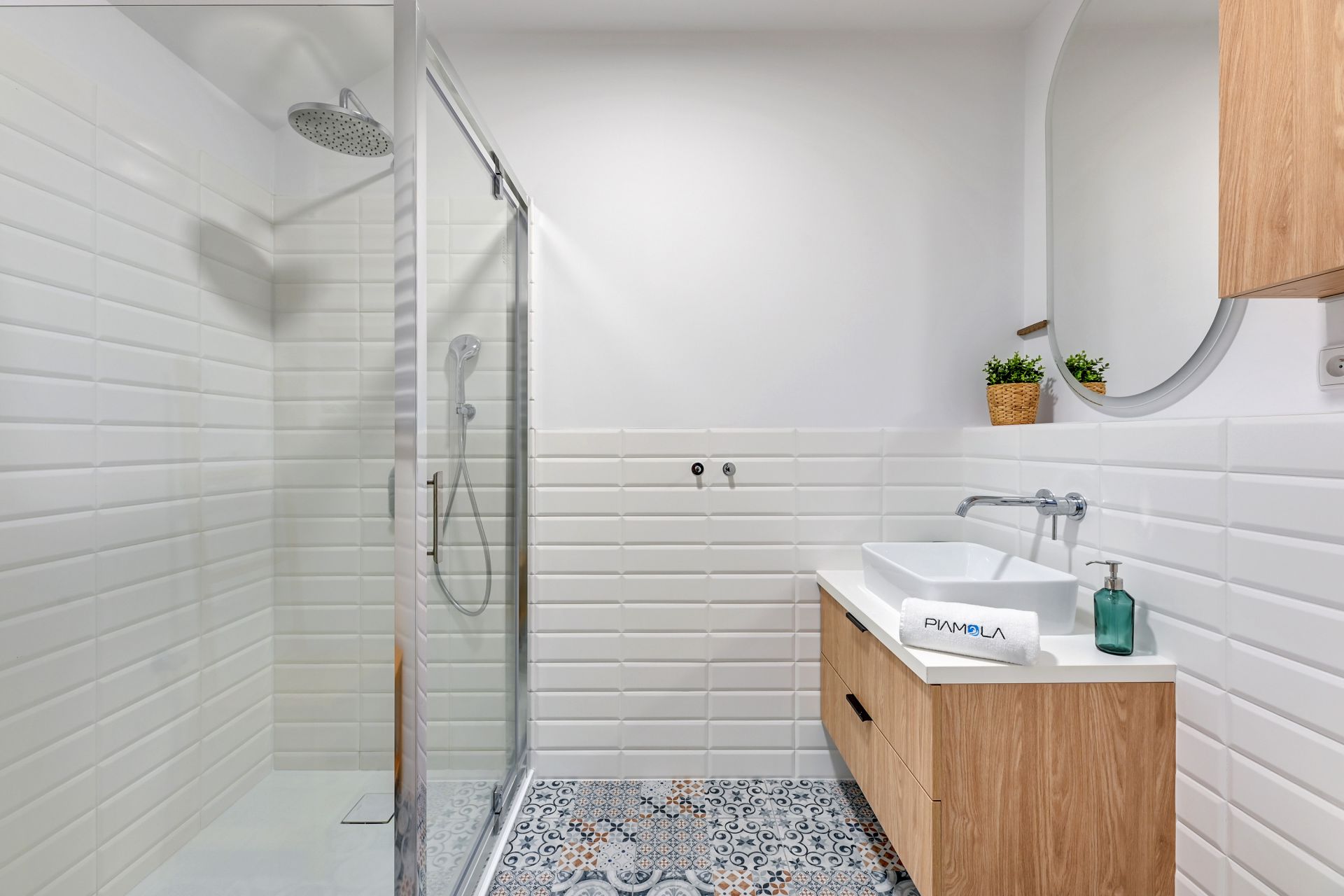 Łazienka w śródziemnomorskiej tonacji, z dużą i przestronną kabiną prysznicową,wygodną umywalką i szafką na przechowywanie, zachwyci swoją elegancją, a jednocześnie chłodną prostotą.