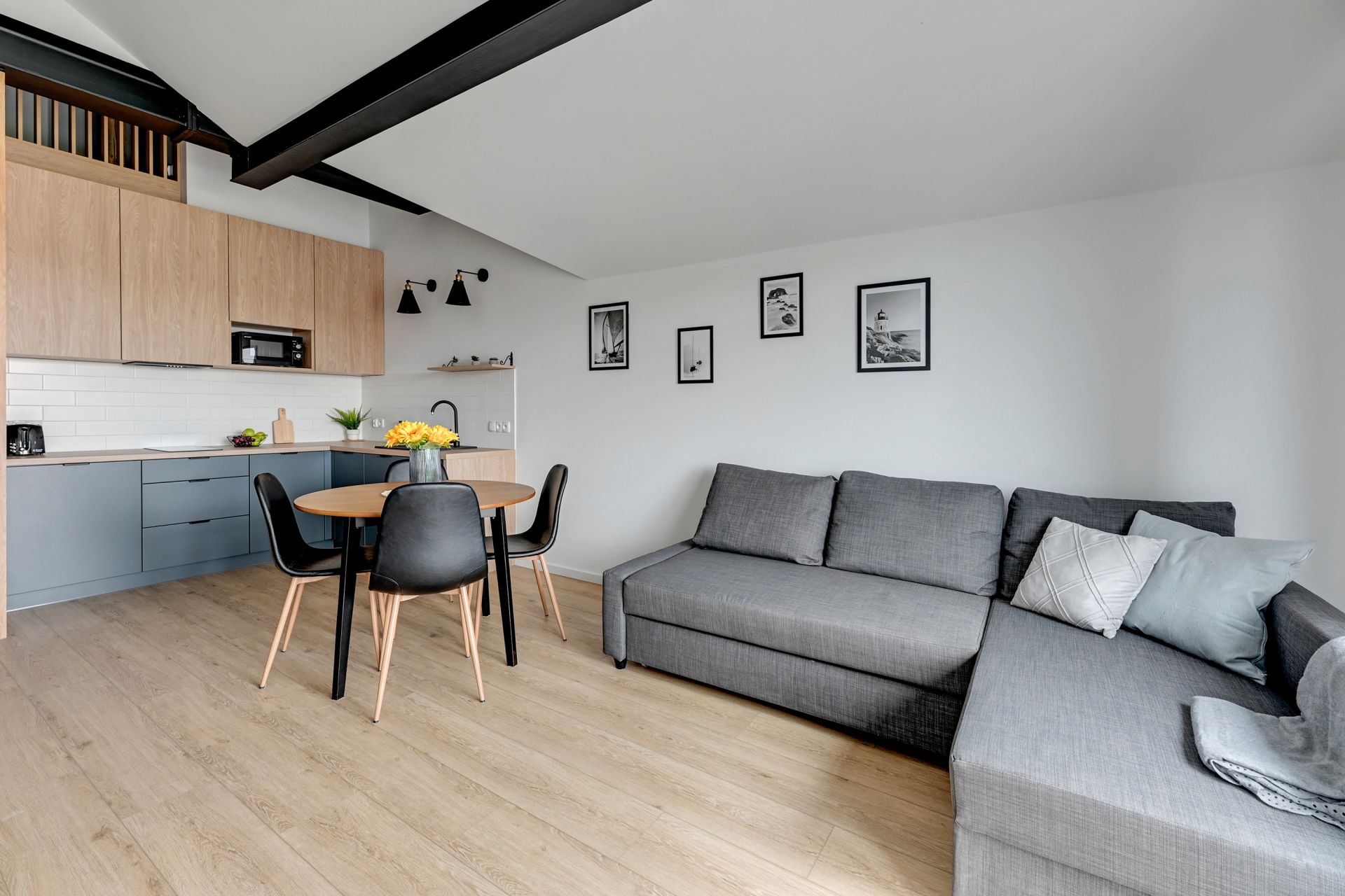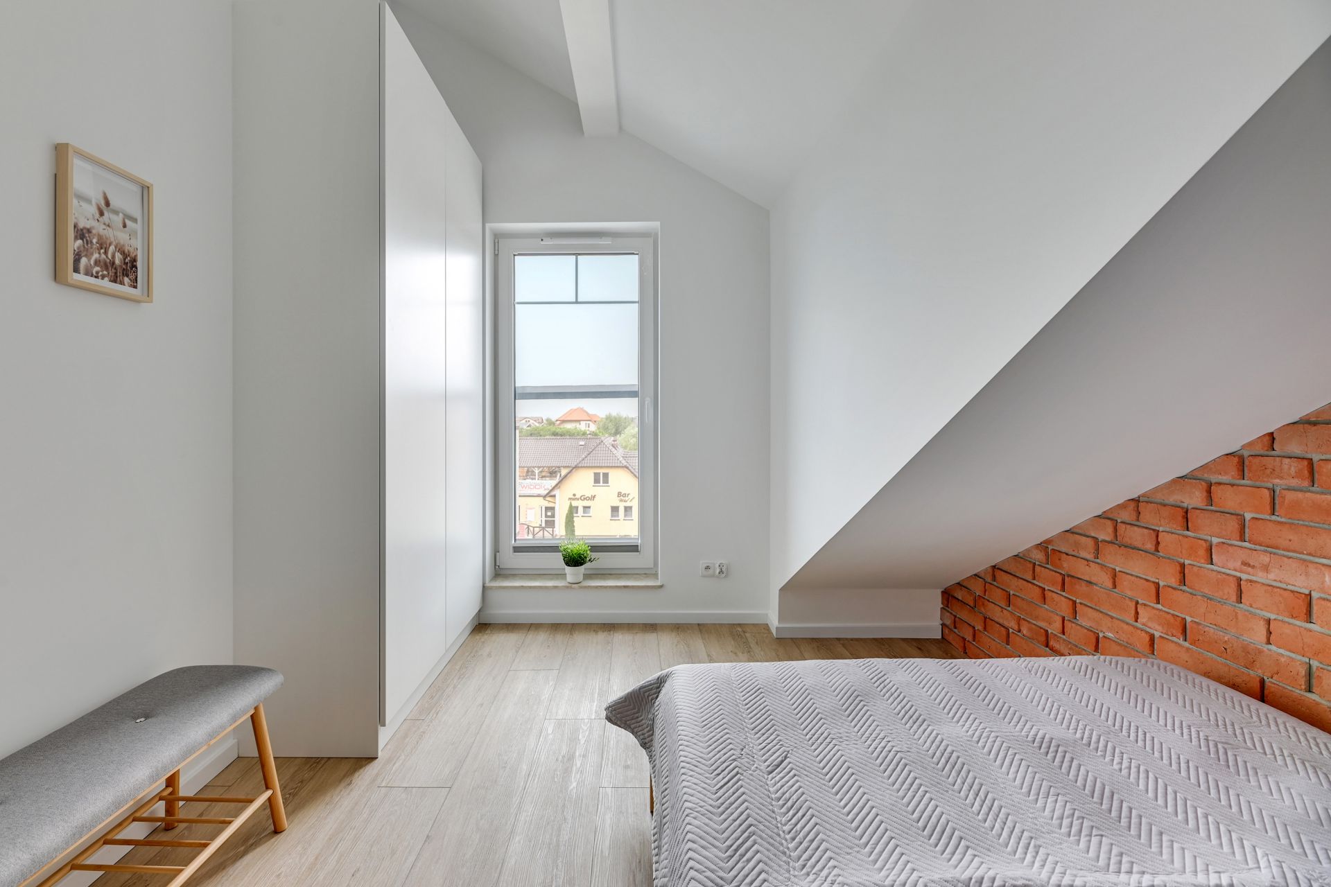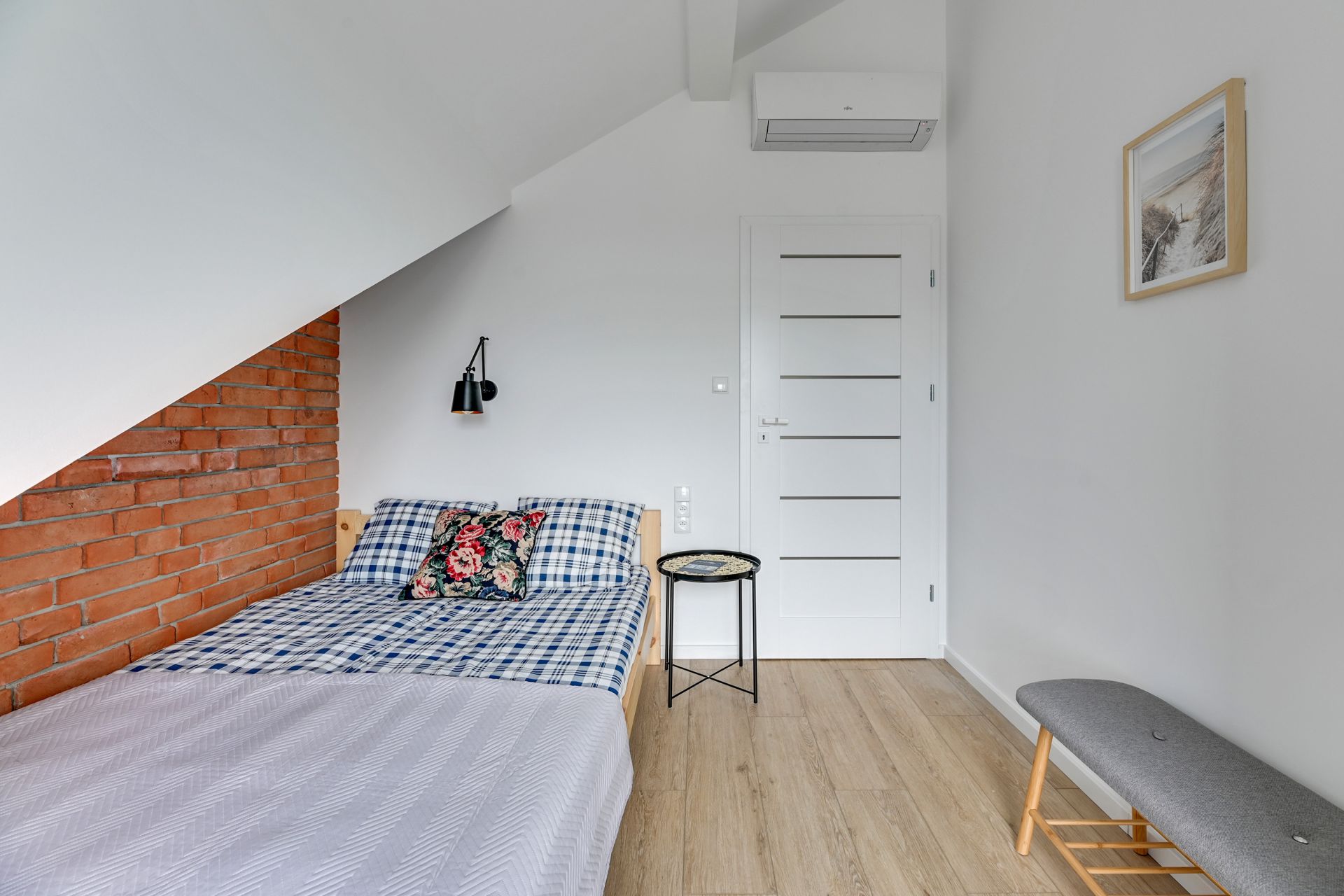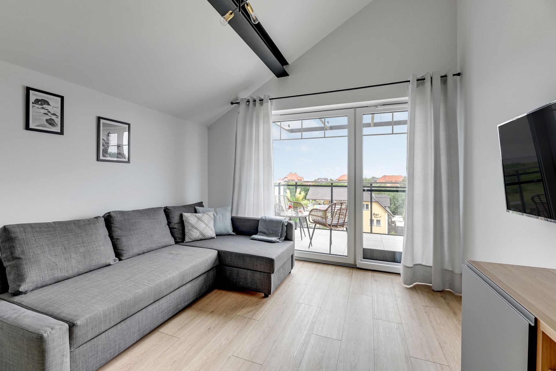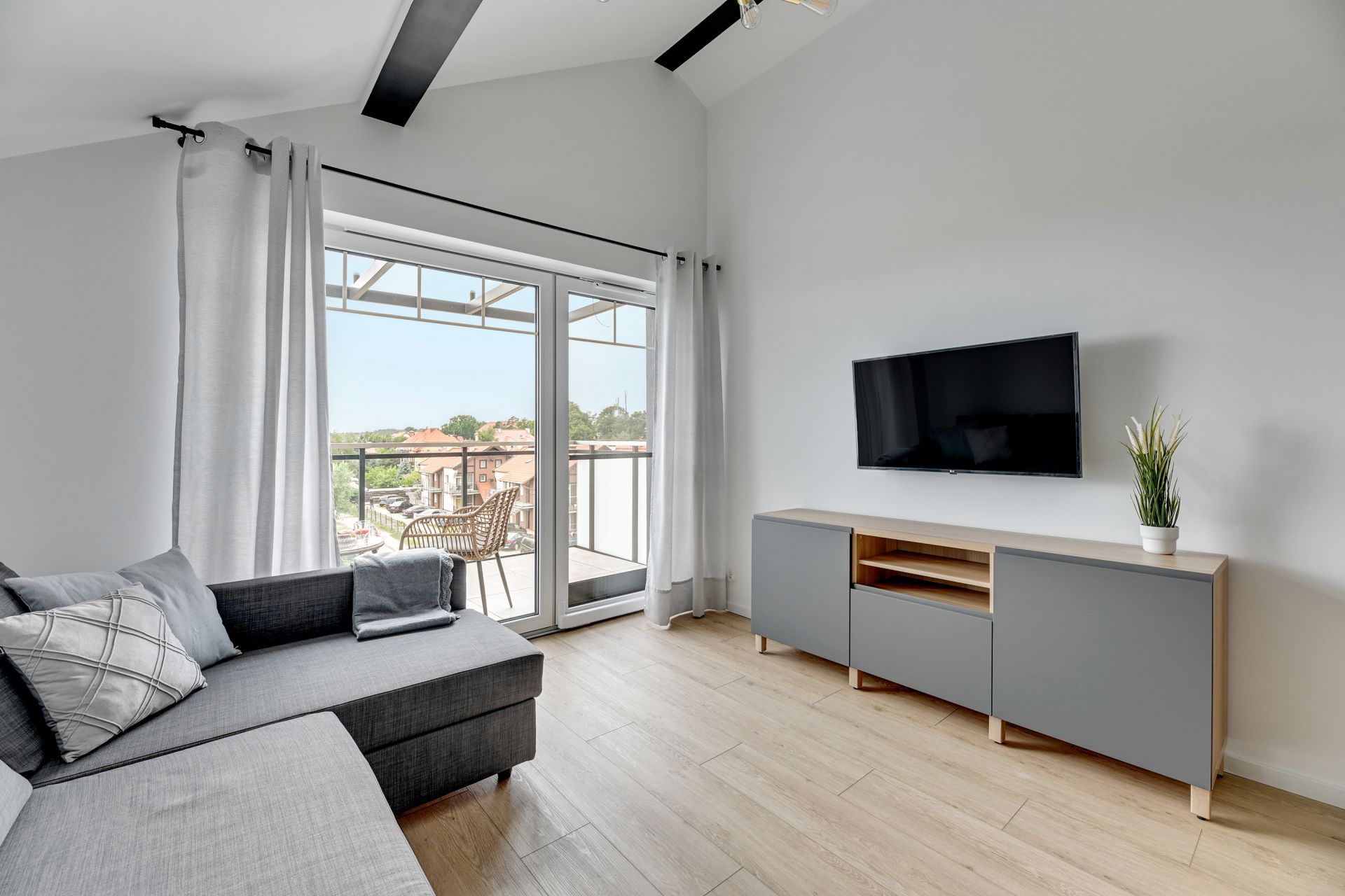 Salon z wygodną kanapą i TV pozwoli na chwile relaksu. Przestronna, elegancka, z dużym łóżkiem sypialnia, na pewno zadowoli niejednych z Państwa,