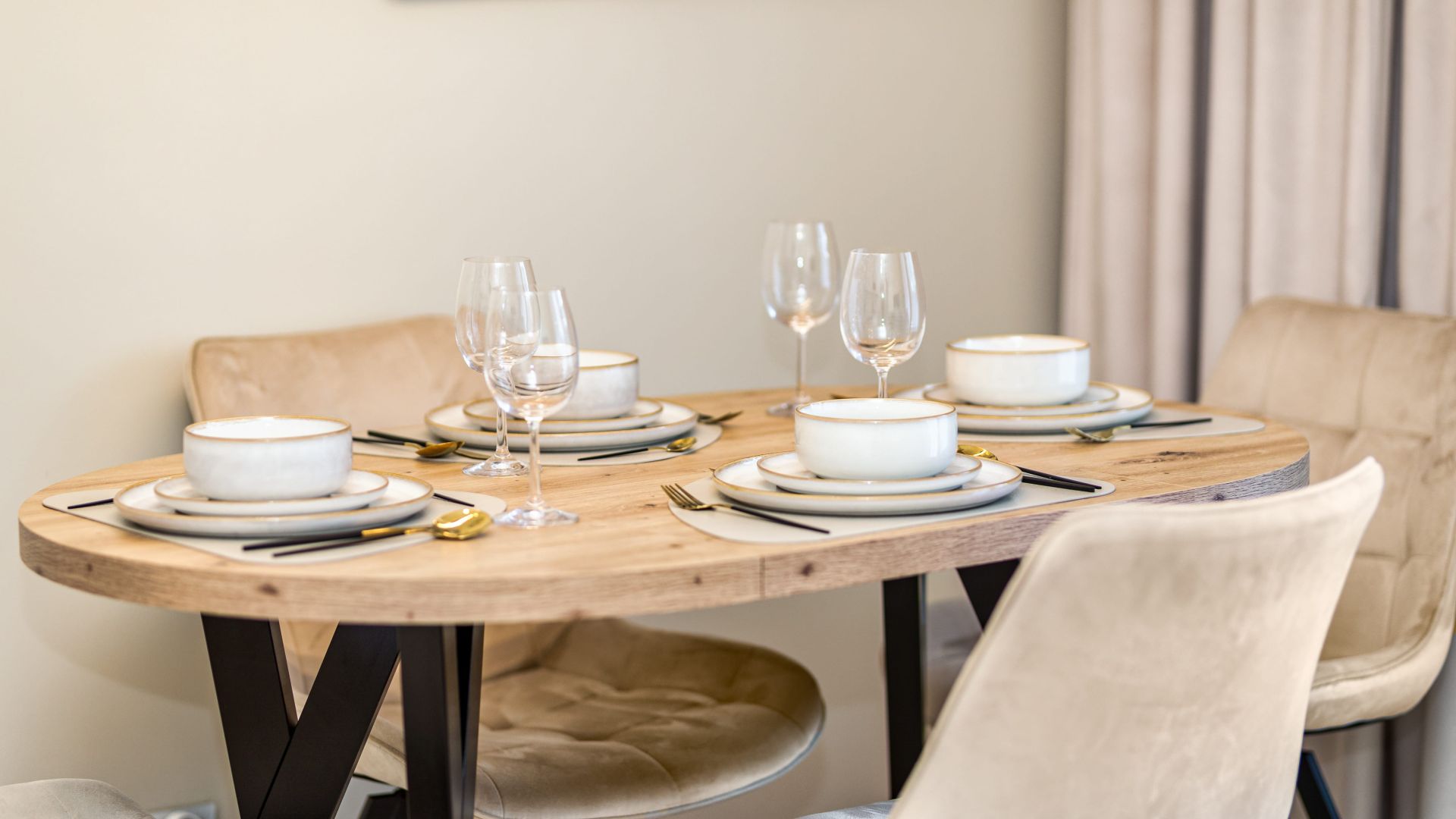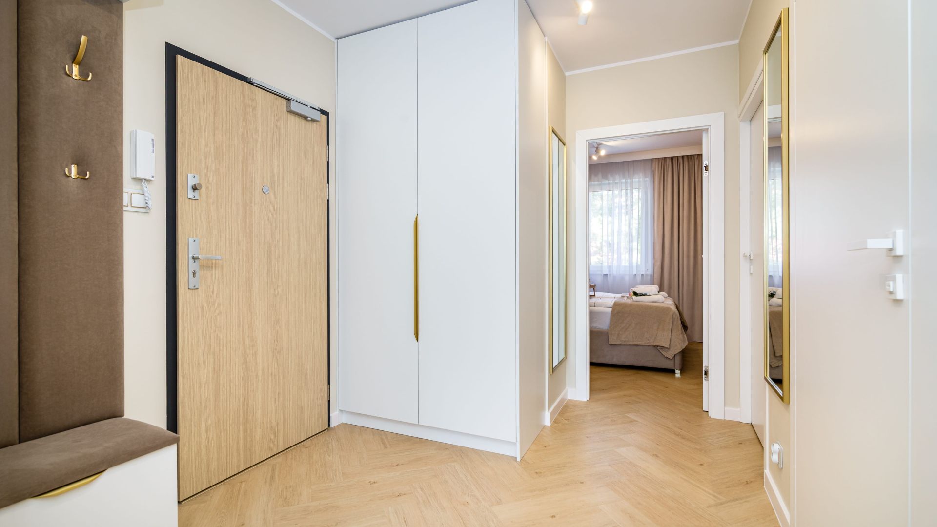 Mieszkanie zostało starannie zaprojektowane, z dbałością o spójność mebli, dodatków i detali, a kolory ziemi wprowadzają harmonię i wyciszenie, sprzyjając relaksowi.