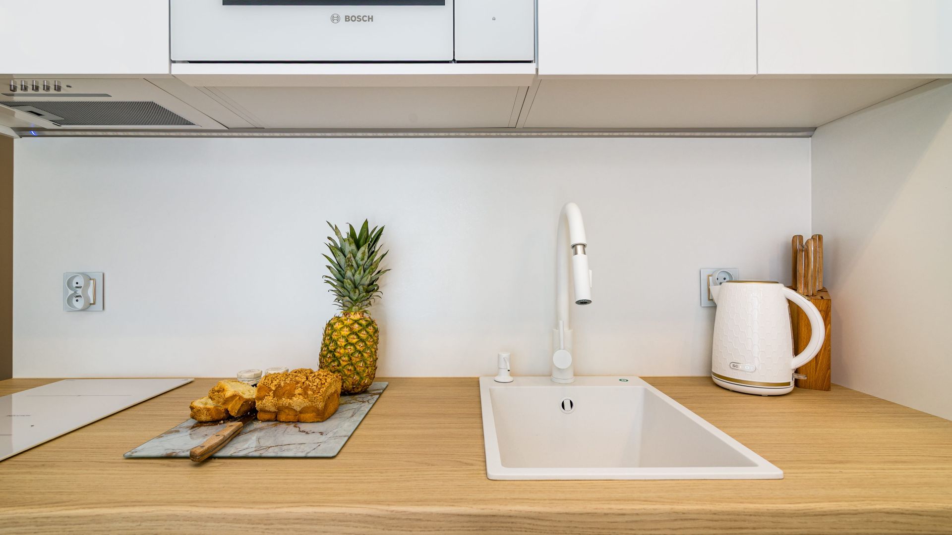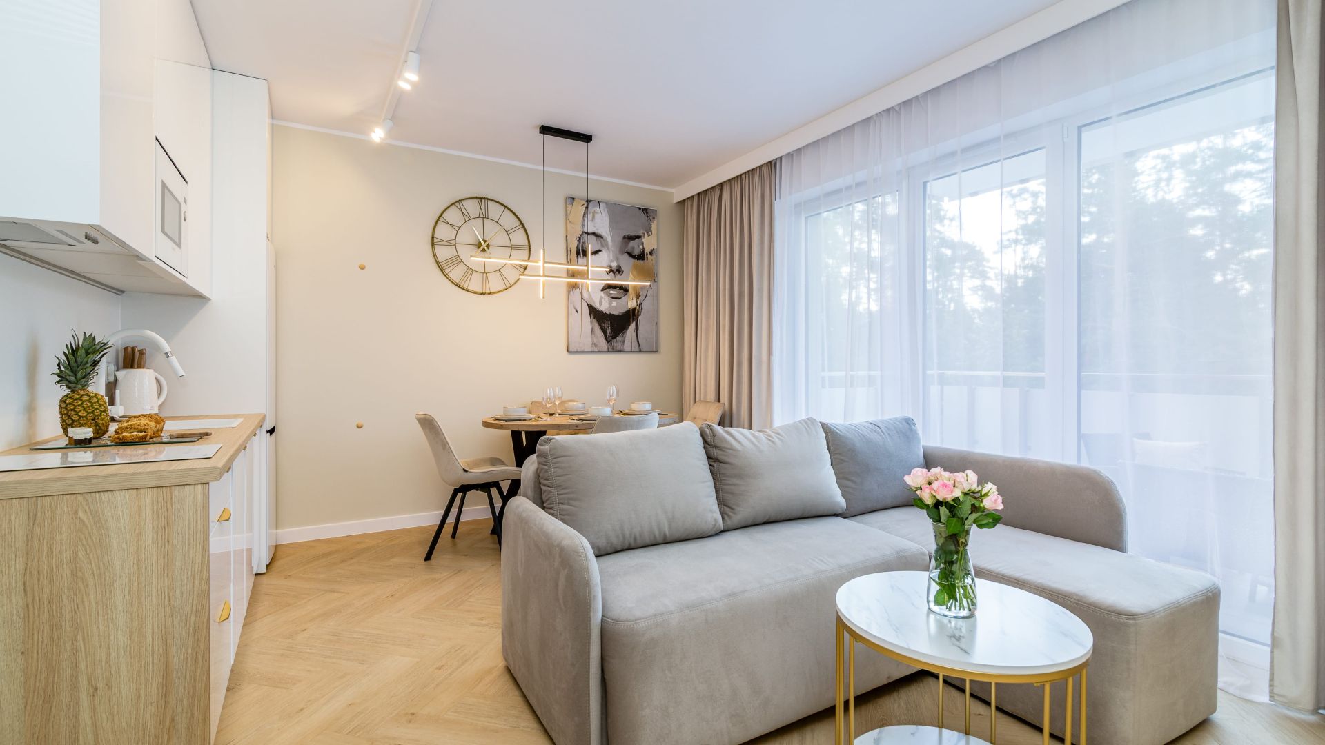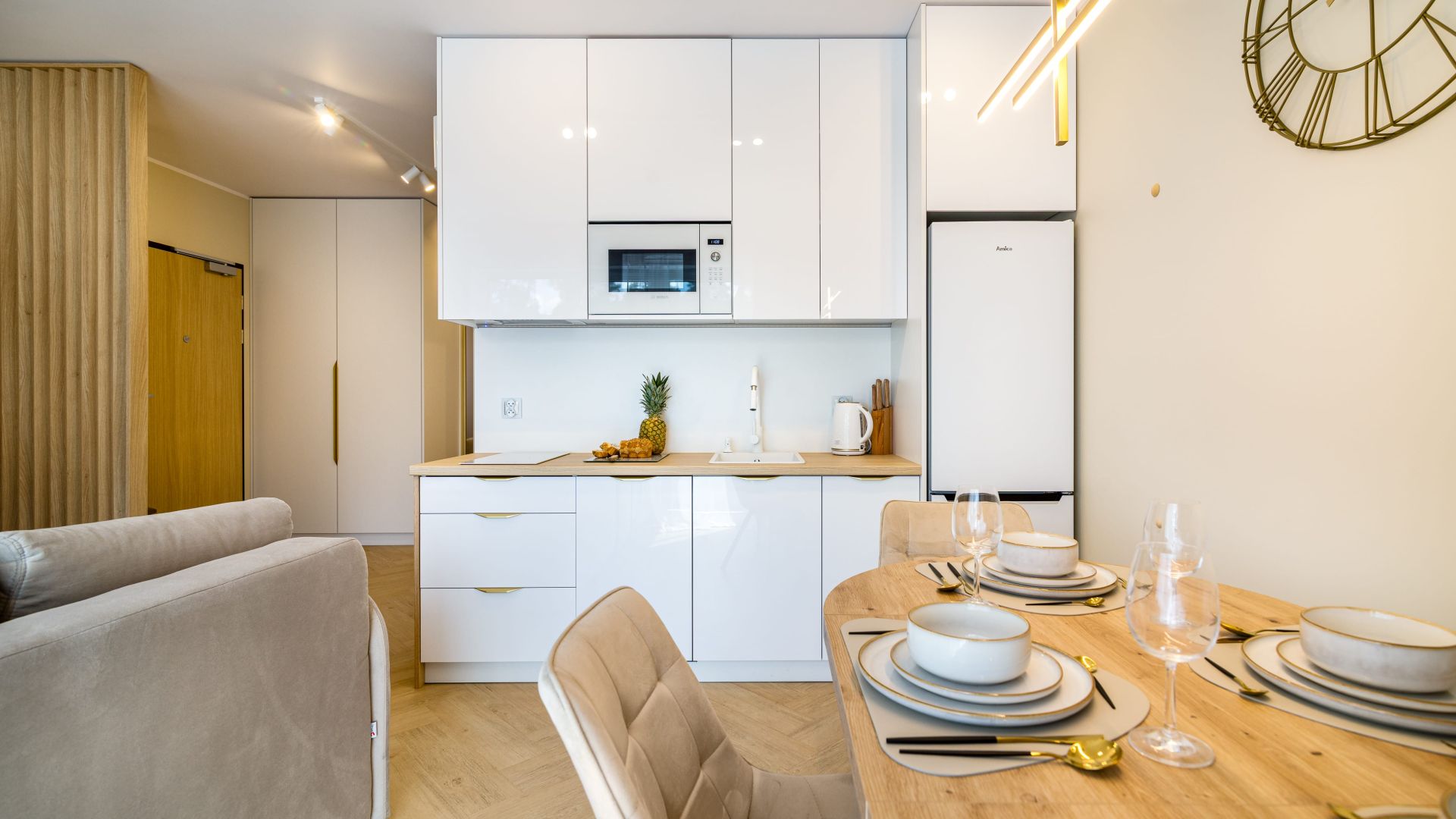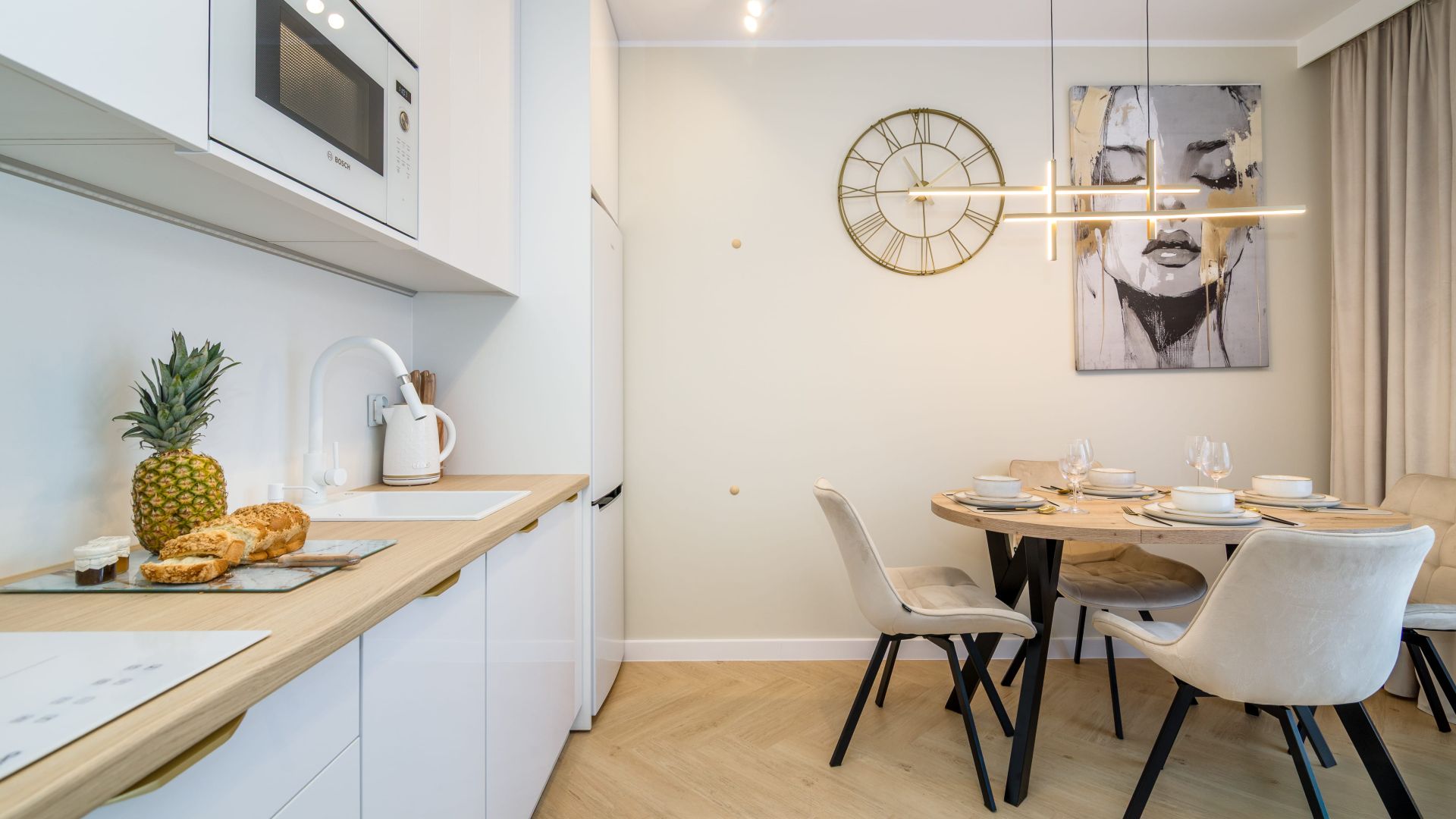 Apartament oferuje przestronny salon z aneksem kuchennym. Kuchnia jest w pełni wyposażona we wszystko, co potrzebne do przygotowania posiłków – zmywarka, płyta indukcyjna, opiekacz, czajnik elektryczny oraz bogata zastawa i stół jadalniany, przy którym można cieszyć się wspólnym posiłkiem.