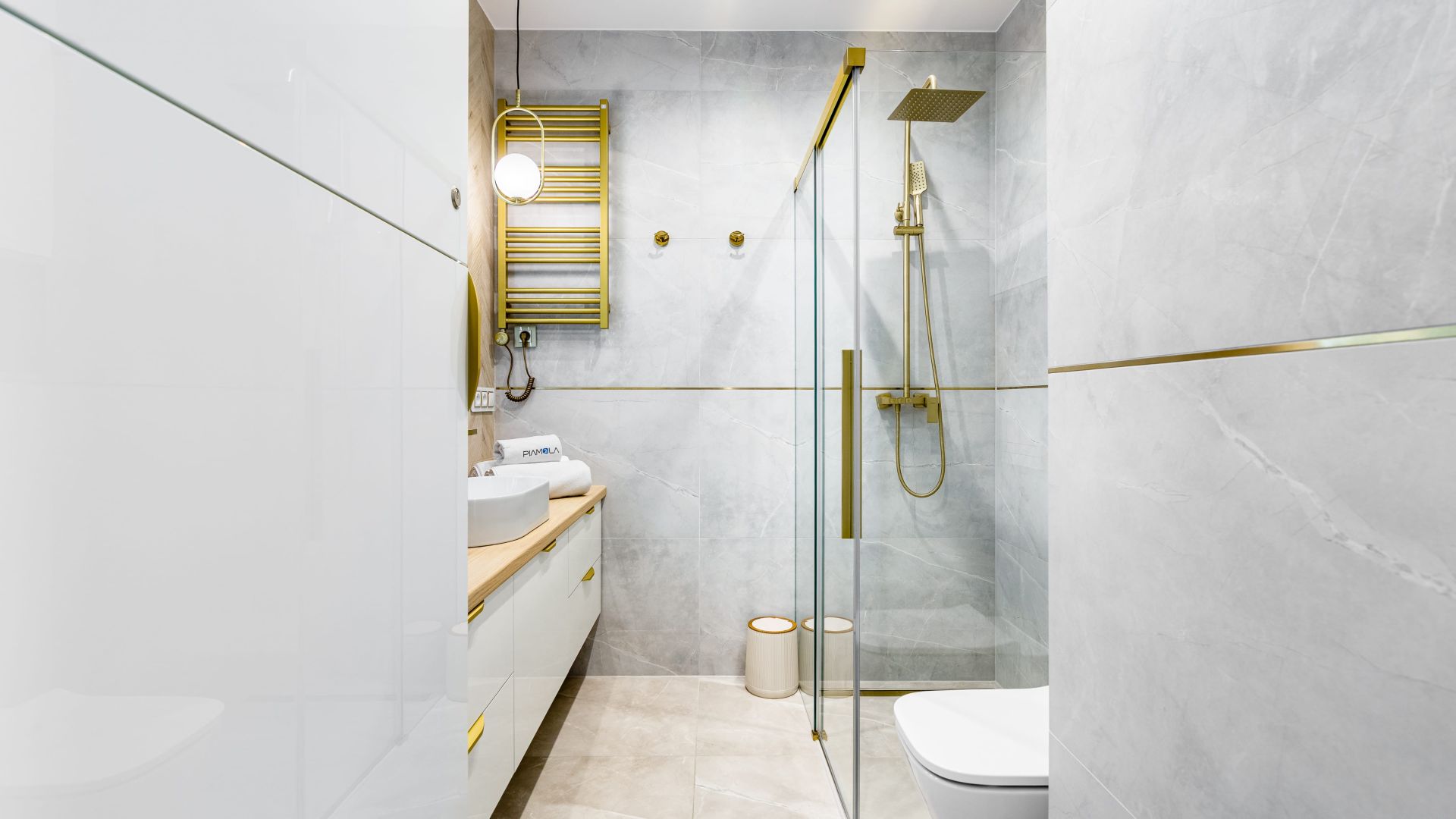 W łazience znajduje się prysznic, pralka, suszarka do włosów oraz podstawowe akcesoria, zapewniając wygodę podczas pobytu.