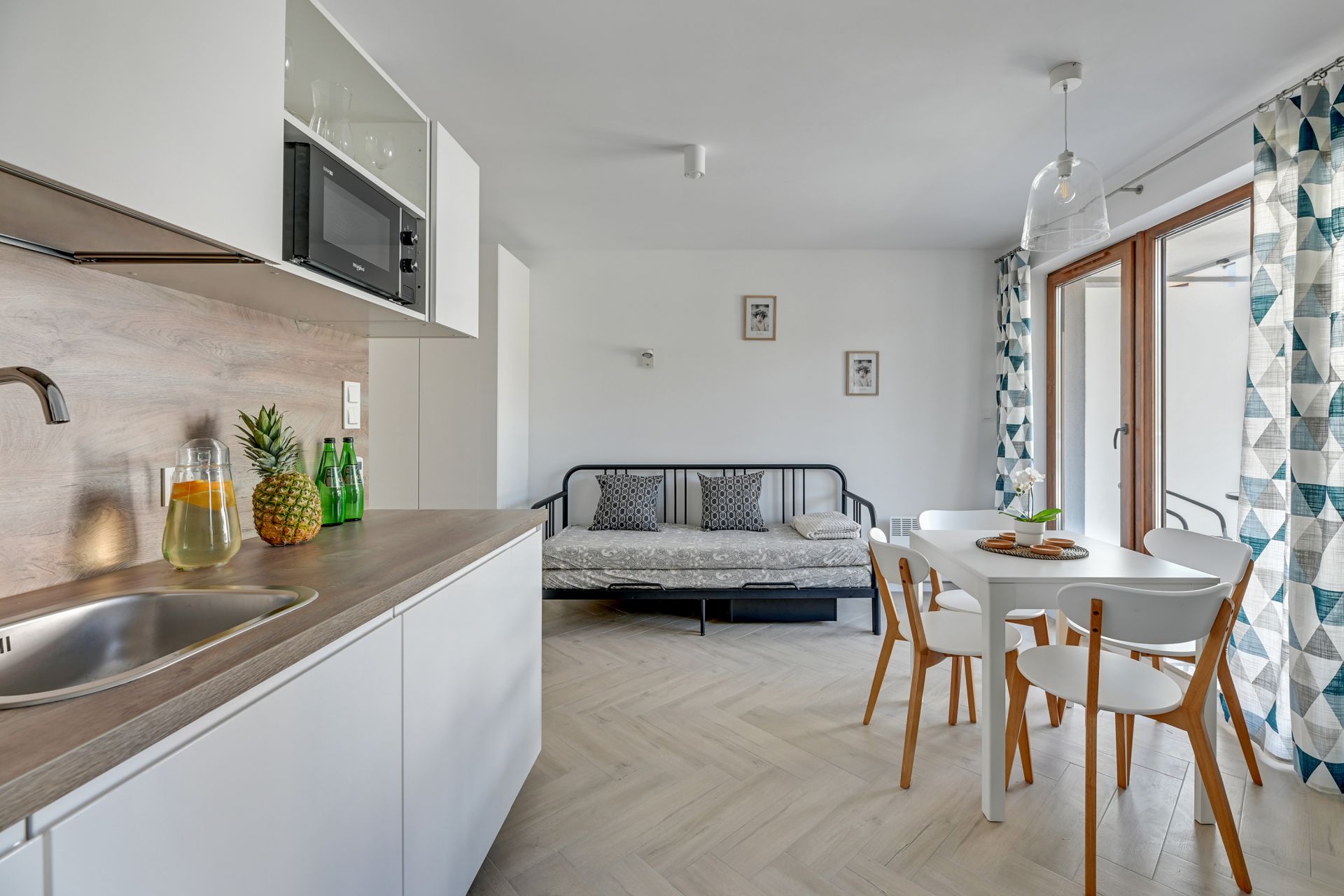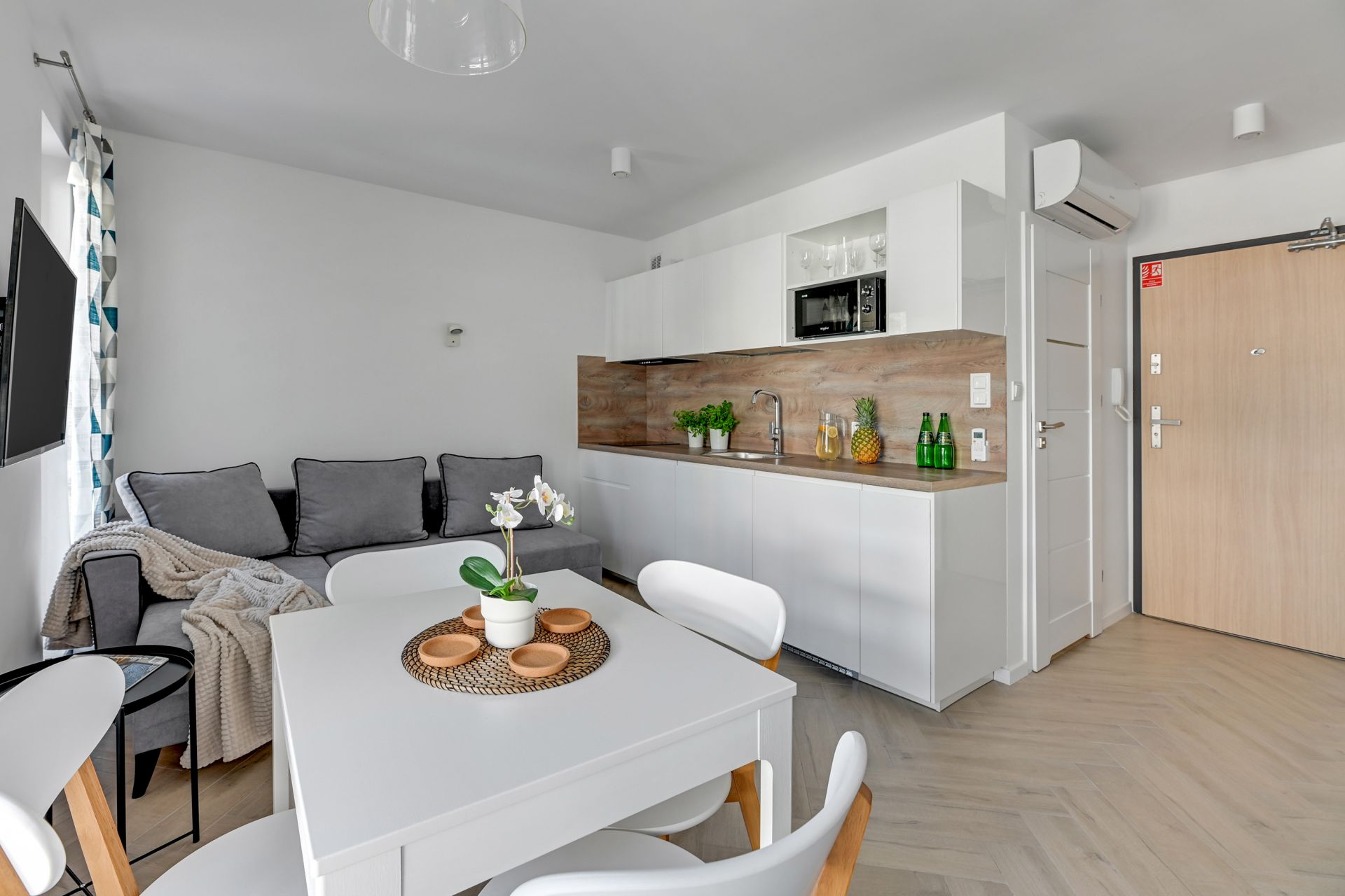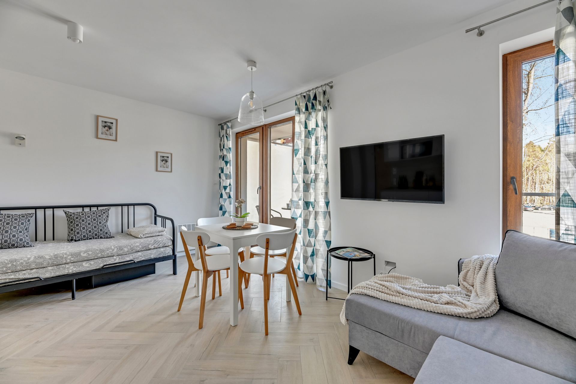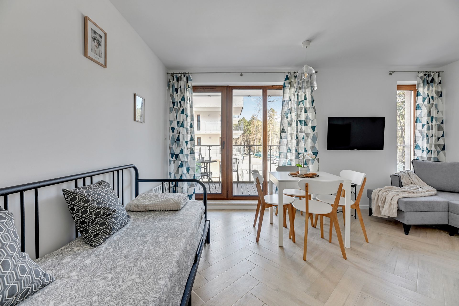 Oferujemy Państwu komfortowy apartament idealny na wakacyjny pobyt, zlokalizowany w nadmorskiej miejscowości Stegna. Apartament ma 24 m2 powierzchni i może nocować w nim do 4 osób. Otwarty salon połączono z aneksem kuchennym oraz wyjściem na taras, który przez większą część dnia skąpany jest w słońcu. W bocznych strefach studio umiejscowiono kanapę, która po rozłożeniu zmienia przestrzeń w część sypialną, oraz łóżko podwójne sypialniane. Część kuchenna to w pełni wyposażony aneks. Oprócz płyty grzewczej i lodówki znalazły się tam także mikrofalówka oraz czajnik. Dla naszych gości przygotowaliśmy także niezbędne naczynia, sztućce, kawę i herbatę. Na komfortowe zjedzenie posiłku pozwoli stół jadalniany. W upalne dni, możemy obniżyć temperaturę za sprawą klimatyzacji. Studio posiada własną łazienkę z prysznicem. Zapewniamy ręczniki i pościel. Akceptujemy zwierzęta domowe za dodatkową opłatą. Do apartamentu przynależy prywatne miejsce postojowe.