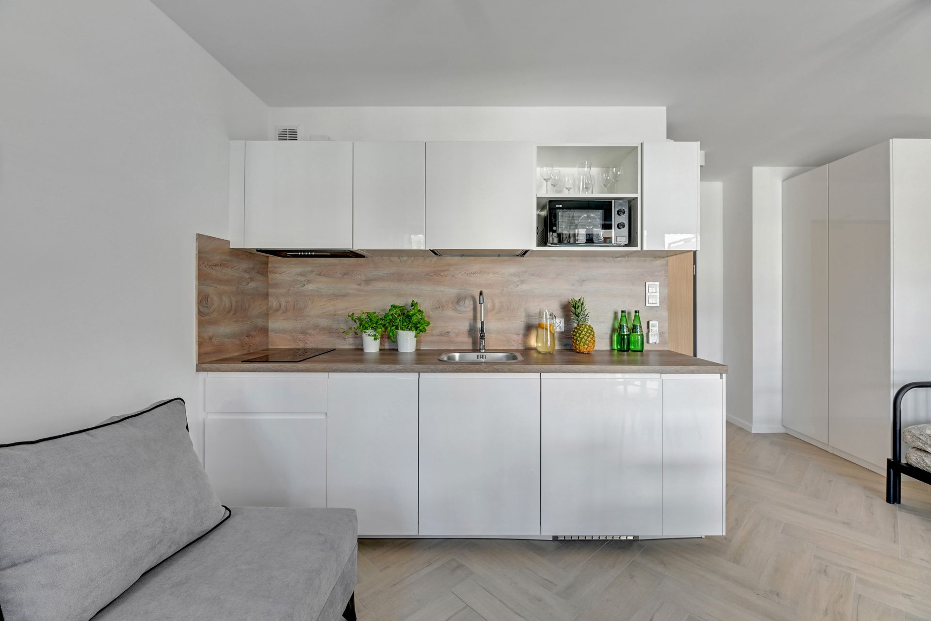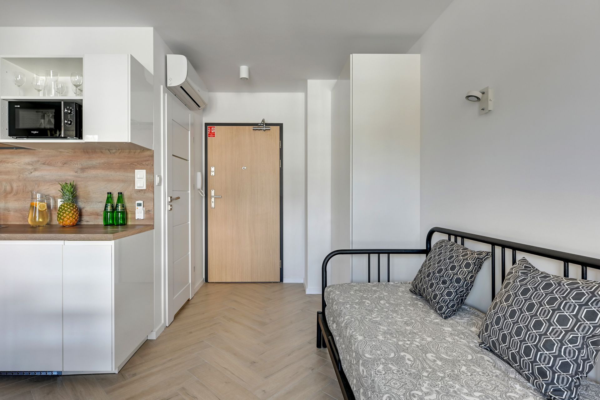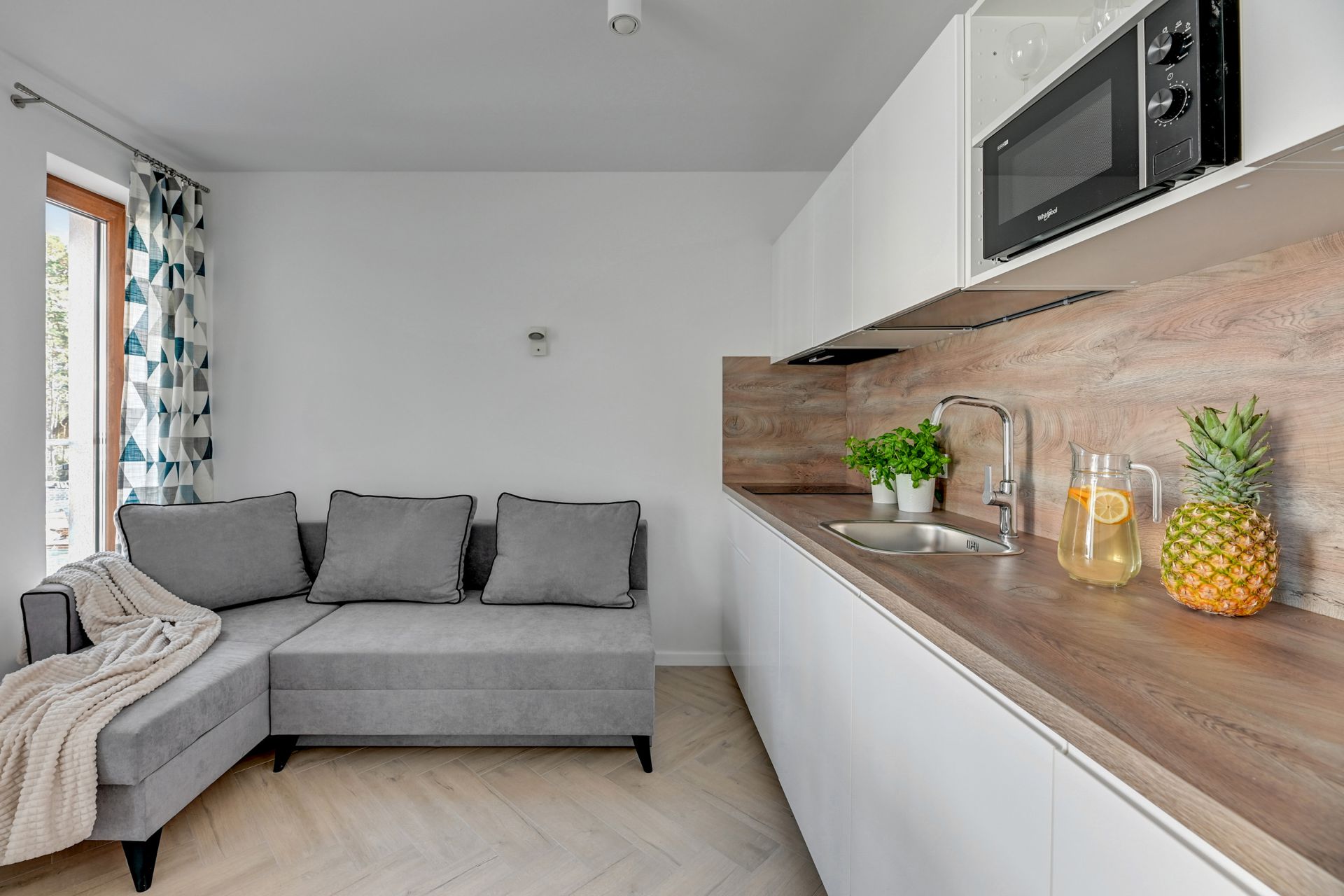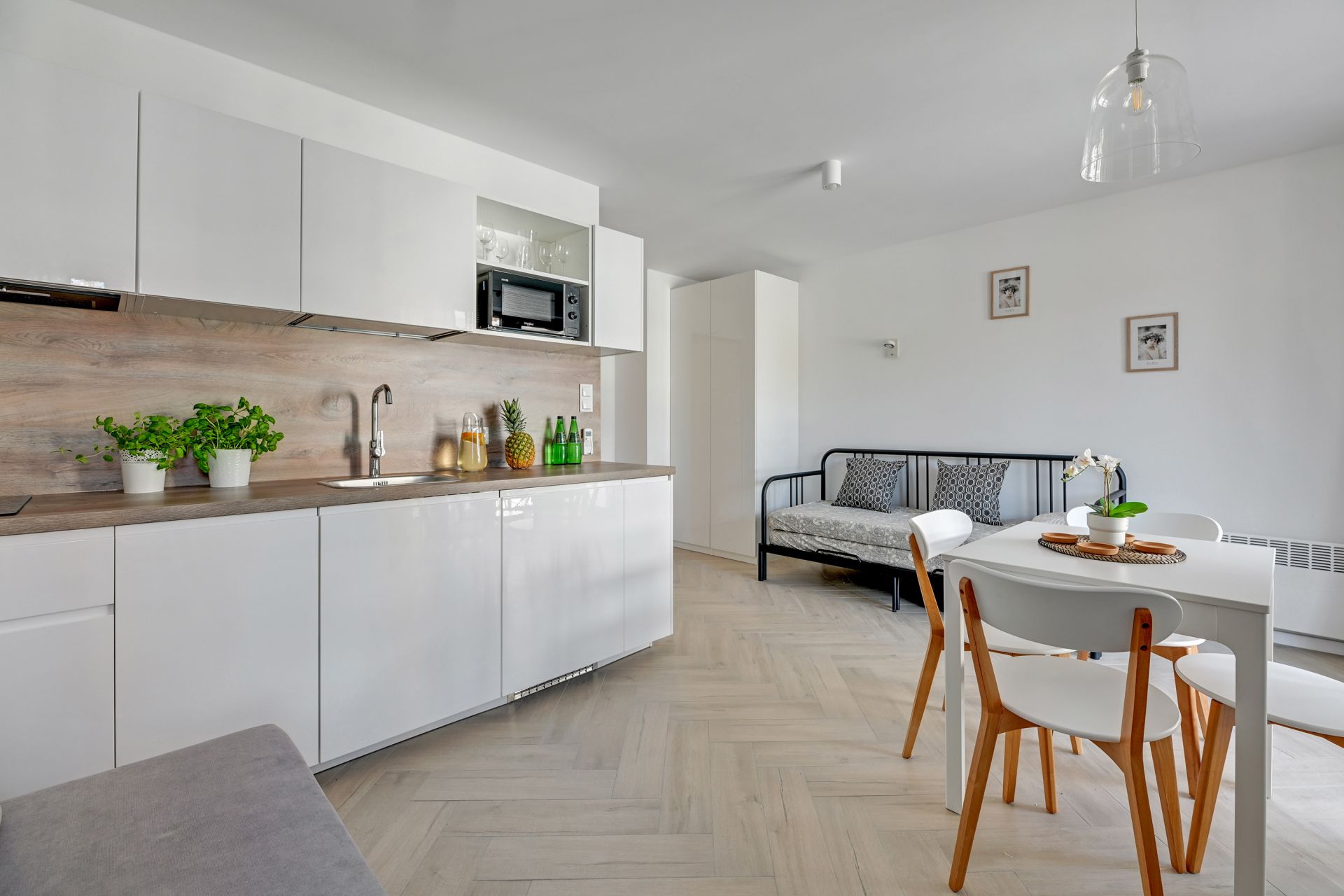 Oferujemy Państwu komfortowy apartament idealny na wakacyjny pobyt, zlokalizowany w nadmorskiej miejscowości Stegna. Apartament ma 24 m2 powierzchni i może nocować w nim do 4 osób. Otwarty salon połączono z aneksem kuchennym oraz wyjściem na taras, który przez większą część dnia skąpany jest w słońcu. W bocznych strefach studio umiejscowiono kanapę, która po rozłożeniu zmienia przestrzeń w część sypialną, oraz łóżko podwójne sypialniane. Część kuchenna to w pełni wyposażony aneks. Oprócz płyty grzewczej i lodówki znalazły się tam także mikrofalówka oraz czajnik. Dla naszych gości przygotowaliśmy także niezbędne naczynia, sztućce, kawę i herbatę. Na komfortowe zjedzenie posiłku pozwoli stół jadalniany. W upalne dni, możemy obniżyć temperaturę za sprawą klimatyzacji. Studio posiada własną łazienkę z prysznicem. Zapewniamy ręczniki i pościel. Akceptujemy zwierzęta domowe za dodatkową opłatą. Do apartamentu przynależy prywatne miejsce postojowe.