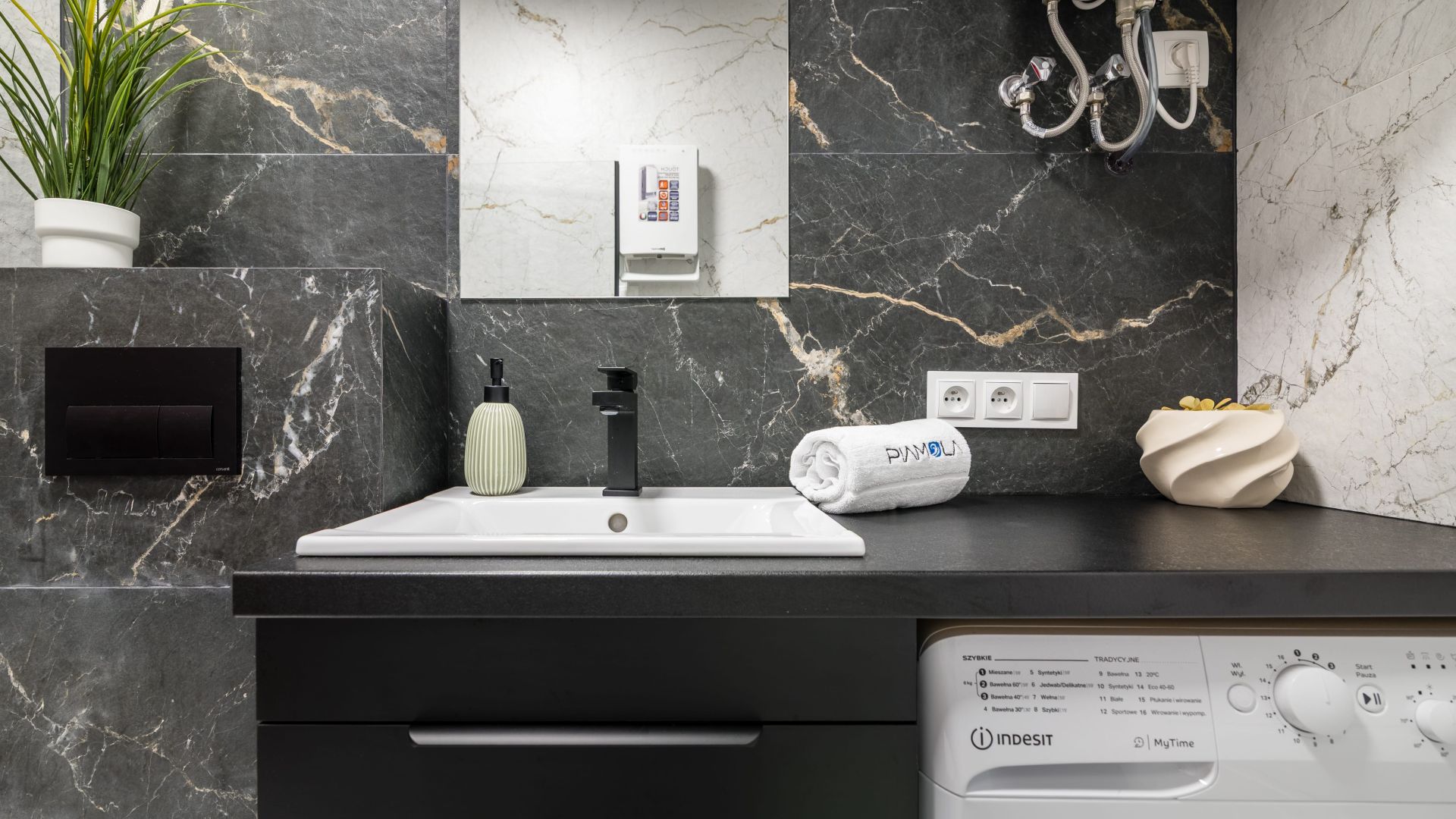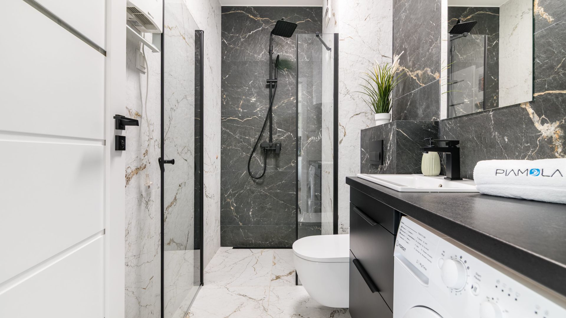 W łazience znajduje się kabina prysznicowa, pralka oraz suszarka do włosów.