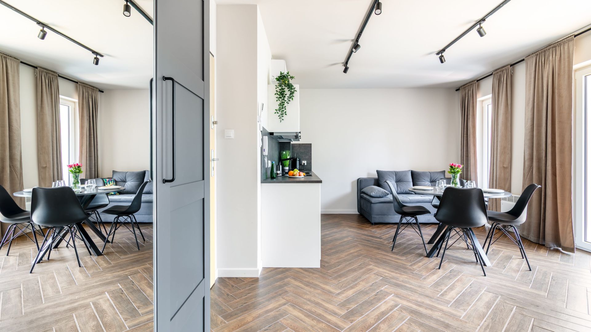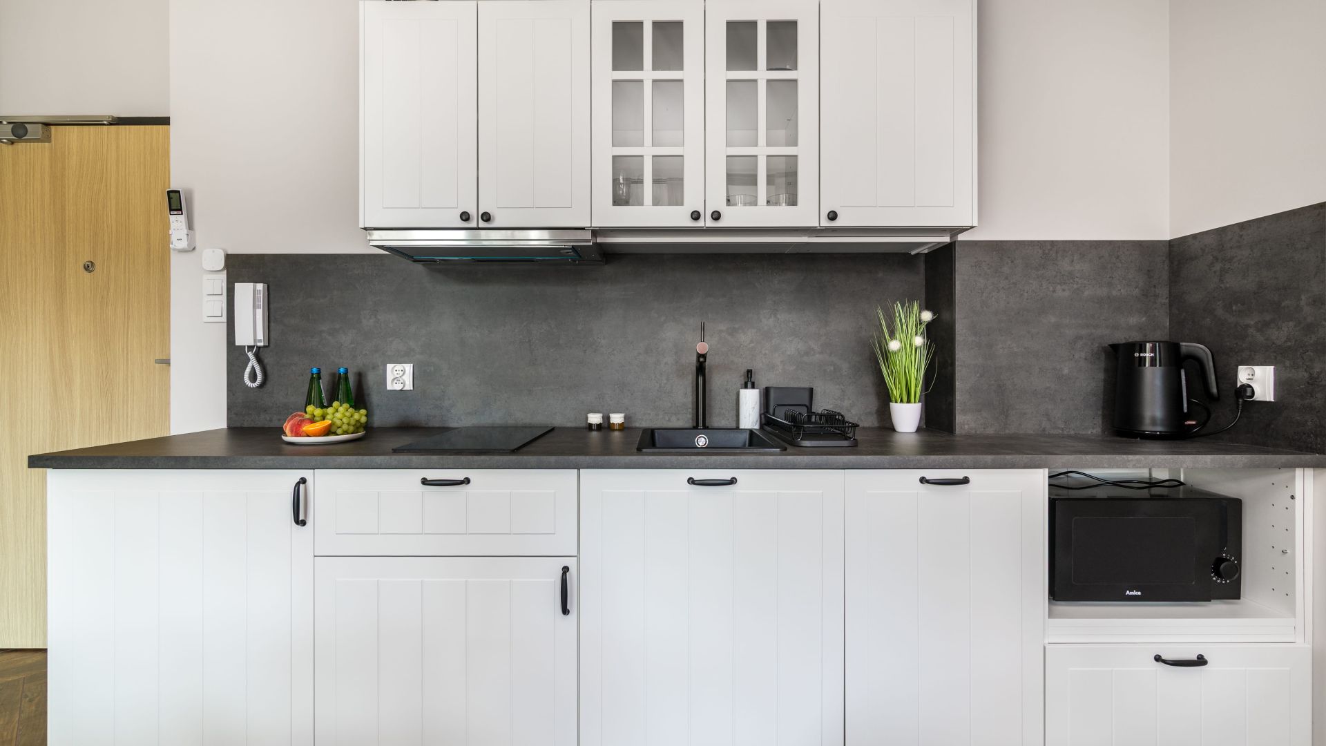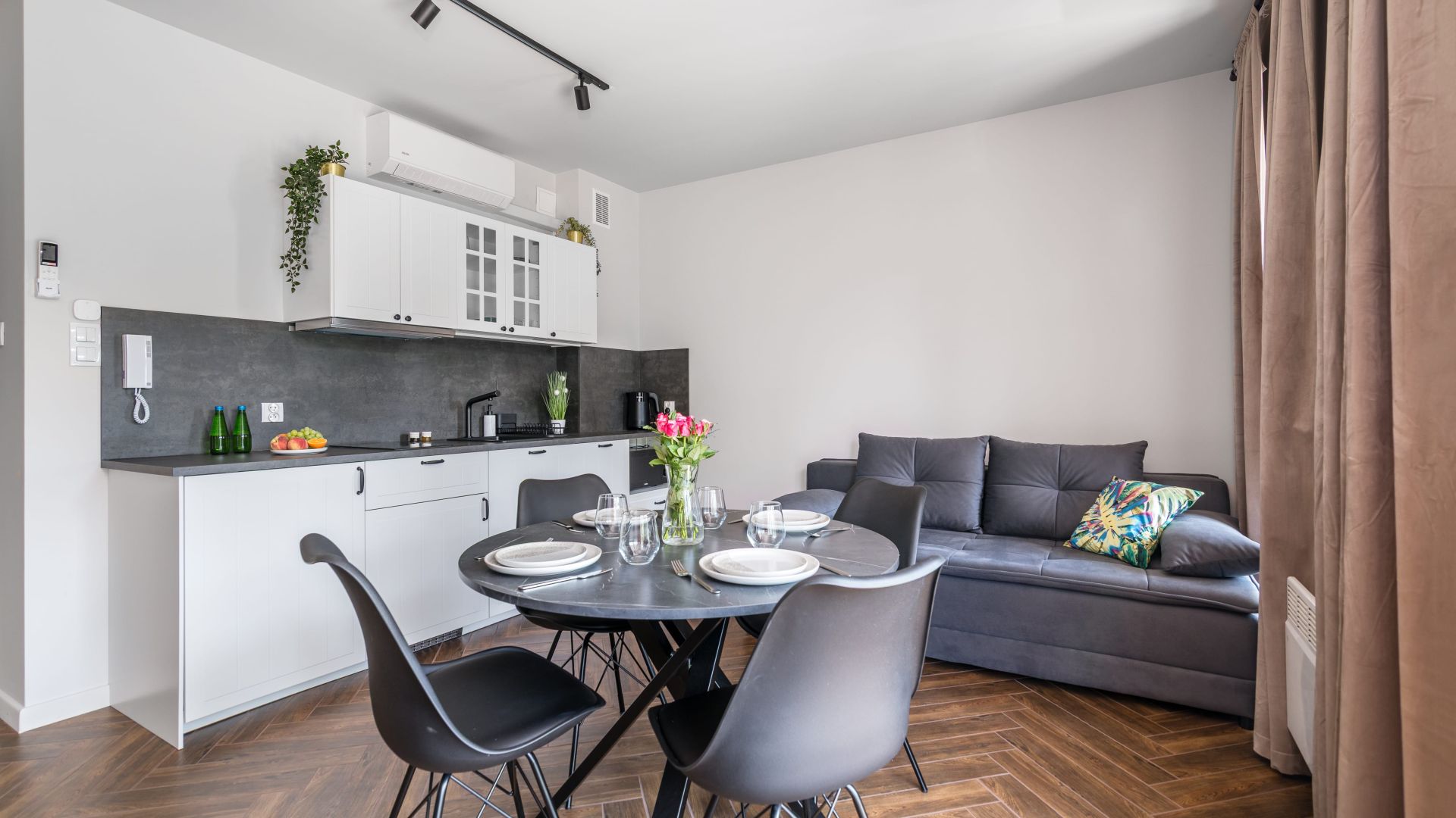 Aneks kuchenny wyposażony jest we wszystkie niezbędne sprzęty: lodówkę, kuchenkę mikrofalową, zmywarkę oraz akcesoria kuchenne, które pozwolą na komfortowe przygotowanie posiłków.