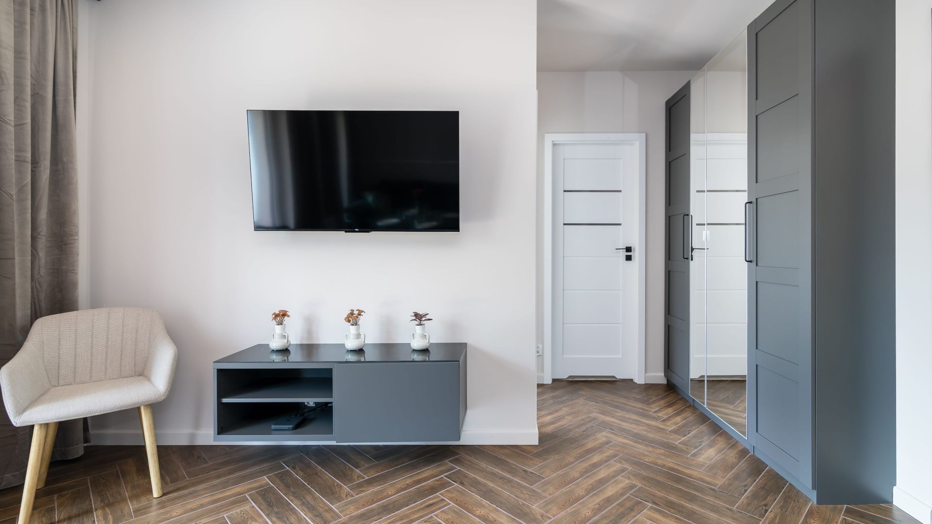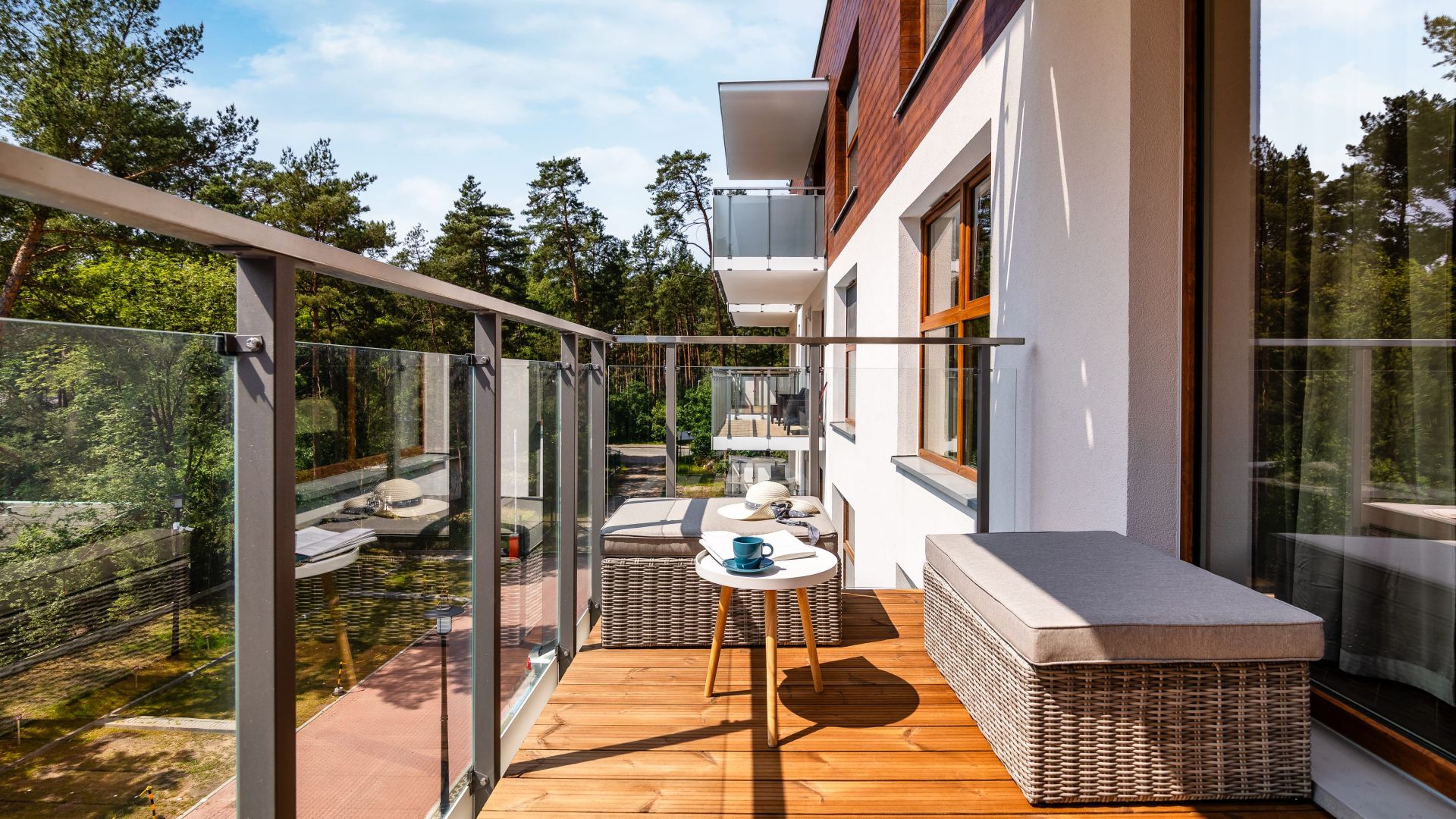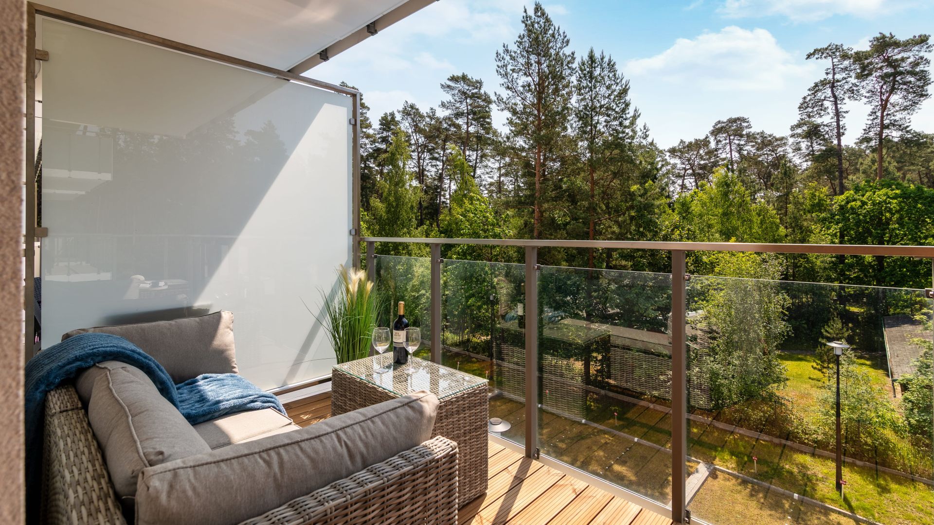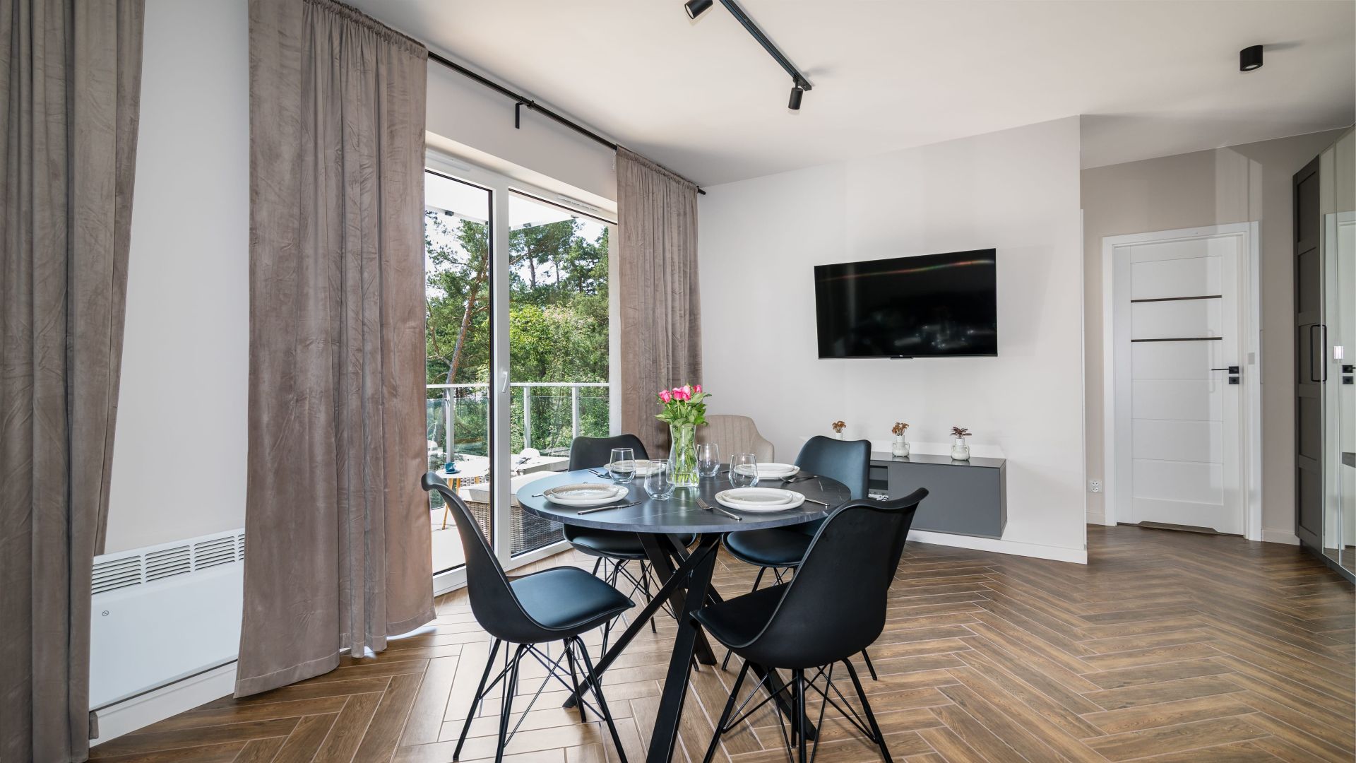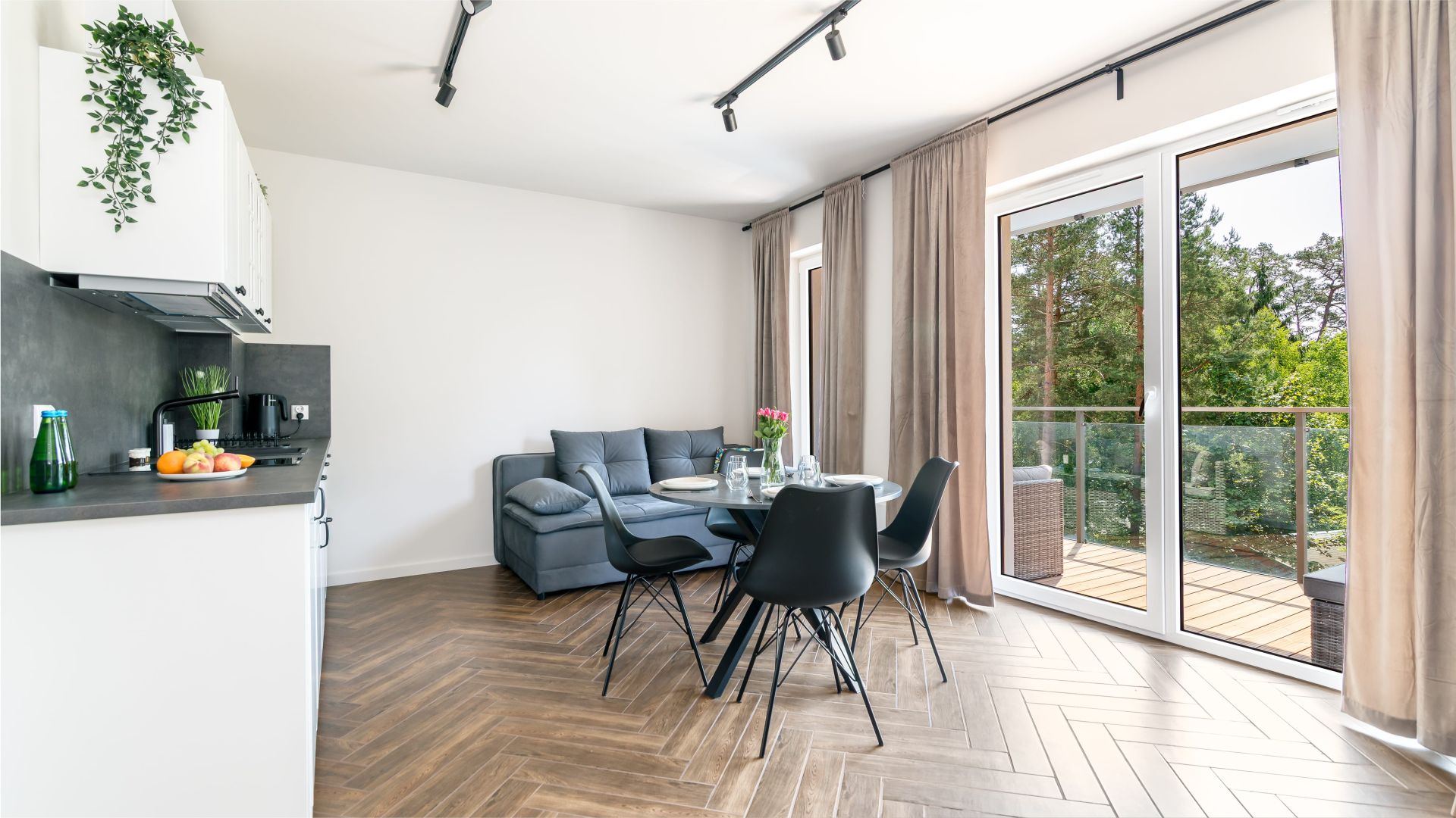 Apartament składa się z przestronnego salonu z aneksem kuchennym oraz wyjściem na balkon, z którego roztacza się piękny widok na las – idealne miejsce na poranną kawę lub wieczorny relaks.