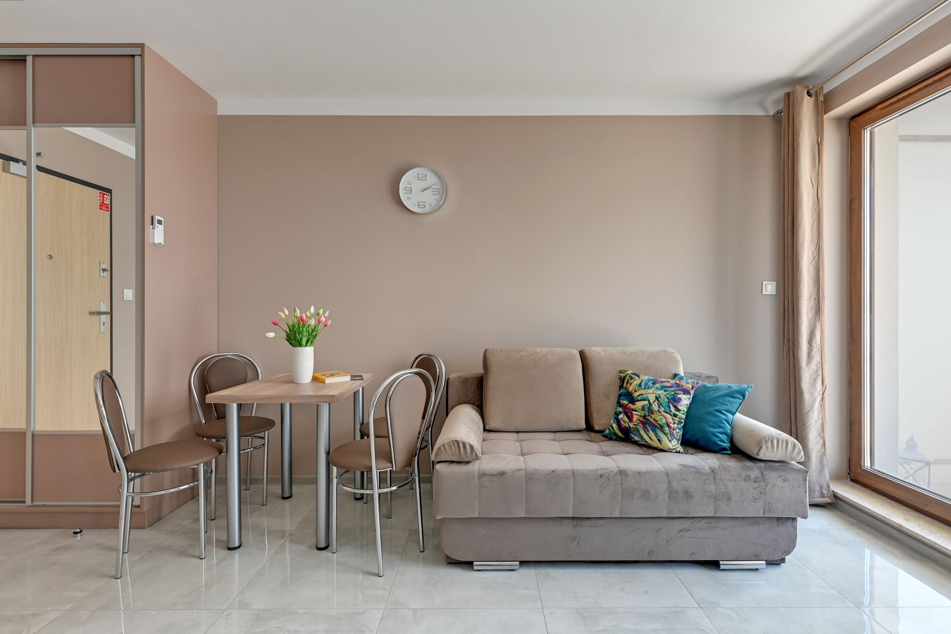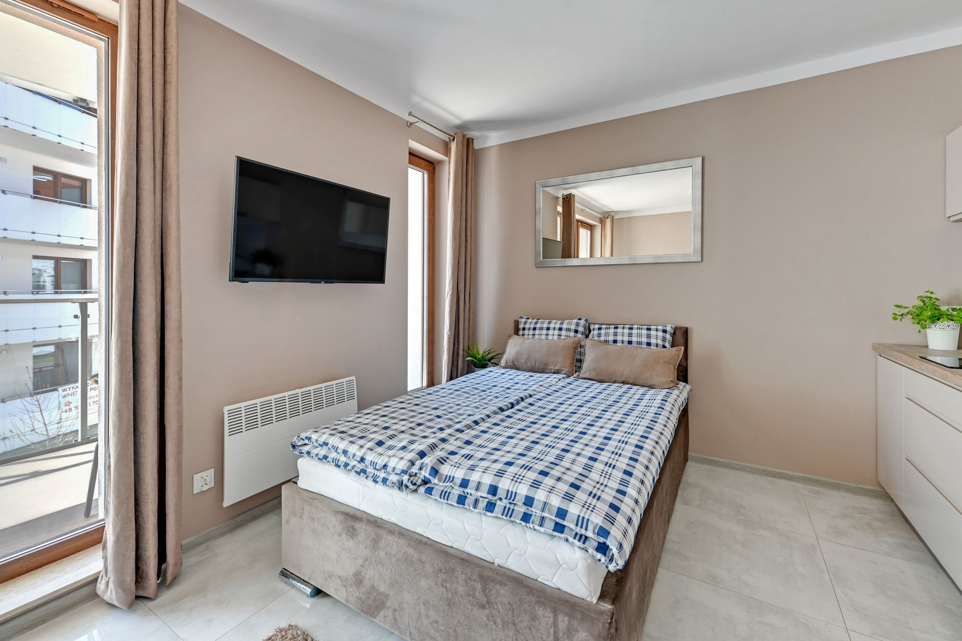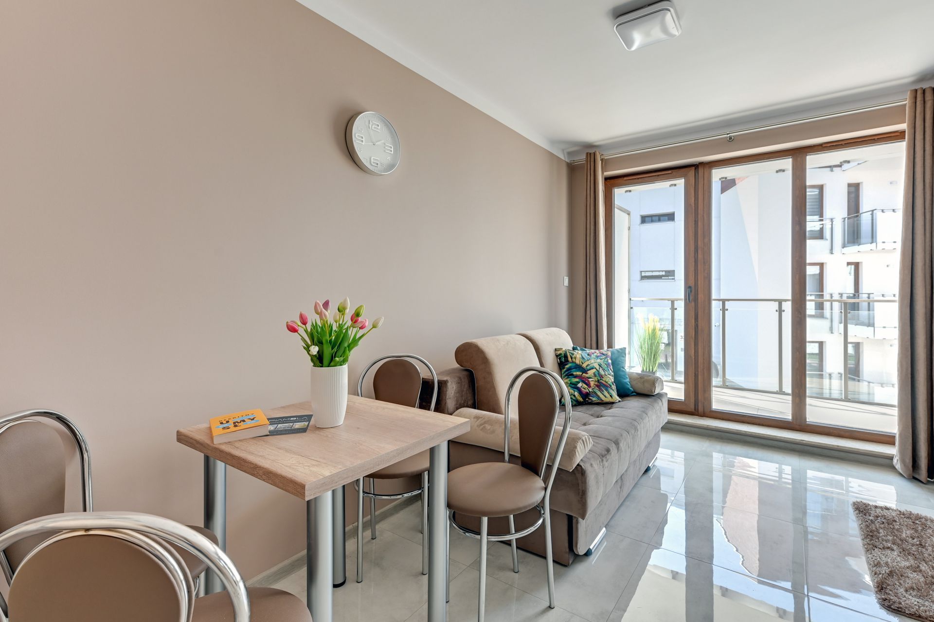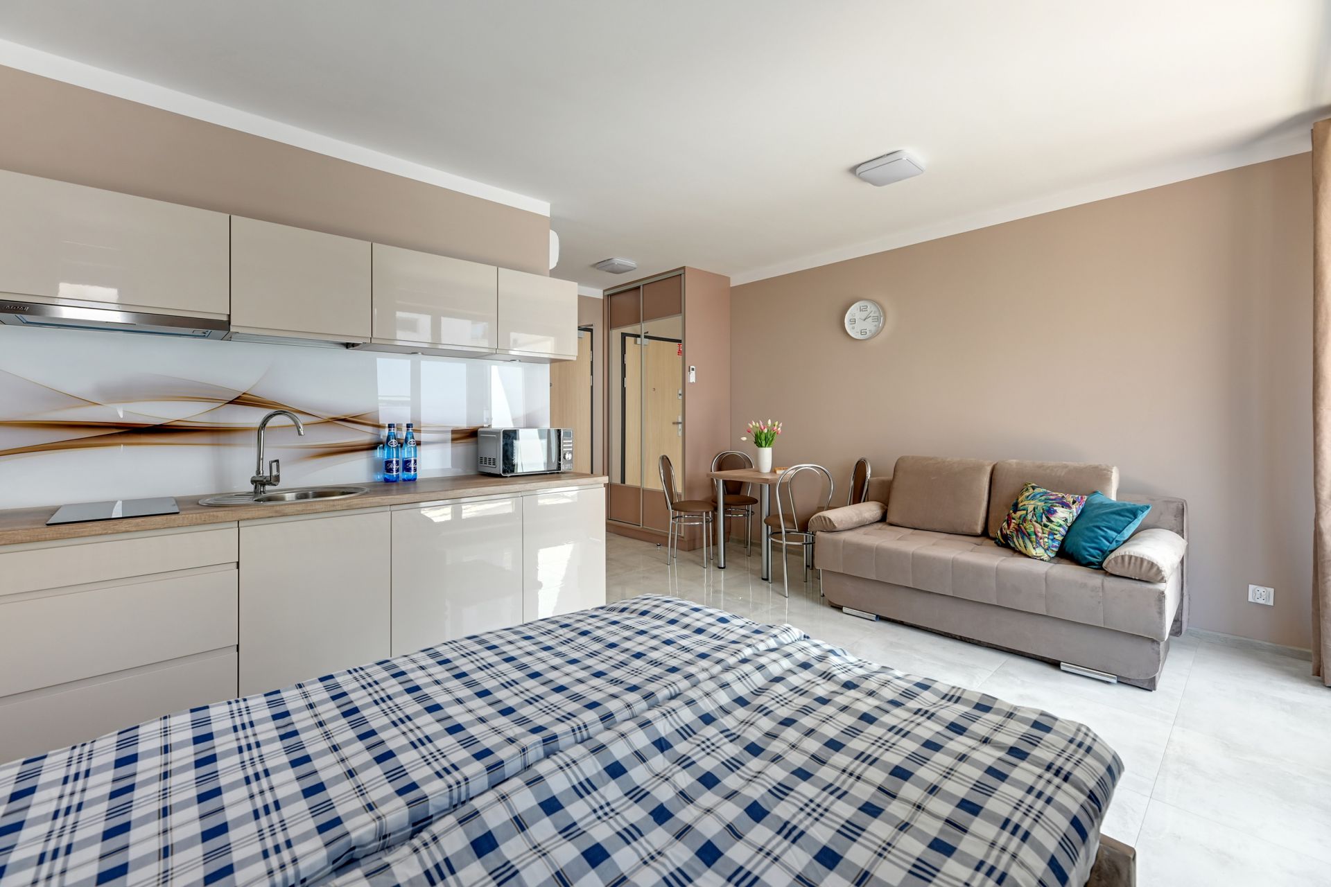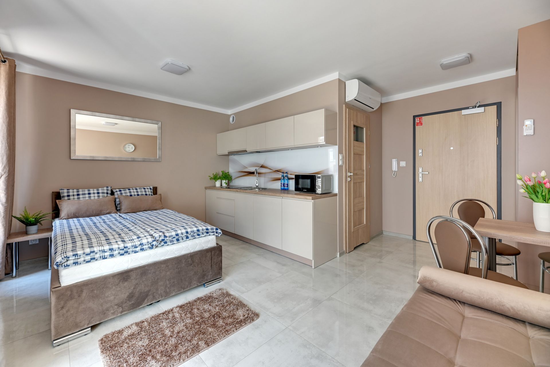 Oferujemy Państwu komfortowy apartament idealny na wakacyjny pobyt, zlokalizowany w nadmorskiej miejscowości Stegna. Apartament ma 24 m2 powierzchni i może nocować w nim do 3 osób. Otwarty salon połączono z aneksem kuchennym oraz wyjściem na taras, który przez większą część dnia skąpany jest w słońcu. W bocznych strefach studio umiejscowiono kanapę, która po rozłożeniu zmienia przestrzeń w część sypialną, oraz podwójne łóżko sypialniane. Część kuchenna to w pełni wyposażony aneks. Oprócz płyty grzewczej i lodówki znalazły się tam także mikrofalówka oraz czajnik. Dla naszych gości przygotowaliśmy także niezbędne naczynia, sztućce, kawę i herbatę. Na komfortowe zjedzenie posiłku pozwoli stół jadalniany. W upalne dni, możemy obniżyć temperaturę za sprawą klimatyzacji. Studio posiada własną łazienkę z prysznicem. Zapewniamy ręczniki i pościel. Akceptujemy zwierzęta domowe za dodatkową opłatą. Do apartamentu przynależy prywatne miejsce postojowe.