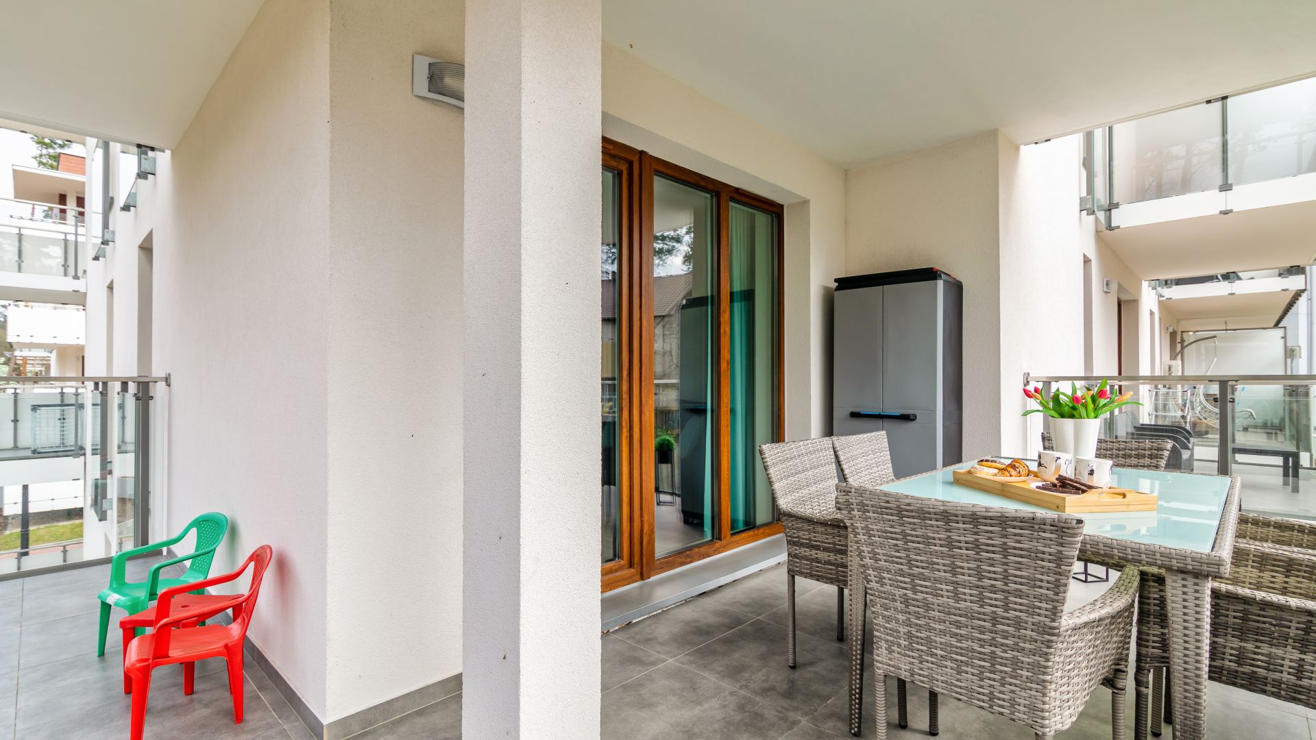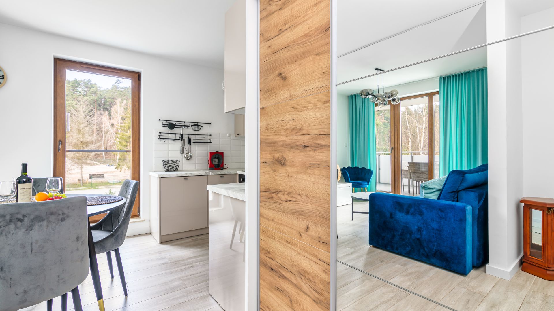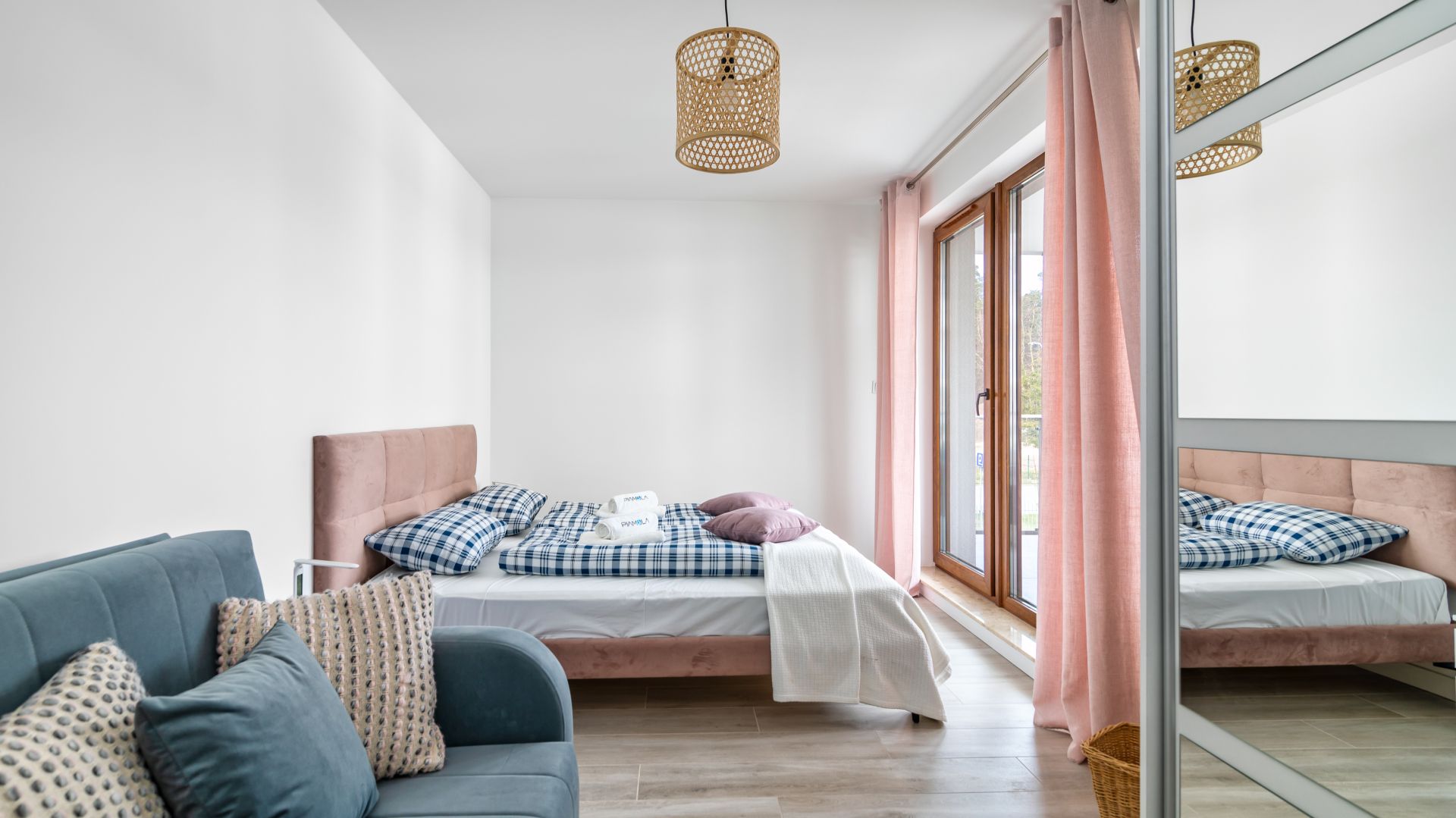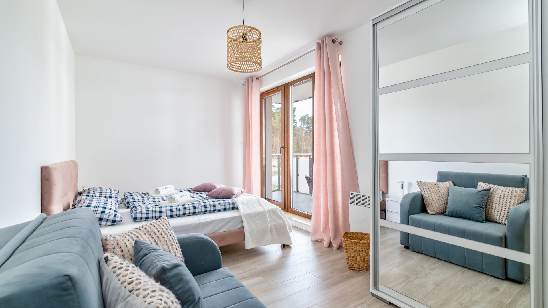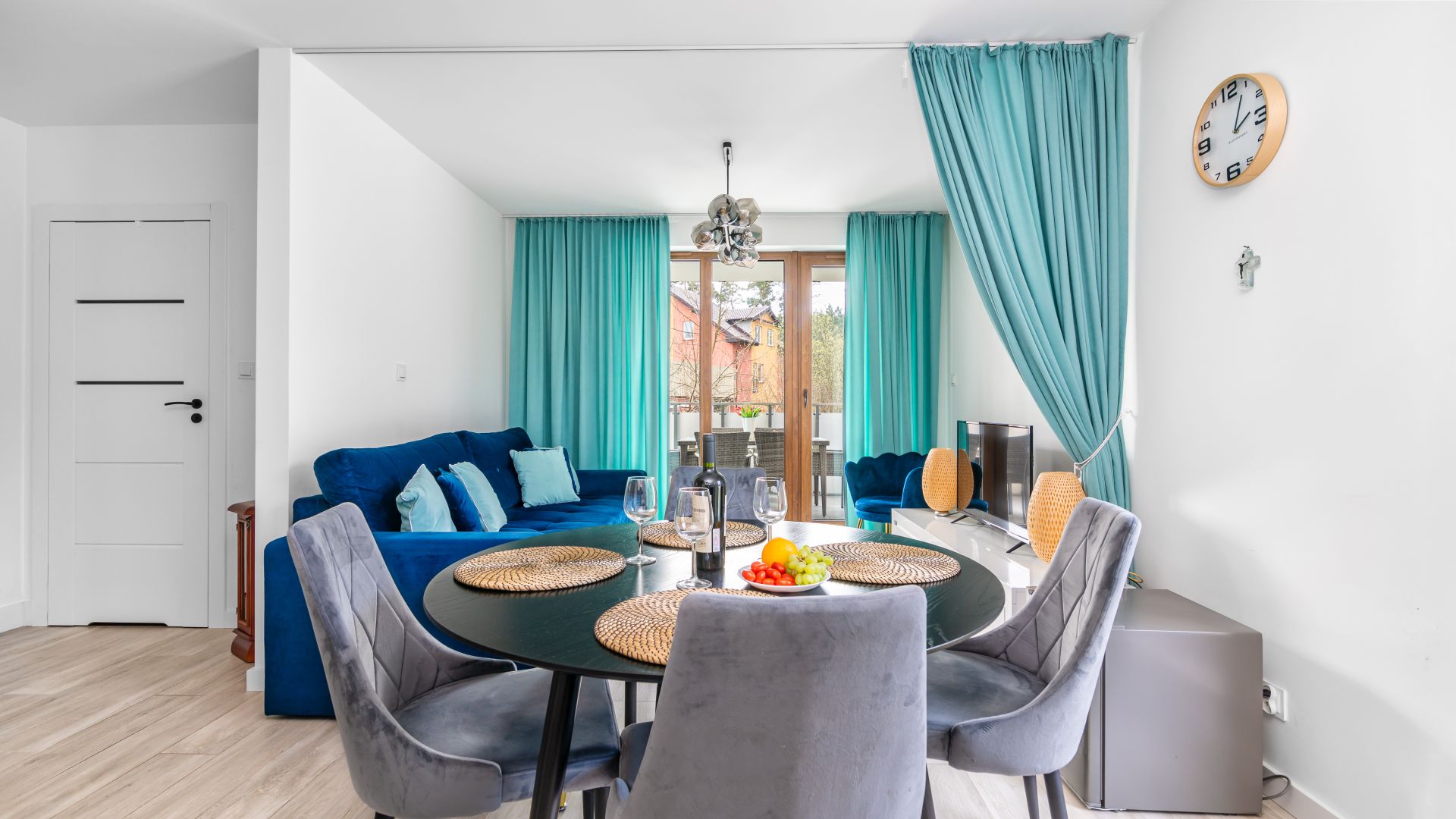 Otwarty salon połączono z aneksem kuchennym. W bocznych strefach studio umiejscowiono TV i wygodną sofę, która po rozłożeniu zmienia przestrzeń w część sypialną, gdzie mogą nocować dwie osoby. Z salonu możemy przejść na przestronny narożny taras, który przez większą część dnia skąpany jest w słońcu i posiada duży 6-osobowy stół przy którym możemy spożywać posiłki na świeżym powietrzu wsłuchując się w szum morskich fal. Część kuchenna to w pełni wyposażony aneks. Oprócz płyty grzewczej i lodówki znalazły się tam także czajnik, zmywarka, ekspres do kawy, frytownica i piekarnik. Dla naszych gości przygotowaliśmy także niezbędne naczynia, sztućce, kawę, herbatę oraz przyprawy. Na komfortowe zjedzenie posiłku pozwoli okrągły stół jadalniany. Studio posiada własną łazienkę z prysznicem, pralką. Lokal posiada również oddzielne pomieszczenie z dodatkowym wc. Pozostałą cześć apartamentu stanowią dwie sypialnie: mniejsza z łóżkiem rozkładanym, szafą do przechowywania ubrań oraz większą z szerokim na 180cm łóżkiem małżeńskim, dużą szafą oraz wyjściem na drugi wschodni taras, na którym możemy wygrzewać się przy porannym słońcu.