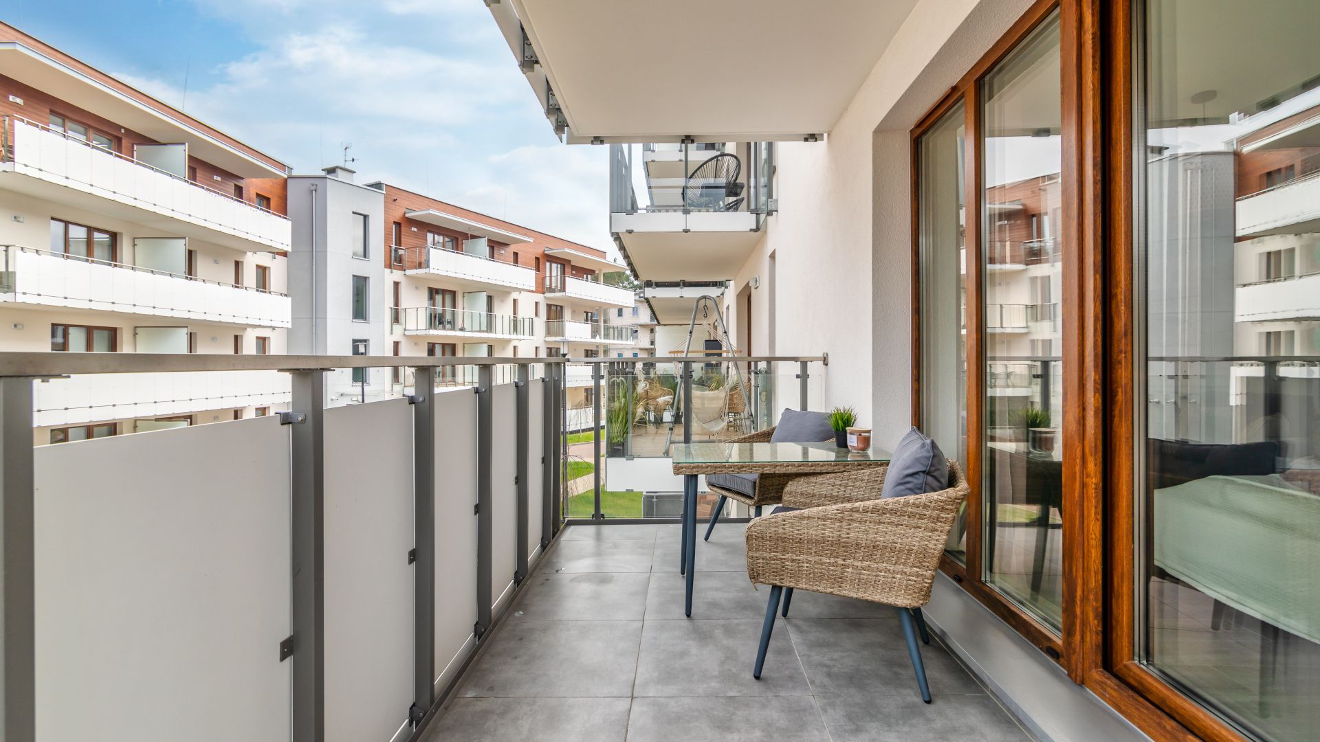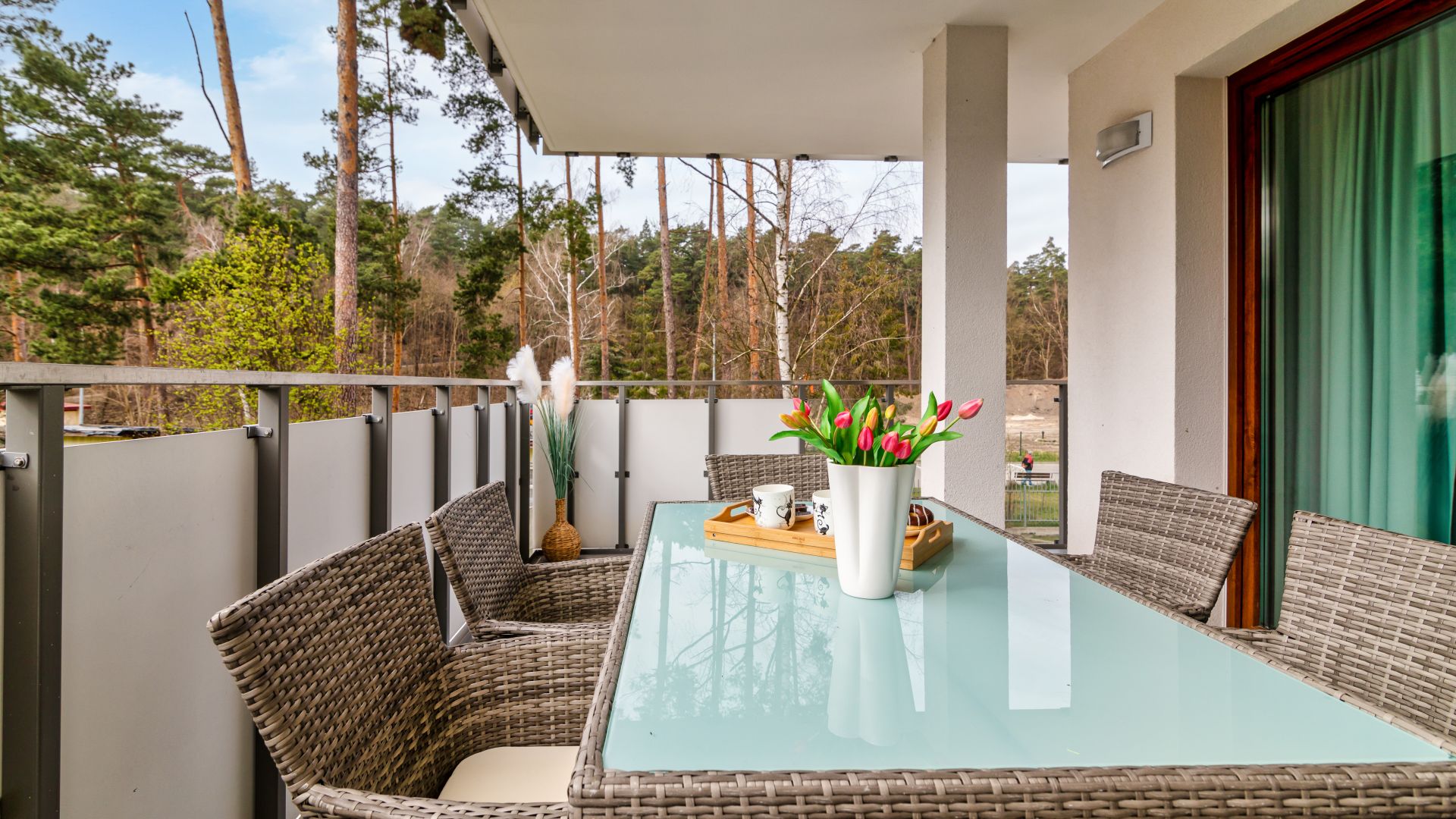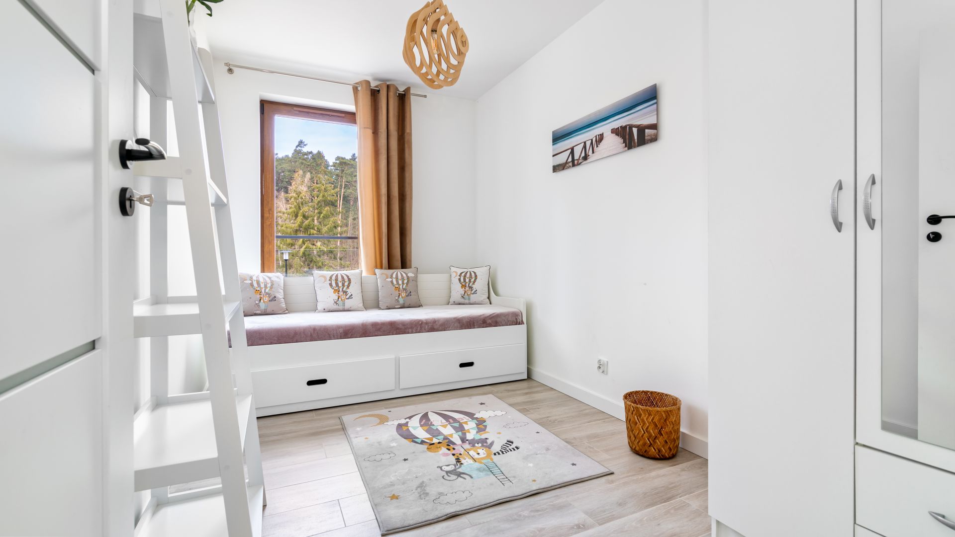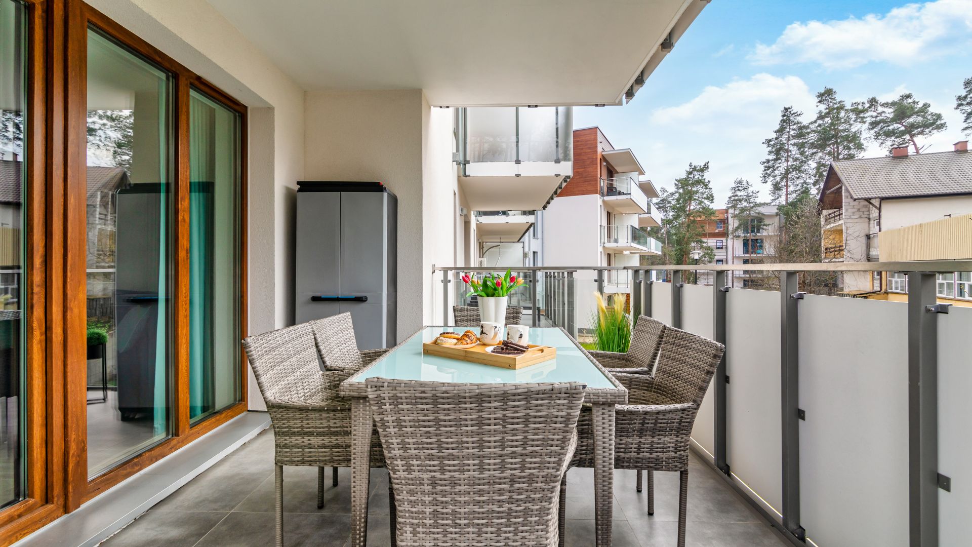 Otwarty salon połączono z aneksem kuchennym. W bocznych strefach studio umiejscowiono TV i wygodną sofę, która po rozłożeniu zmienia przestrzeń w część sypialną, gdzie mogą nocować dwie osoby. Z salonu możemy przejść na przestronny narożny taras, który przez większą część dnia skąpany jest w słońcu i posiada duży 6-osobowy stół przy którym możemy spożywać posiłki na świeżym powietrzu wsłuchując się w szum morskich fal. Część kuchenna to w pełni wyposażony aneks. Oprócz płyty grzewczej i lodówki znalazły się tam także czajnik, zmywarka, ekspres do kawy, frytownica i piekarnik. Dla naszych gości przygotowaliśmy także niezbędne naczynia, sztućce, kawę, herbatę oraz przyprawy. Na komfortowe zjedzenie posiłku pozwoli okrągły stół jadalniany. Studio posiada własną łazienkę z prysznicem, pralką. Lokal posiada również oddzielne pomieszczenie z dodatkowym wc. Pozostałą cześć apartamentu stanowią dwie sypialnie: mniejsza z łóżkiem rozkładanym, szafą do przechowywania ubrań oraz większą z szerokim na 180cm łóżkiem małżeńskim, dużą szafą oraz wyjściem na drugi wschodni taras, na którym możemy wygrzewać się przy porannym słońcu.