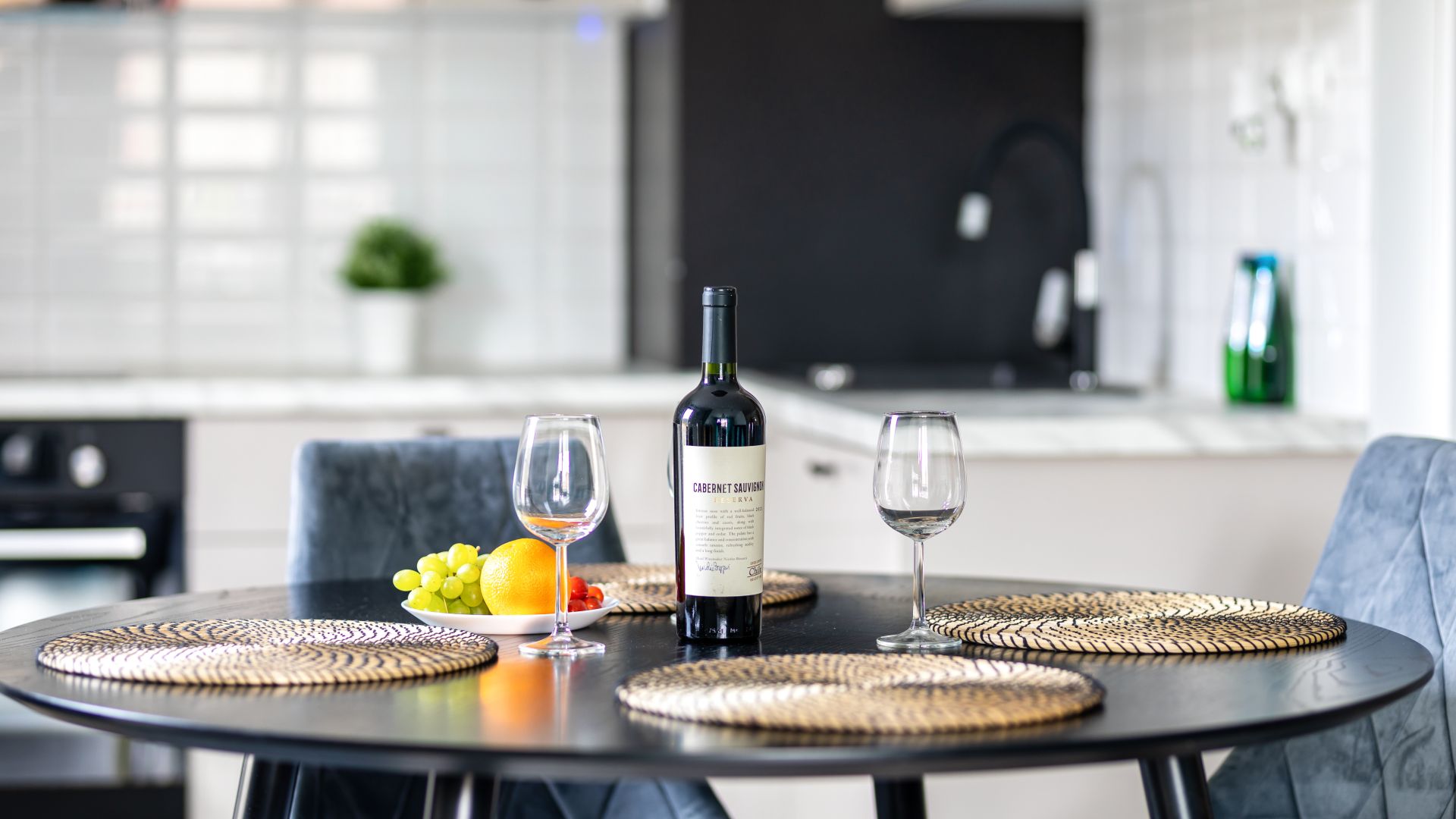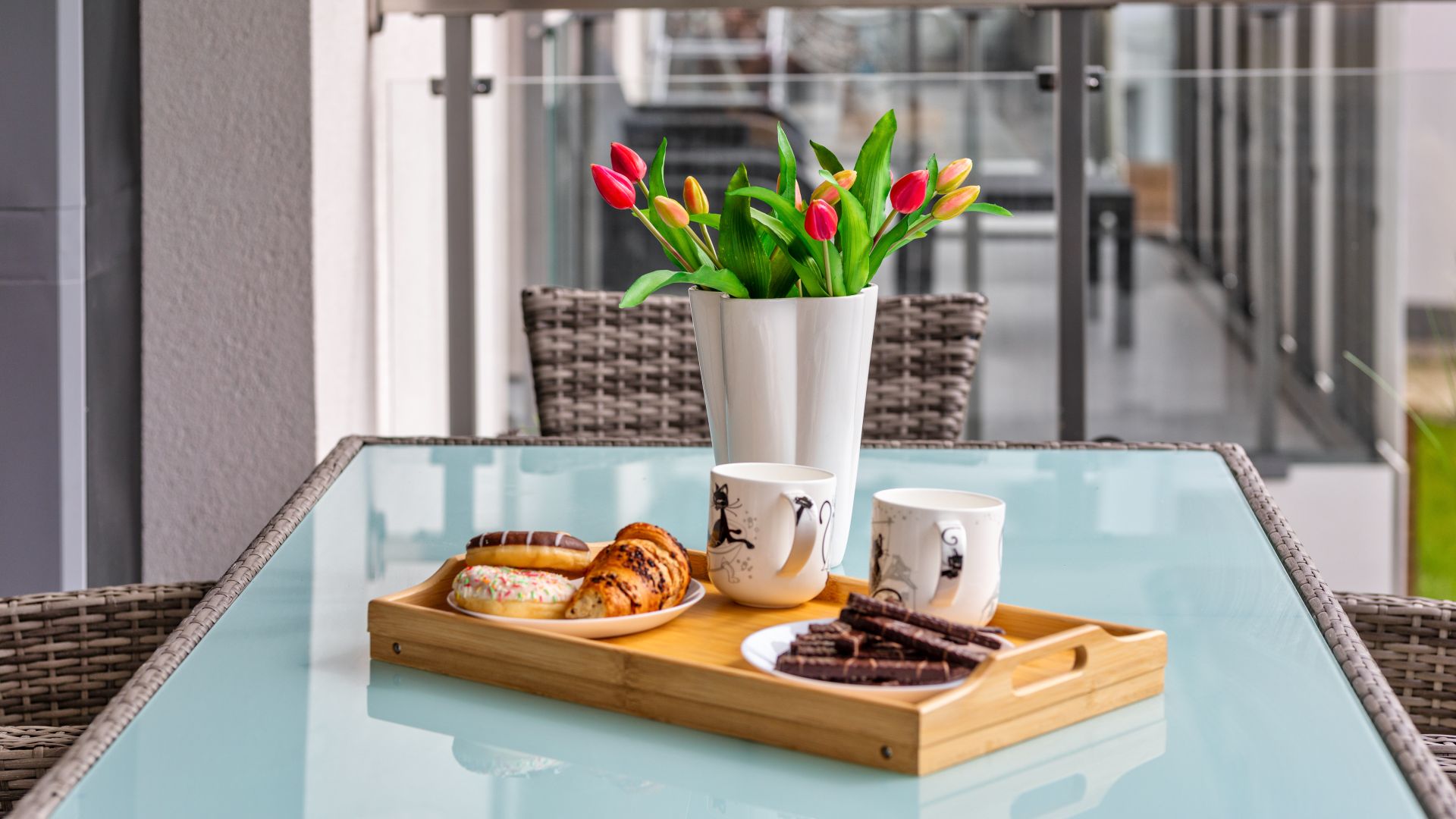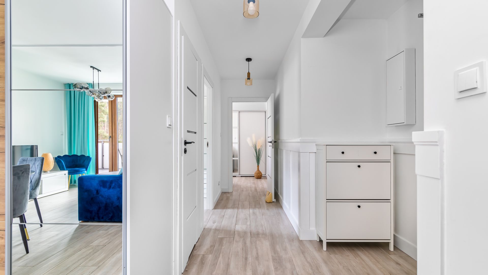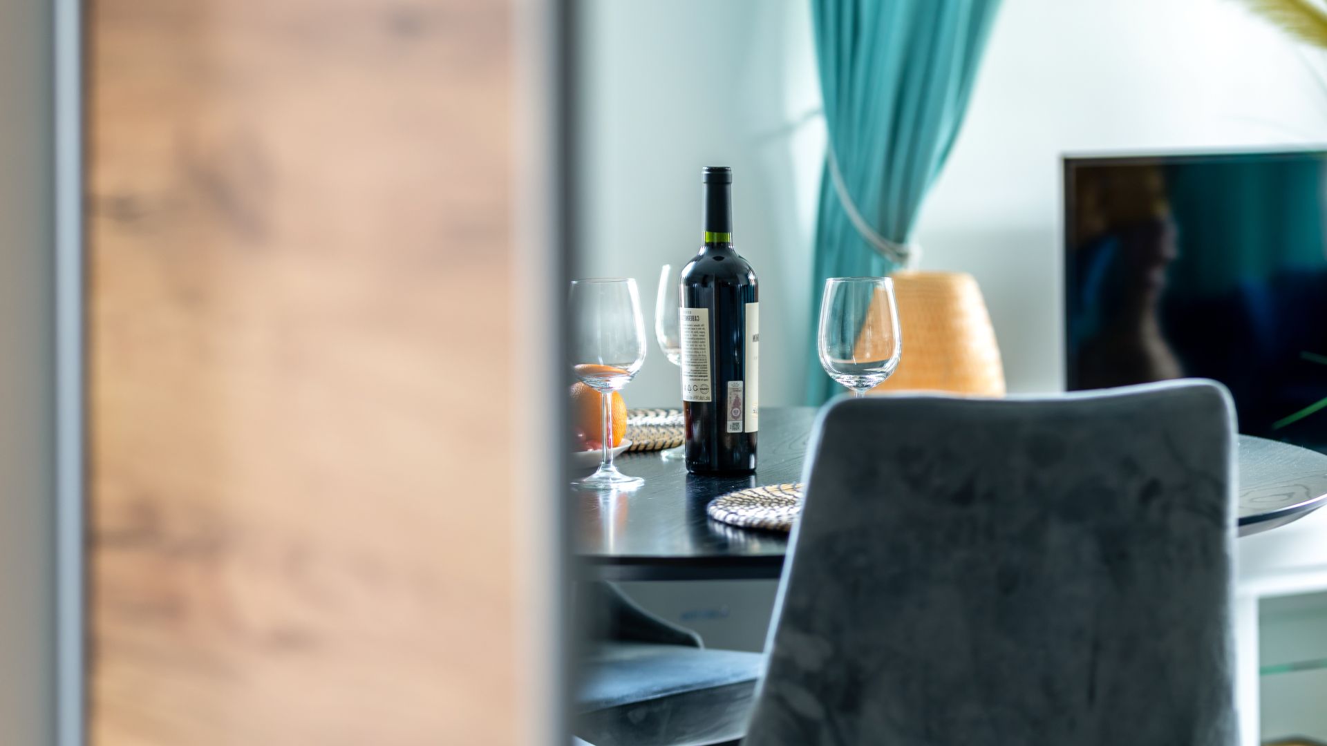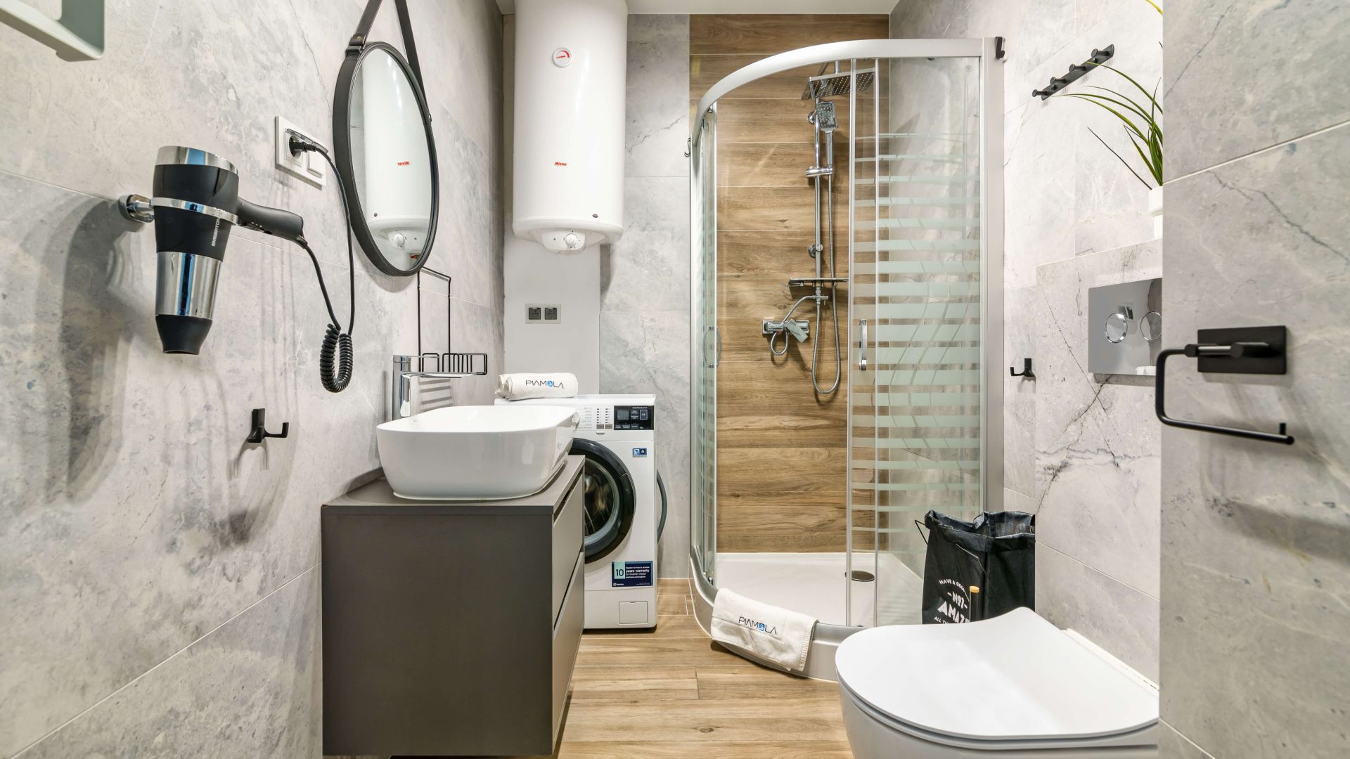 Otwarty salon połączono z aneksem kuchennym. W bocznych strefach studio umiejscowiono TV i wygodną sofę, która po rozłożeniu zmienia przestrzeń w część sypialną, gdzie mogą nocować dwie osoby. Z salonu możemy przejść na przestronny narożny taras, który przez większą część dnia skąpany jest w słońcu i posiada duży 6-osobowy stół przy którym możemy spożywać posiłki na świeżym powietrzu wsłuchując się w szum morskich fal. Część kuchenna to w pełni wyposażony aneks. Oprócz płyty grzewczej i lodówki znalazły się tam także czajnik, zmywarka, ekspres do kawy, frytownica i piekarnik. Dla naszych gości przygotowaliśmy także niezbędne naczynia, sztućce, kawę, herbatę oraz przyprawy. Na komfortowe zjedzenie posiłku pozwoli okrągły stół jadalniany. Studio posiada własną łazienkę z prysznicem, pralką. Lokal posiada również oddzielne pomieszczenie z dodatkowym wc. Pozostałą cześć apartamentu stanowią dwie sypialnie: mniejsza z łóżkiem rozkładanym, szafą do przechowywania ubrań oraz większą z szerokim na 180cm łóżkiem małżeńskim, dużą szafą oraz wyjściem na drugi wschodni taras, na którym możemy wygrzewać się przy porannym słońcu.