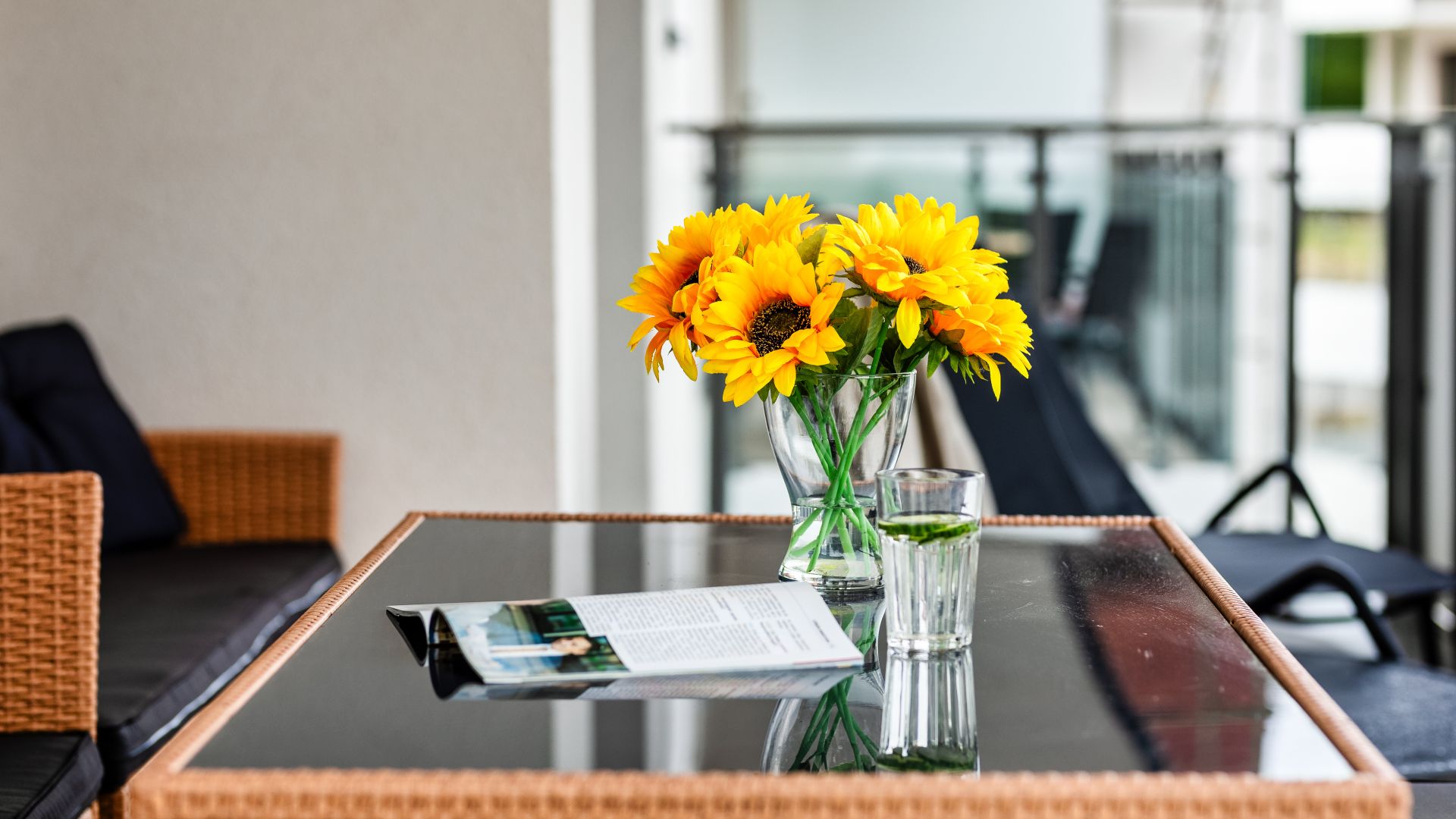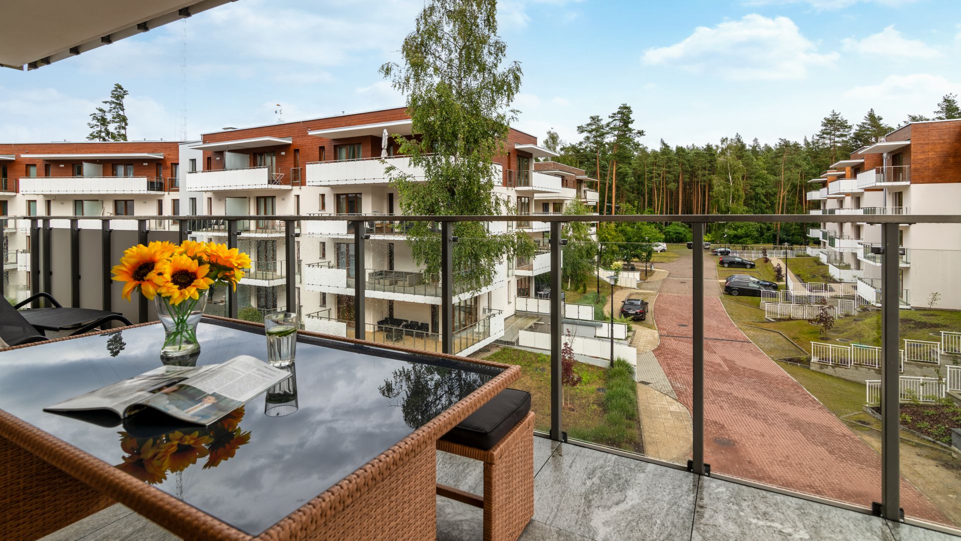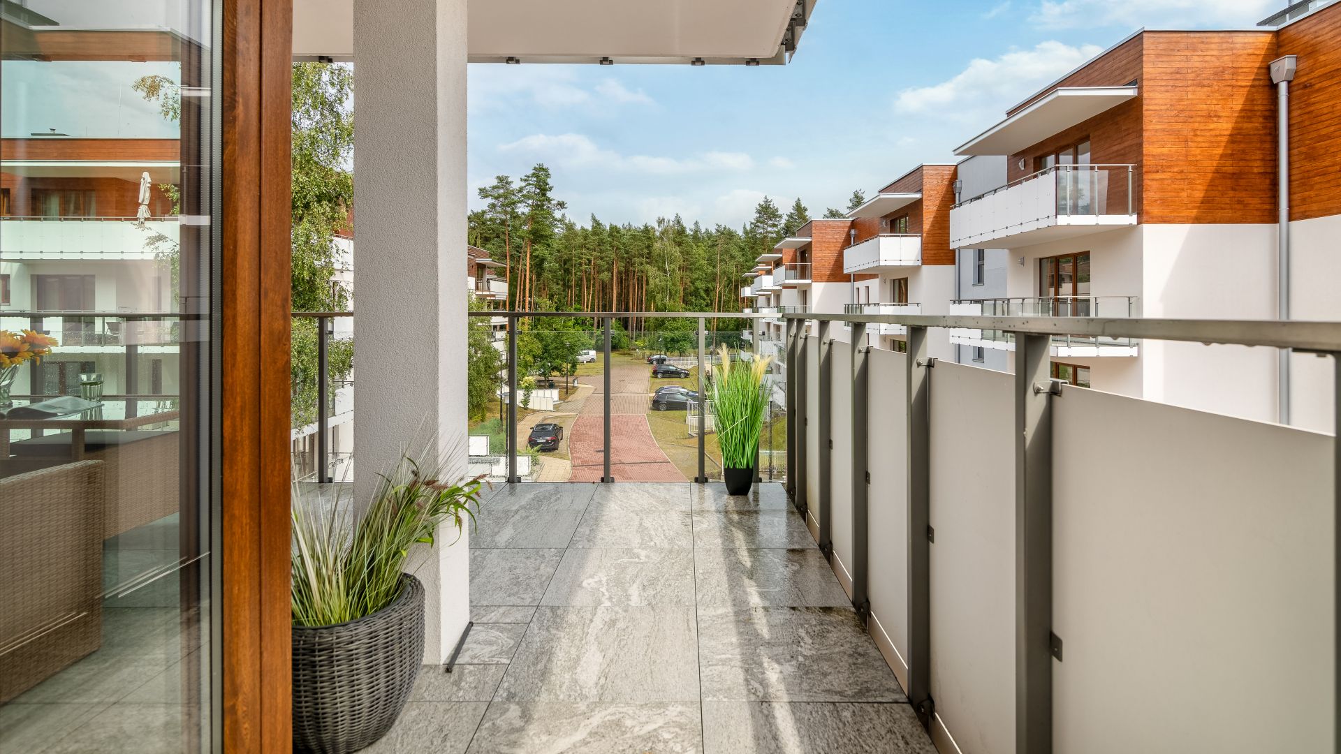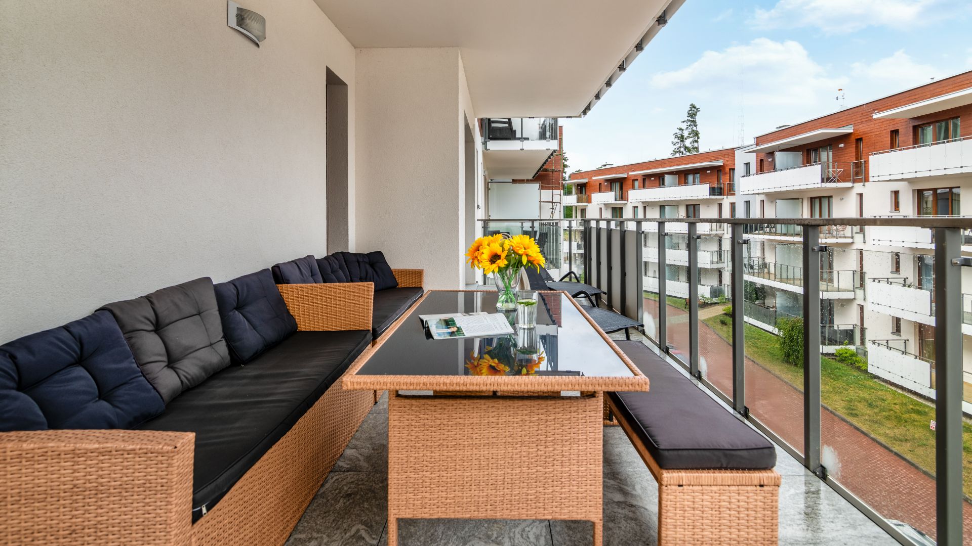 Z salonu prowadzi wejście na balkon, na którym znajdują się meble ogrodowe, idealne do relaksu po dniu pełnym przygód.