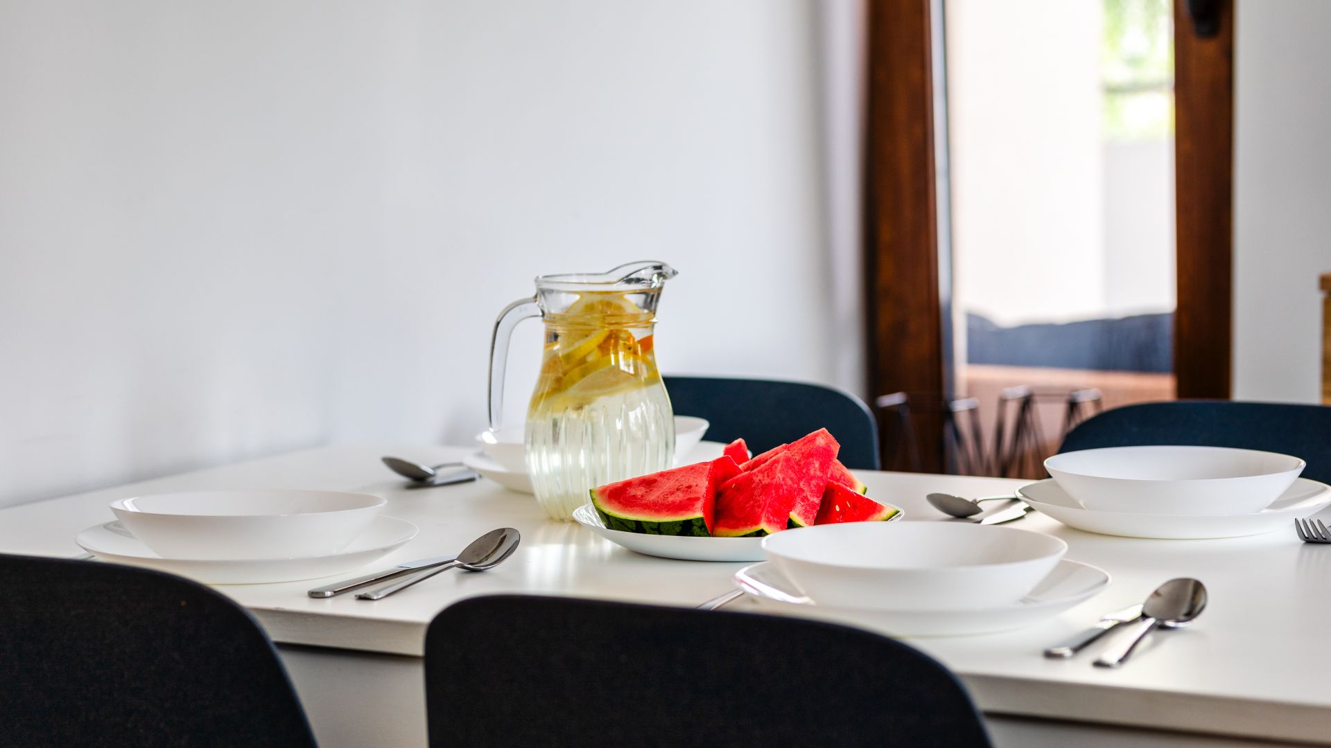W salonie znajduje się aneks kuchenny, wyposażony we wszystko, czego potrzebujesz do przygotowania posiłków, w tym lodówkę, zmywarkę, piekarnik, mikrofalówkę, czajnik elektryczny, a także sztućce i talerze. Salon jest również wyposażony w rozkładaną sofę, która może pomieścić dwie osoby do spania. Dla Twojej wygody, salon jest wyposażony w telewizor, dostęp do Wi-Fi oraz klimatyzację w całym apartamencie.