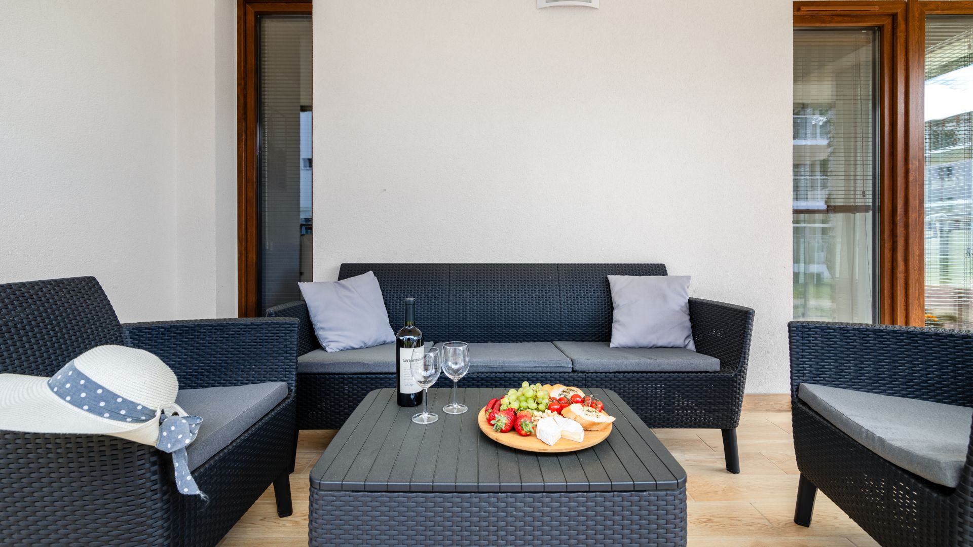 W apartamencie znajdziesz wszystko, co potrzebne do komfortowego pobytu. Jest tu wi-fi, telewizor, klimatyzacja, pralka, suszarka do włosów, mikrofalówka, zmywarka i wszystkie niezbędne akcesoria kuchenne. Kuchnia jest połączona z salonem, gdzie znajdują się dwie rozkładane sofy i stolik kawowy. W sypialni jest duże, podwójne łóżko i szafa. Łazienka jest przestronna i elegancka, z kabiną prysznicową i umywalką. Z balkonu roztacza się piękny widok na zielone otoczenie.