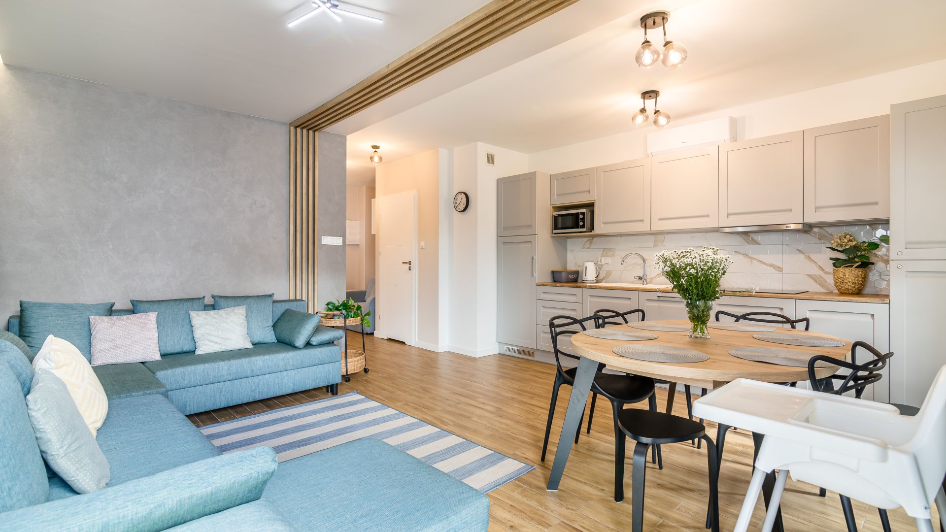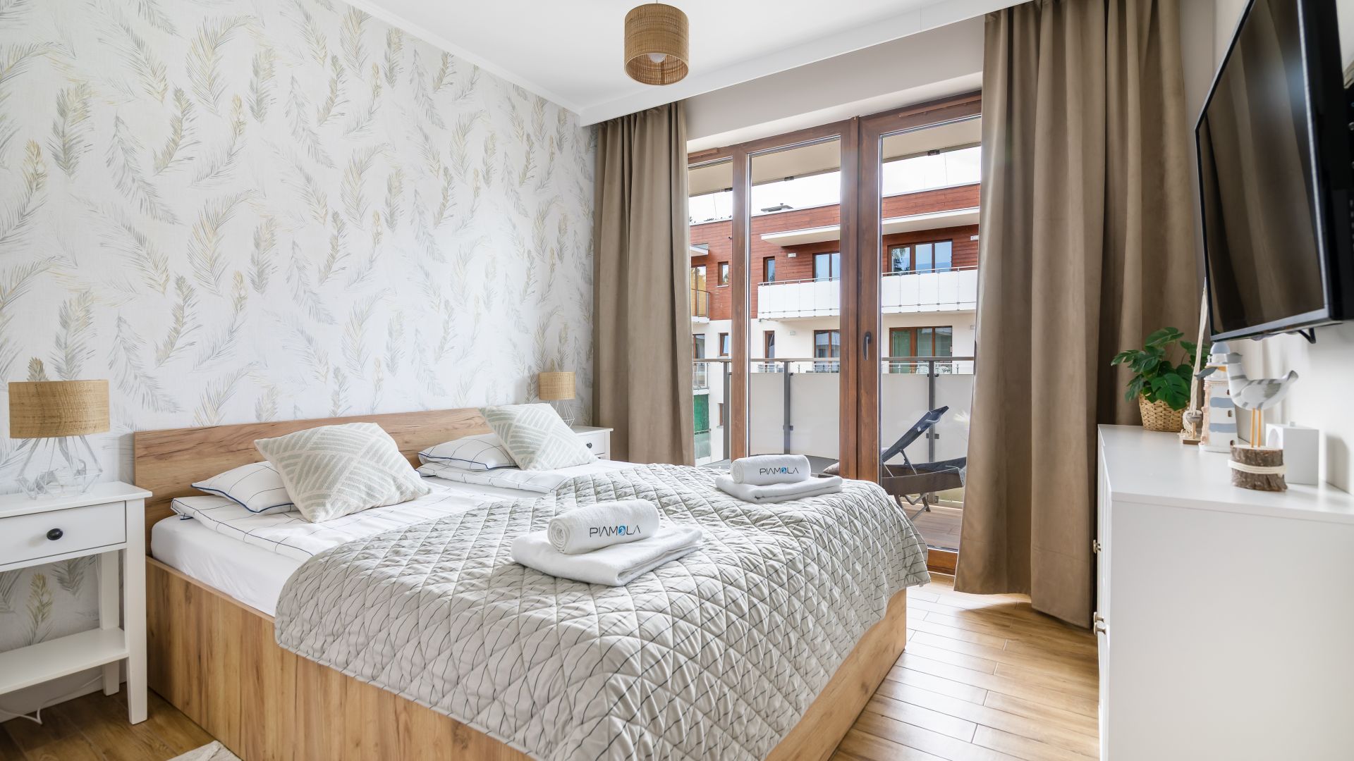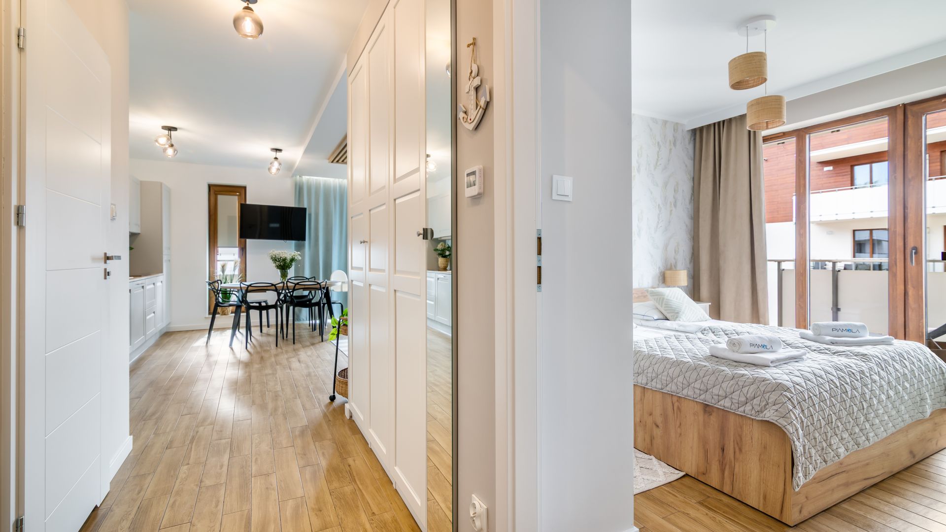 Apartament składa się z przytulnej sypialni oraz jasnego salonu z aneksem kuchennym wyposażonym w niezbędne akcesoria, które umożliwią przygotowanie domowych posiłków. Na Gości czekają także udogodnienia zapewniające pełen komfort: bezpłatne Wi-Fi, klimatyzacja oraz nieodpłatne krzesełko do karmienia dla najmłodszych.