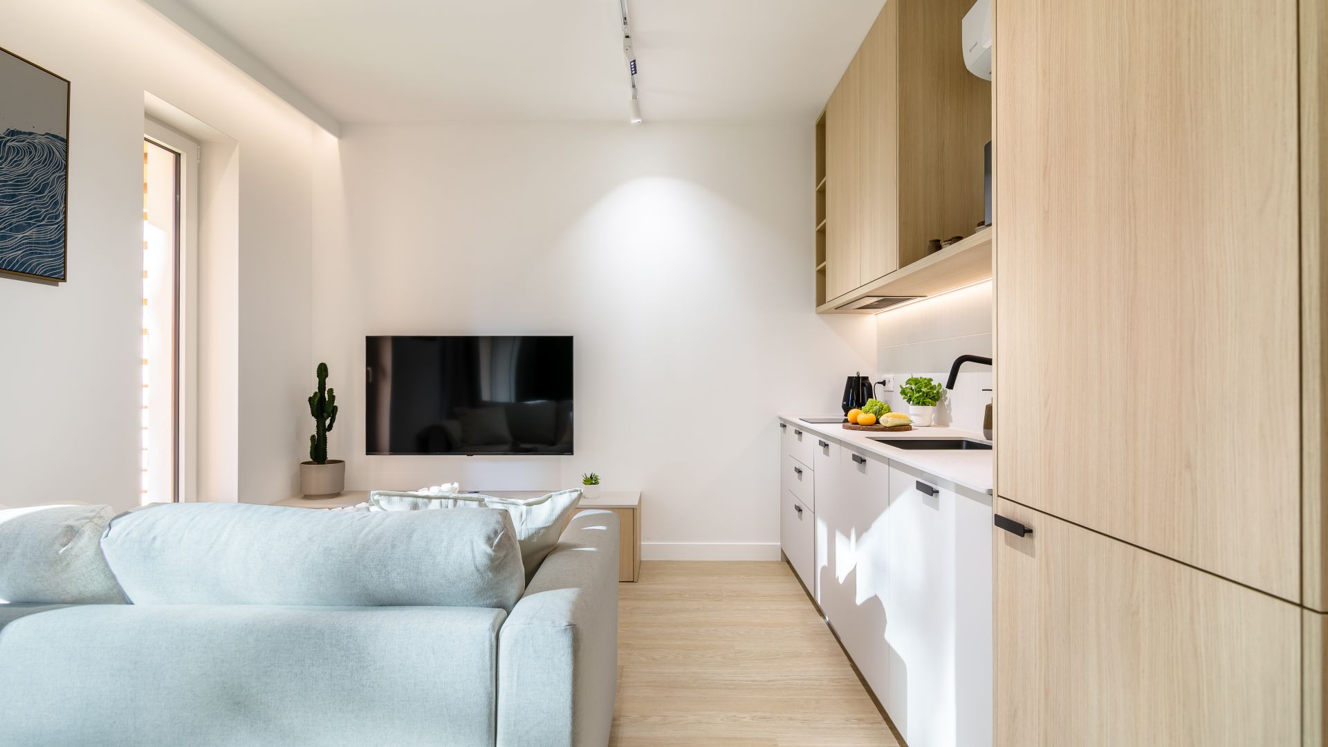 Apartament składa się z komfortowej sypialni z wygodnym, dwuosobowym łóżkiem oraz przestronnego salonu z rozkładaną sofą, która zapewnia dodatkowe miejsca do spania. Nowoczesny aneks kuchenny został w pełni wyposażony w niezbędne udogodnienia, takie jak lodówka, zmywarka, płyta kuchenna, mikrofalówka oraz ekspres do kawy, dzięki czemu goście mogą cieszyć się domową wygodą podczas całego pobytu.