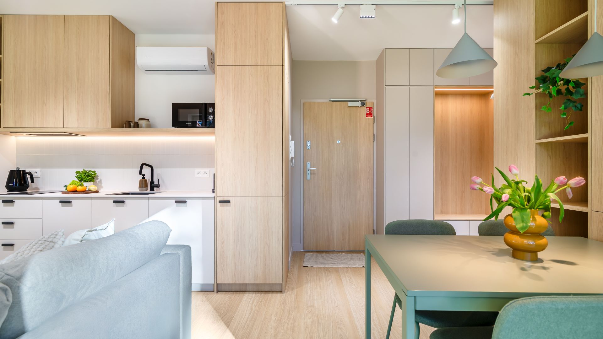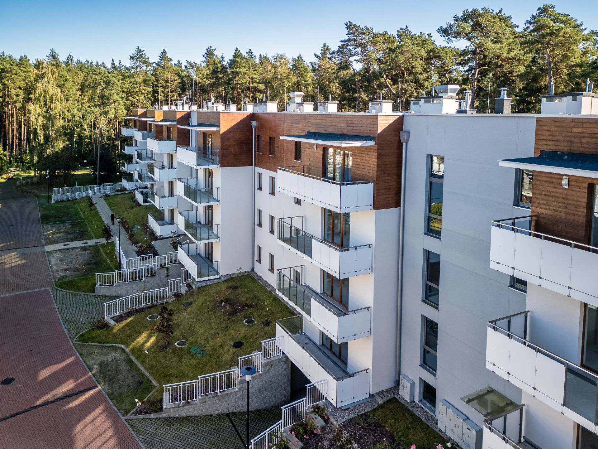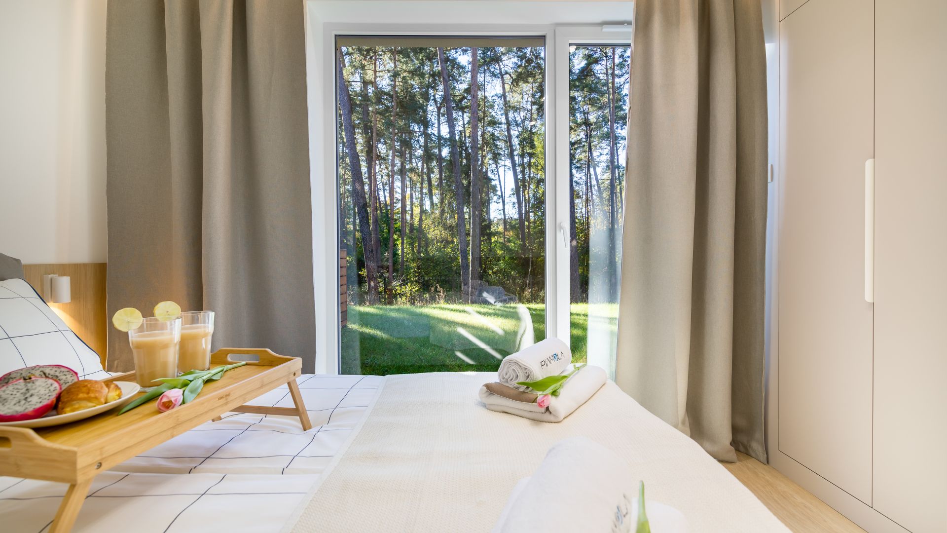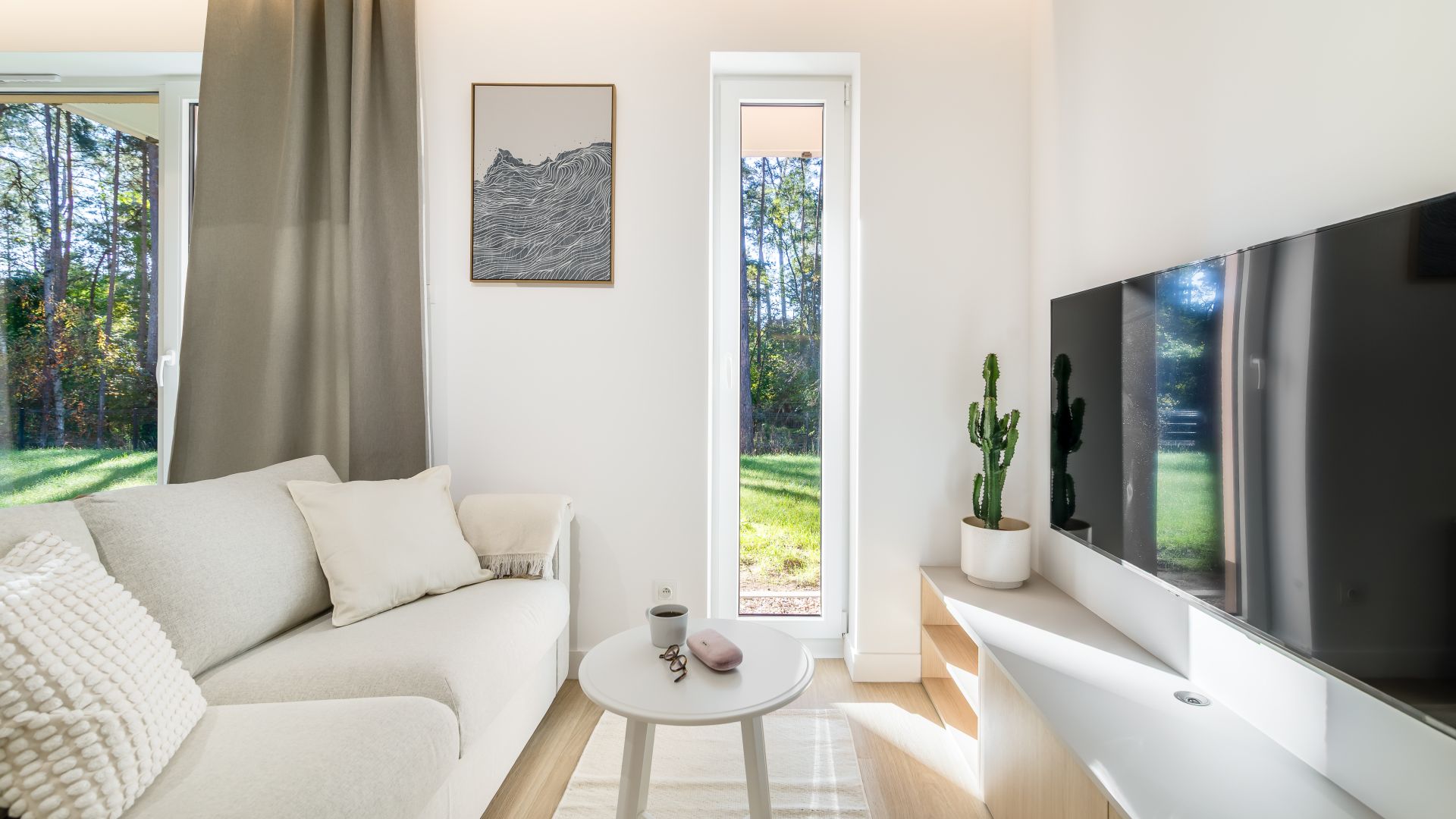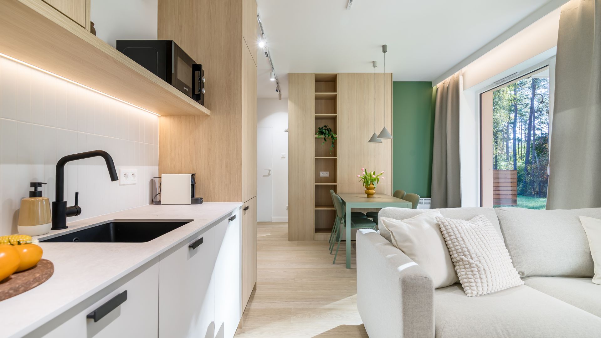 Lokal przeznaczony jest dla 4 osób i znajduje się na parterze nowoczesnego budynku, w otoczeniu zieleni i z bezpośrednim widokiem na las. Jasne, przytulne wnętrze utrzymane zostało w ciepłej, naturalnej kolorystyce, co tworzy atmosferę spokoju i relaksu. Duże okna w salonie wpuszczają mnóstwo światła dziennego, a z wyjścia na prywatny taras można podziwiać piękno otaczającej przyrody — to idealne miejsce na poranną kawę, odpoczynek z książką lub wieczorny posiłek na świeżym powietrzu.