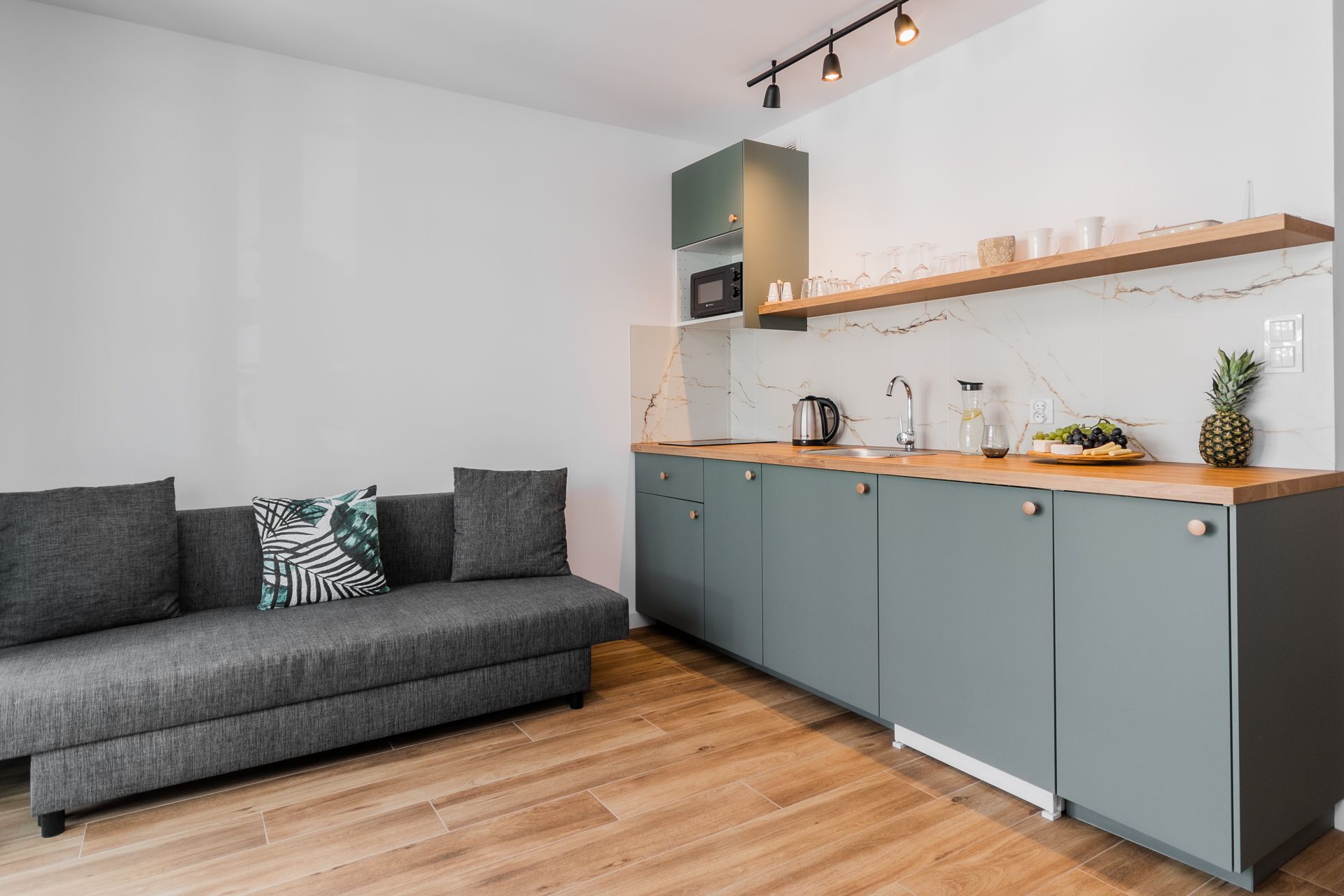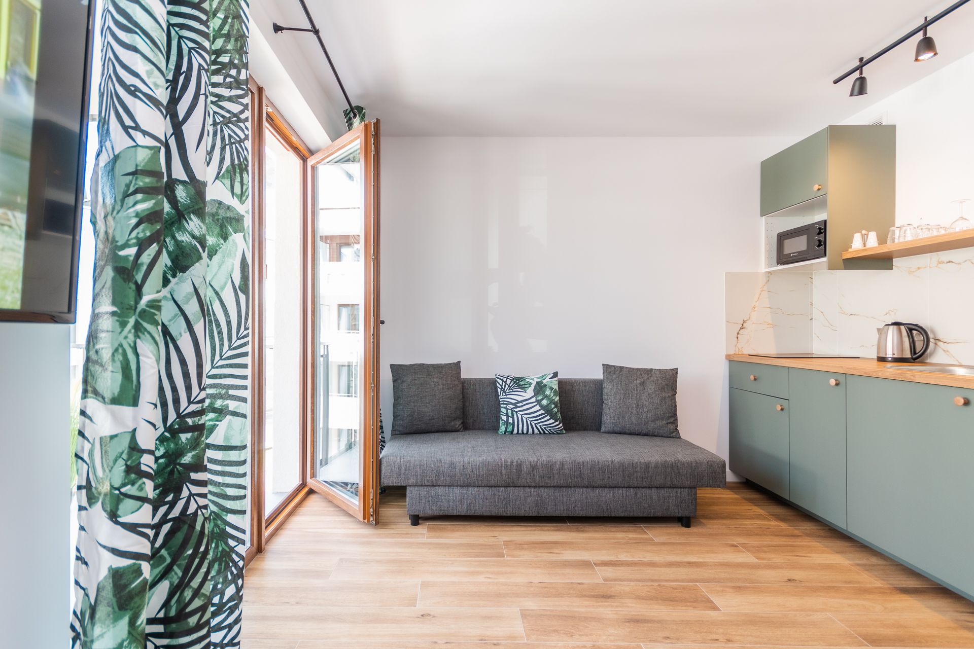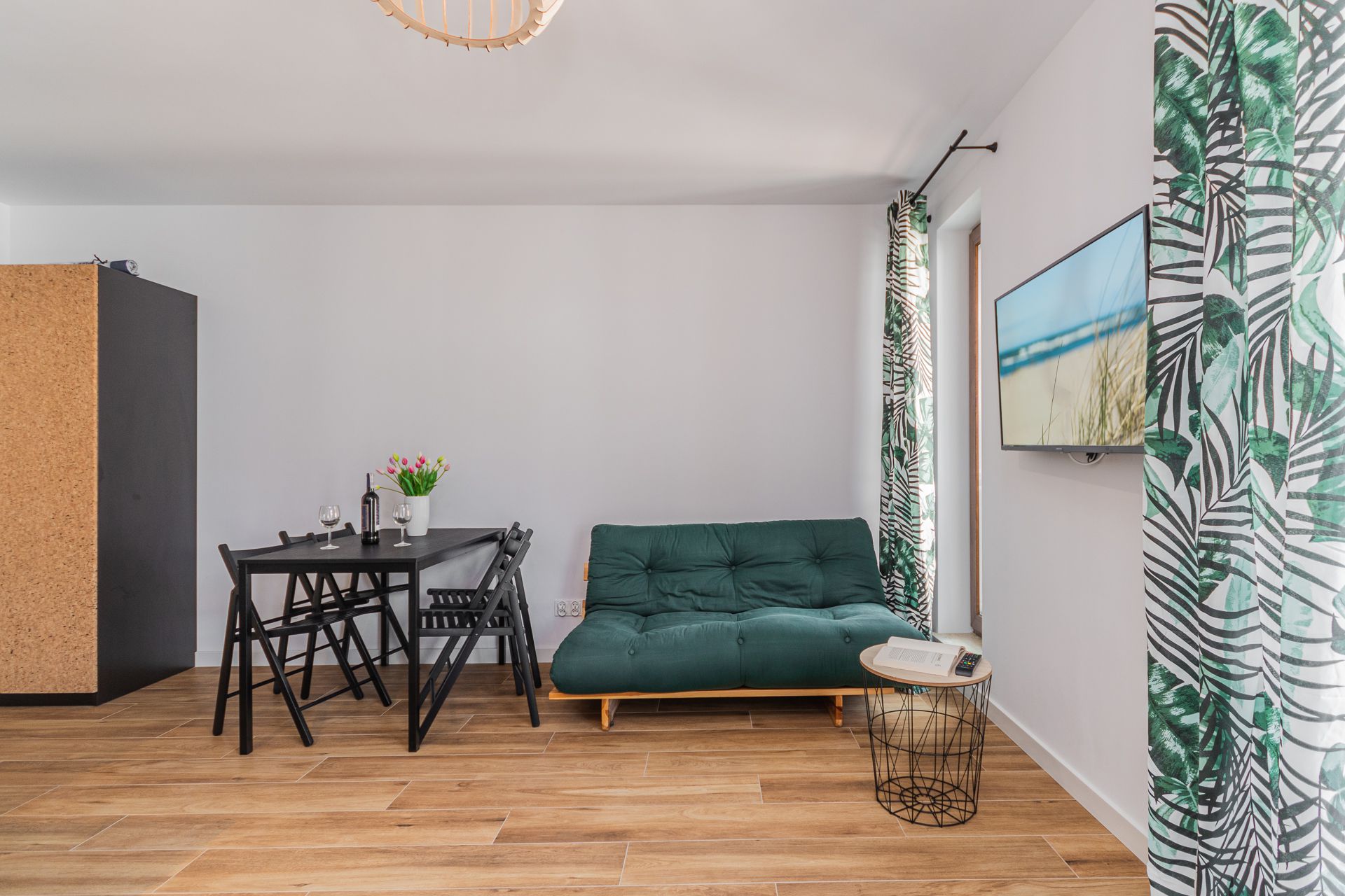 Otwarty salon połączono z aneksem kuchennym. W bocznych strefach studio umiejscowiono dwie wygodne kanapy, które po rozłożeniu zmieniają przestrzeń w część sypialną, w której może nocować do 4 osób. Część kuchenna to w pełni wyposażony aneks. Oprócz płyty grzewczej i lodówki znalazły się tam także mikrofalówka oraz czajnik. Dla naszych gości przygotowaliśmy także niezbędne naczynia, sztućce, kawę, herbatę oraz przyprawy. Na komfortowe zjedzenie posiłku pozwoli stół jadalniany. Studio posiada własną łazienkę z prysznicem. Do apartamentu przynależy prywatne miejsce postojowe.