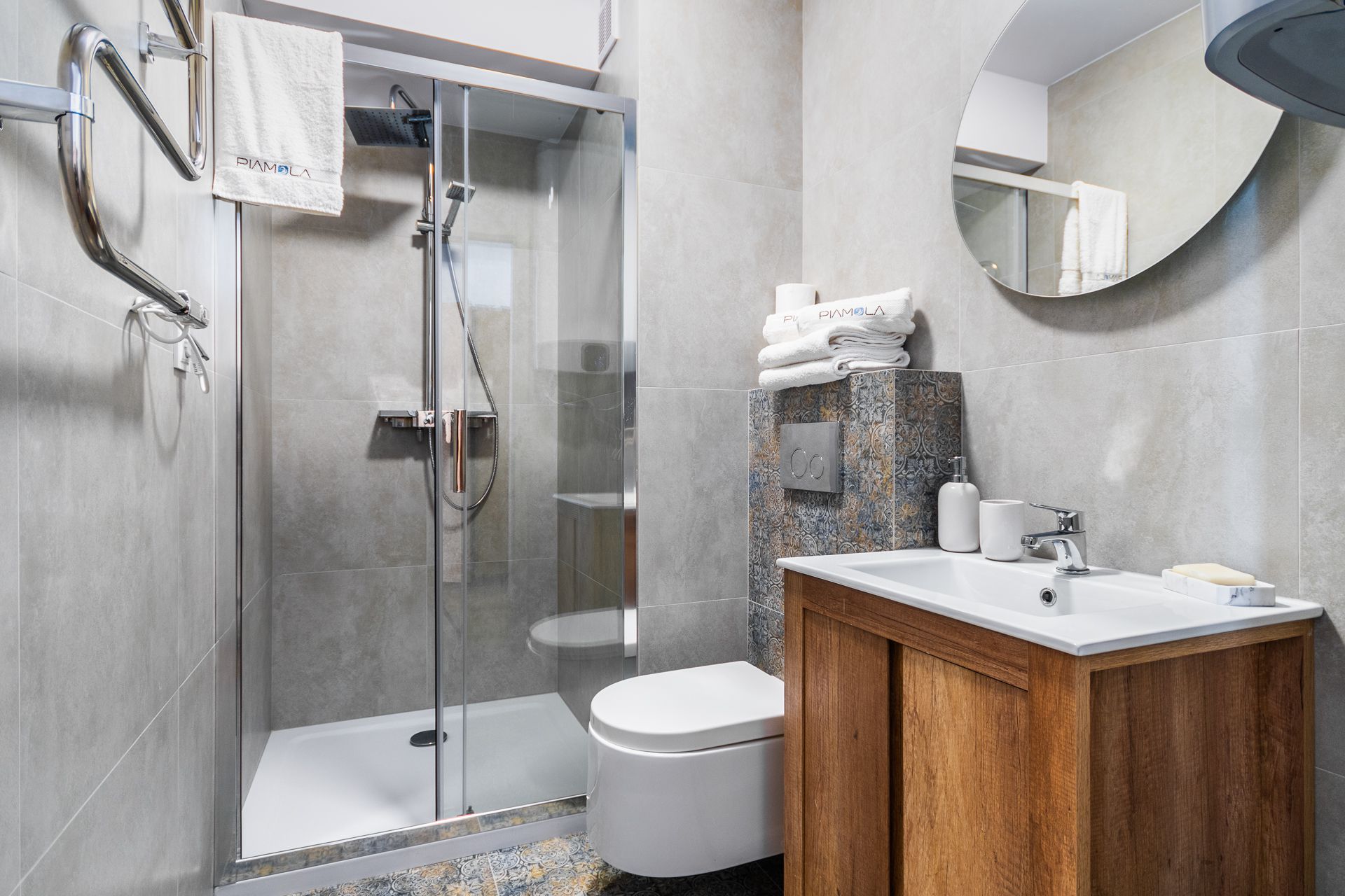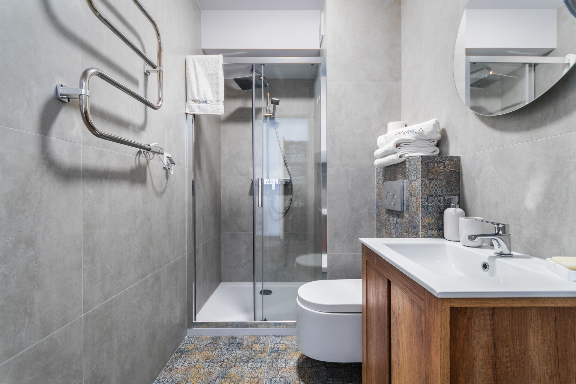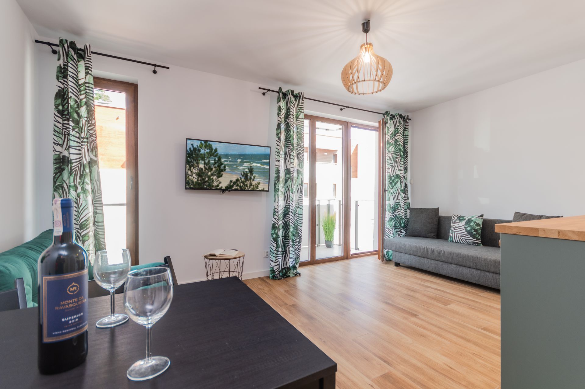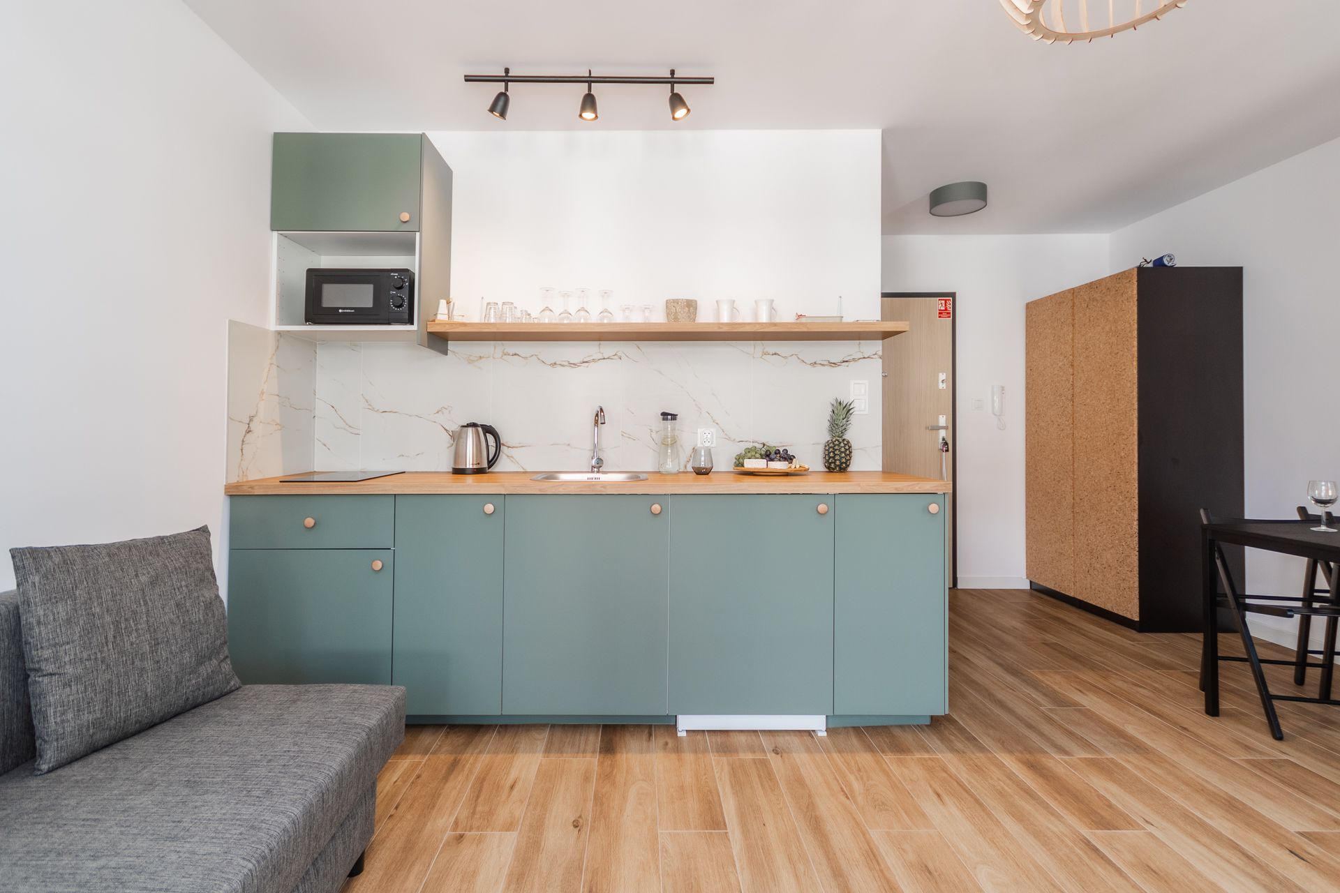 Otwarty salon połączono z aneksem kuchennym. W bocznych strefach studio umiejscowiono dwie wygodne kanapy, które po rozłożeniu zmieniają przestrzeń w część sypialną, w której może nocować do 4 osób. Część kuchenna to w pełni wyposażony aneks. Oprócz płyty grzewczej i lodówki znalazły się tam także mikrofalówka oraz czajnik. Dla naszych gości przygotowaliśmy także niezbędne naczynia, sztućce, kawę, herbatę oraz przyprawy. Na komfortowe zjedzenie posiłku pozwoli stół jadalniany. Studio posiada własną łazienkę z prysznicem. Do apartamentu przynależy prywatne miejsce postojowe.