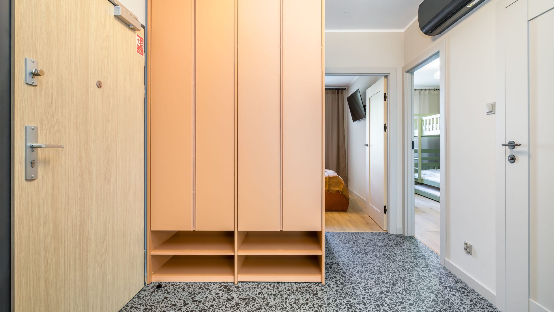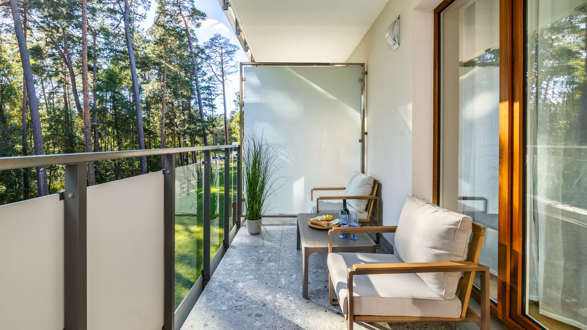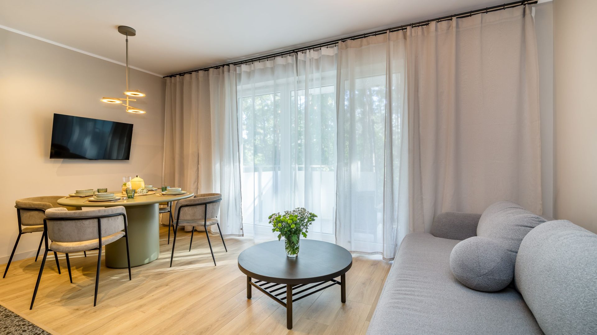 Apartament składa się z dwóch sypialni, salonu oraz balkonu z pięknym widokiem na las. W jednej sypialni znajduje się wygodne łóżko małżeńskie, a w drugiej – piętrowe łóżko oraz biurko, co czyni to miejsce idealnym zarówno dla rodzin, jak i grupy przyjaciół.