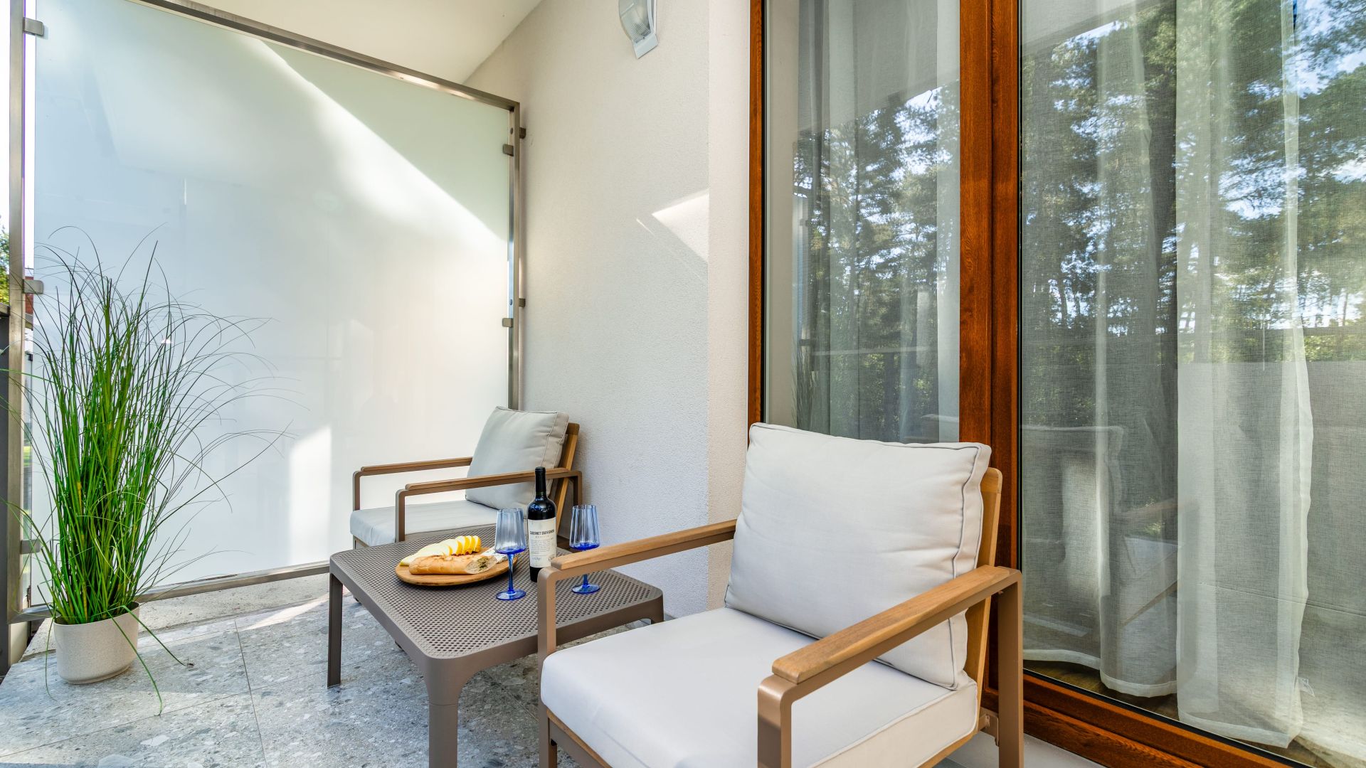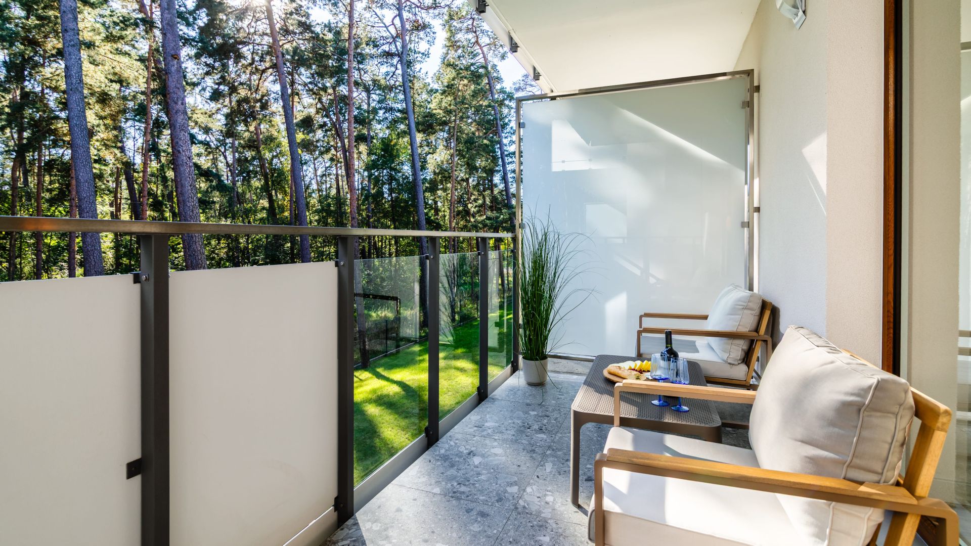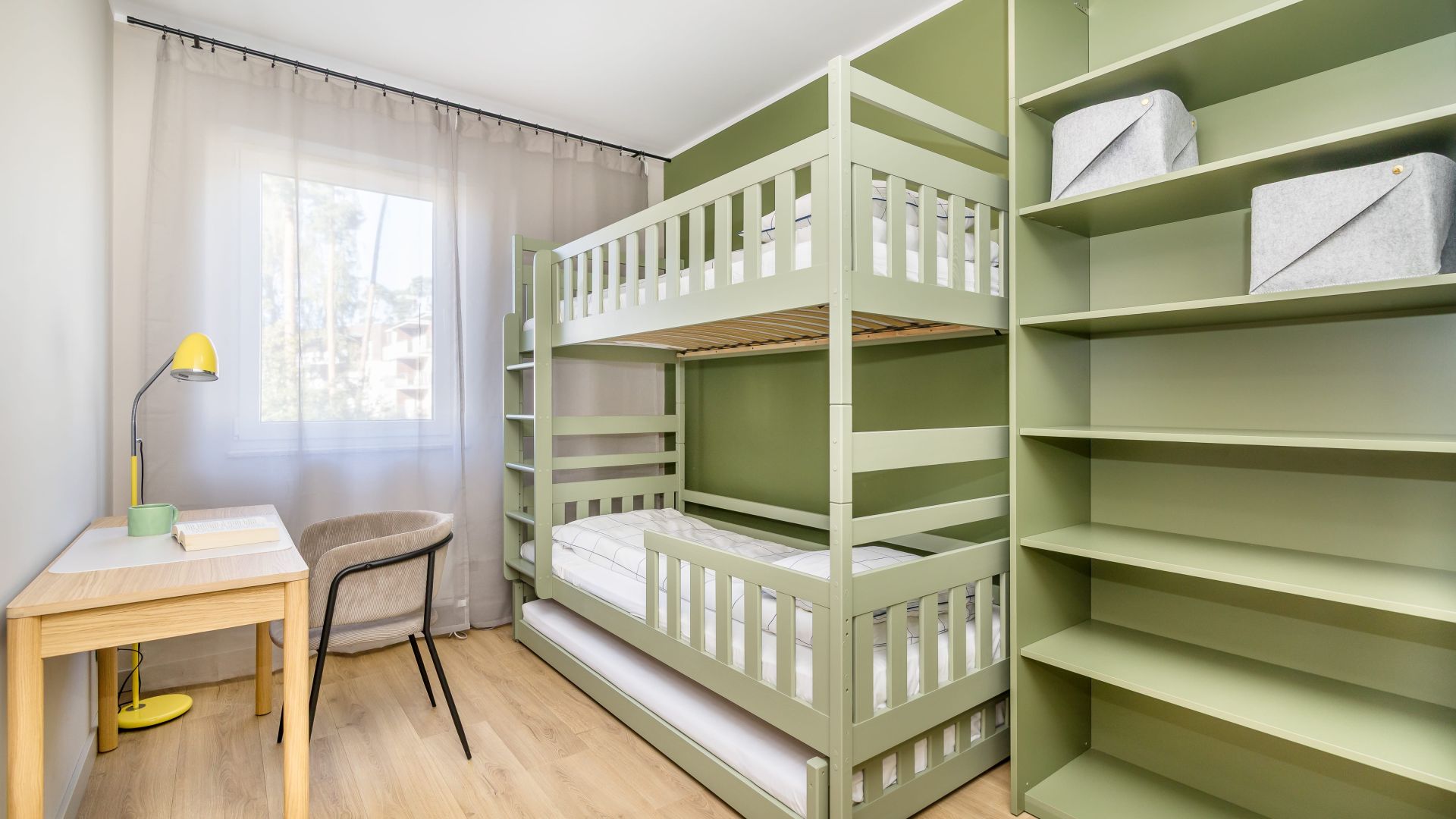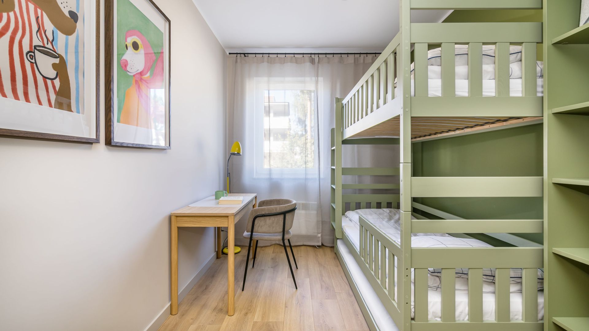 Apartament składa się z dwóch sypialni, salonu oraz balkonu z pięknym widokiem na las. W jednej sypialni znajduje się wygodne łóżko małżeńskie, a w drugiej – piętrowe łóżko oraz biurko, co czyni to miejsce idealnym zarówno dla rodzin, jak i grupy przyjaciół.
