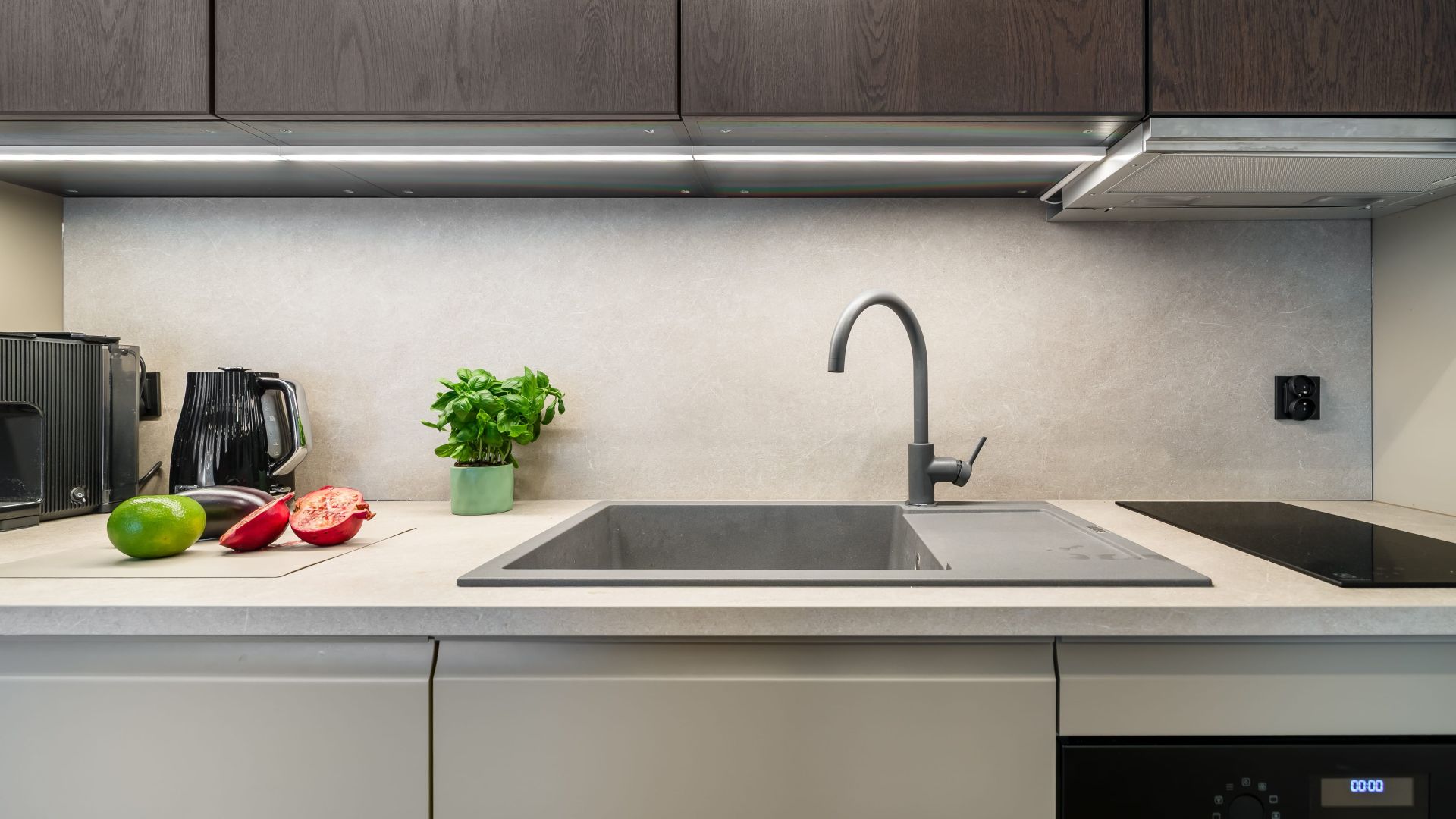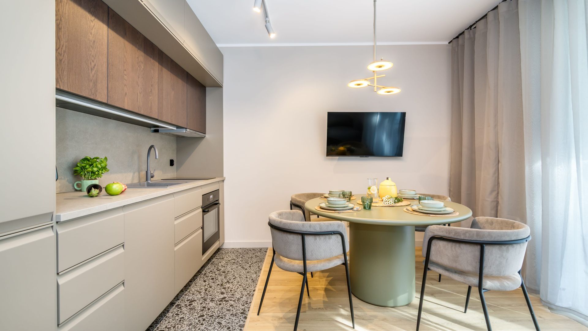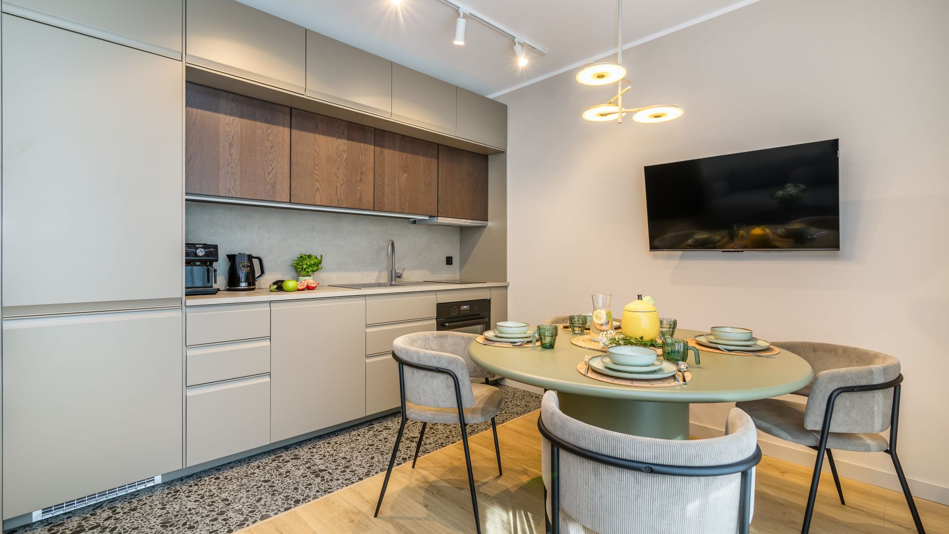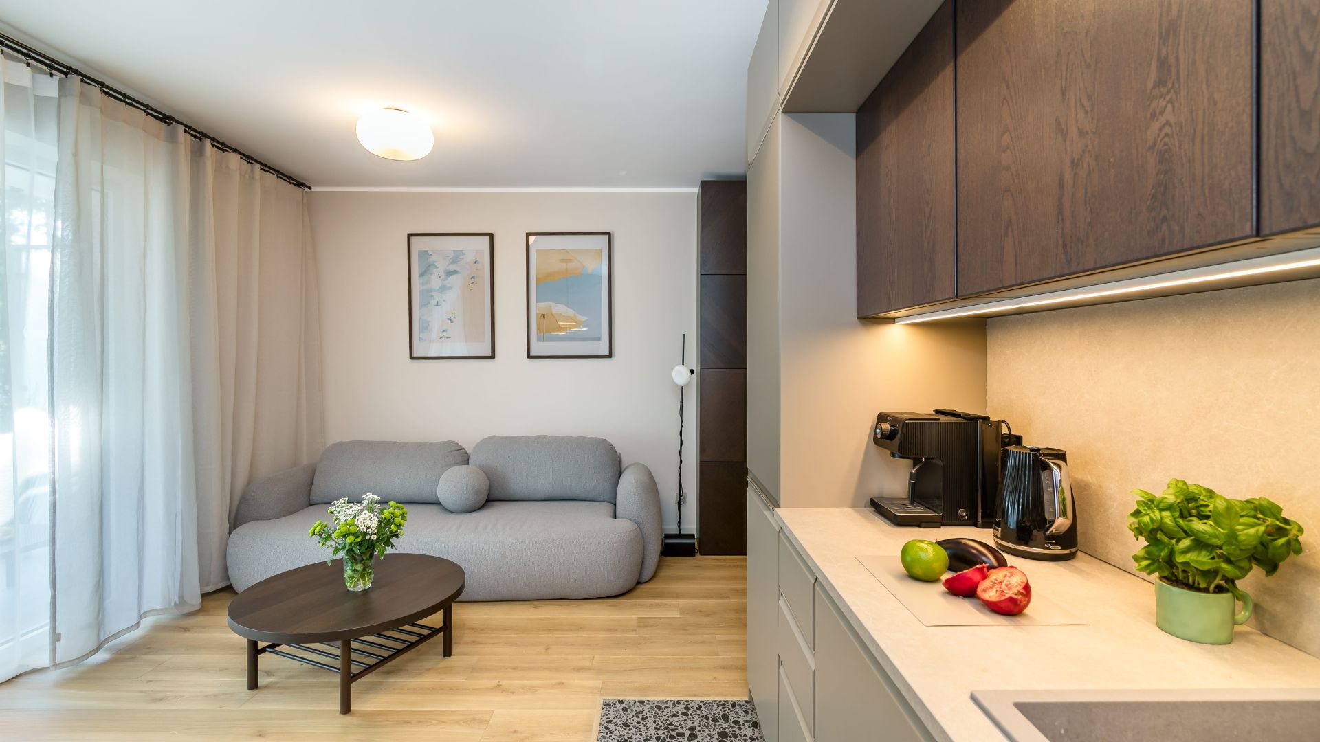 W przestronnym salonie znajduje się kanapa, na której mogą spać dwie osoby, a aneks kuchenny wyposażony jest w najpotrzebniejsze urządzenia, takie jak zmywarka, piekarnik, czajnik elektryczny oraz ekspres do kawy, co pozwala na samodzielne przygotowywanie posiłków.