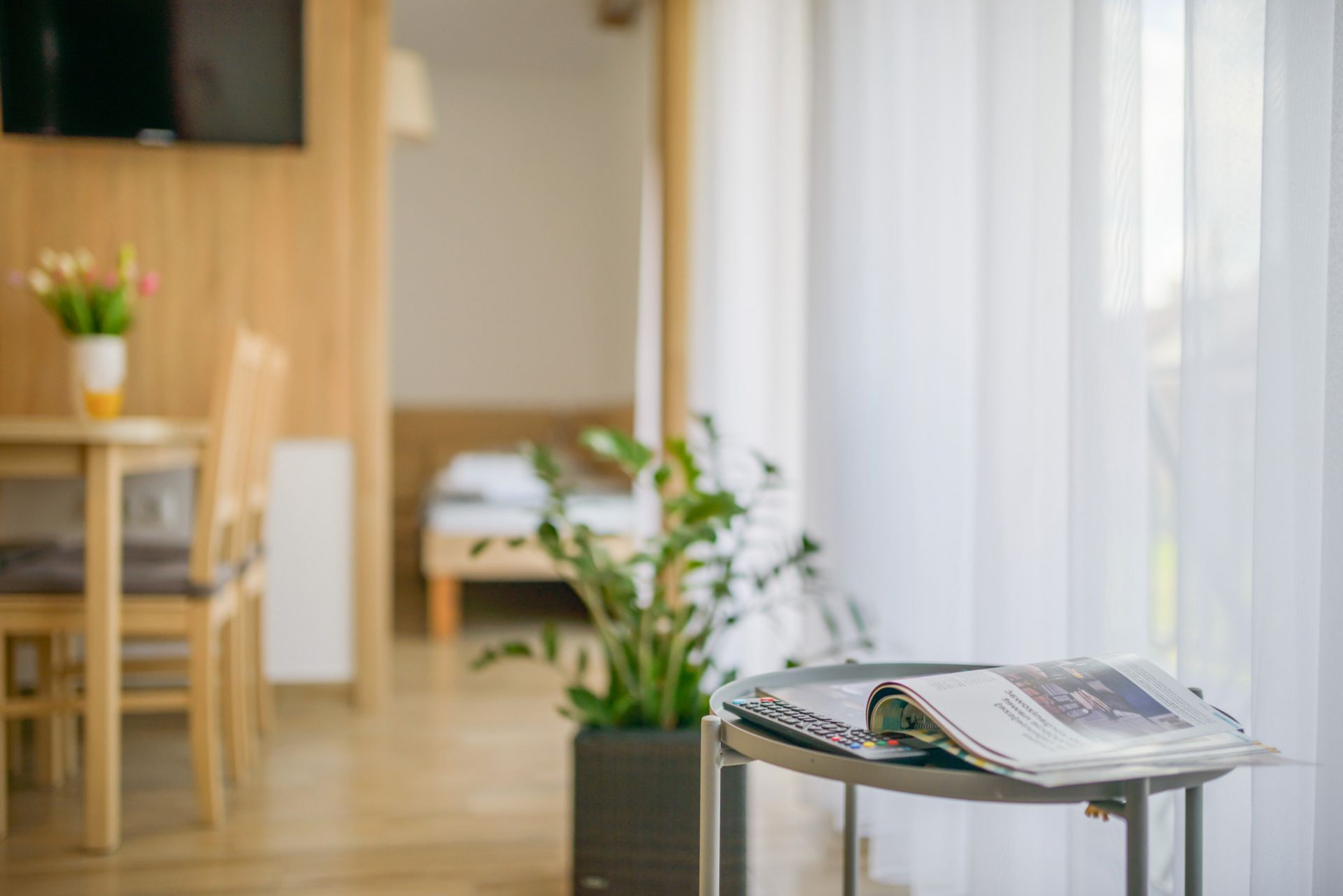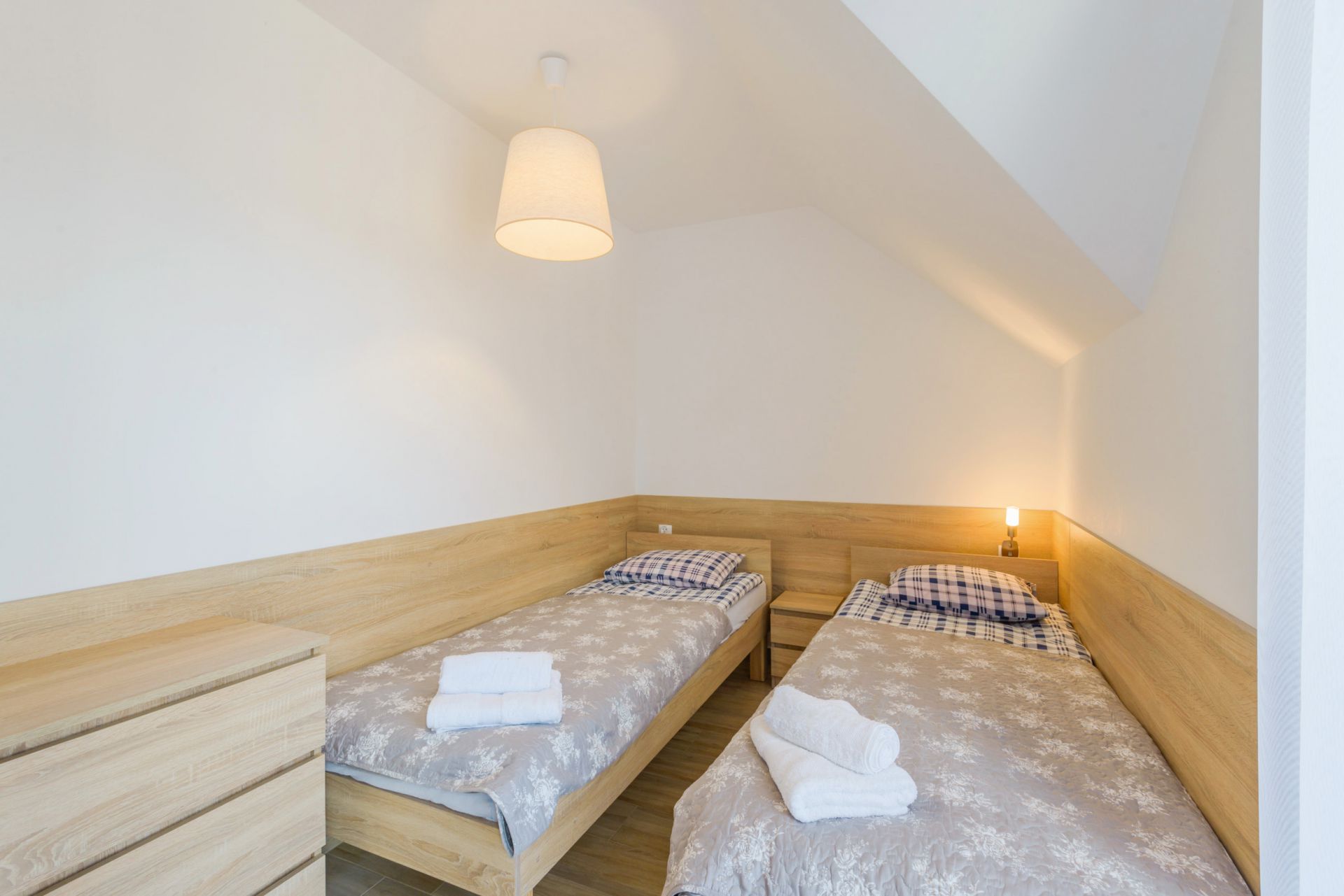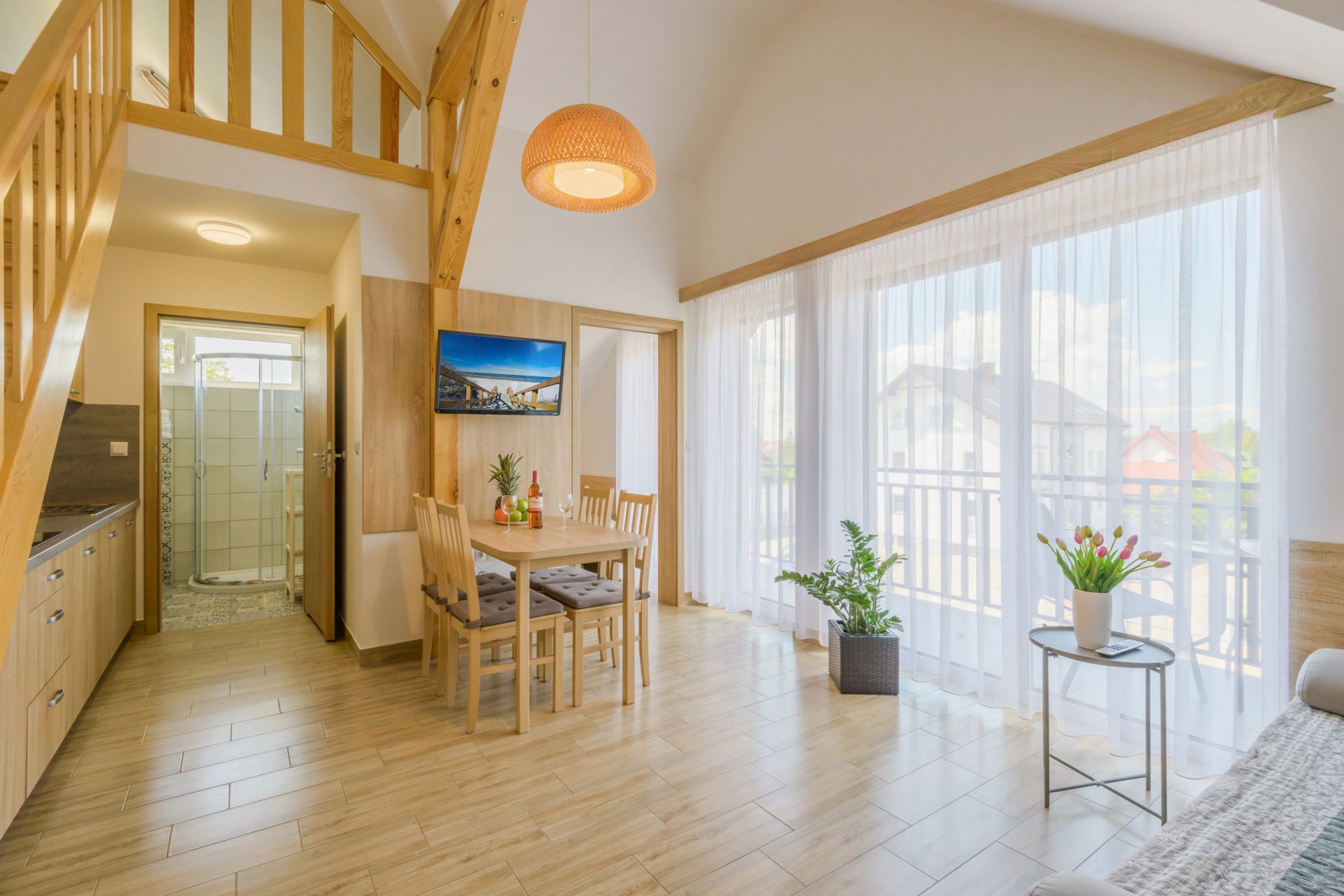 Apartament w obiekcie Willa Zacisze to bardzo stylowy i przestronny lokal przeznaczony dla maksymalnie 6 osób. 40-metrowy apartament składa się z salonu połączonego z aneksem kuchennym, osobnej sypialni wyposażonej w dwa pojedyncze łóżka, antresoli, łazienki oraz balkonu. Część kuchenna to w pełni wyposażony aneks. Oprócz płyty grzewczej i lodówki znalazły się tam także mikrofalówka oraz czajnik. Dla naszych gości przygotowaliśmy także niezbędne naczynia, sztućce, kawę, herbatę oraz przyprawy. Na komfortowe zjedzenie posiłku pozwoli stół jadalniany. W salonie również umieściliśmy wygodną sofę, po rozłożeniu której uzyskamy 2 miejsca do spania. Apartament posiada antresolę, która uwalnia dużą przestrzeń i swobodę. Wchodząc po schodach znajdziemy się w dodatkowej pomieszczeniu z podwójnym materacem do spania. W upalne dni, możemy obniżyć temperaturę za sprawa klimatyzacji. W apartamencie przeważają kolory drewna, co powoduje że czujemy się przytulnie i komfortowo.