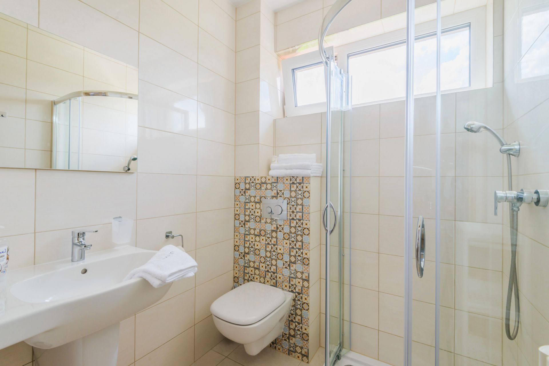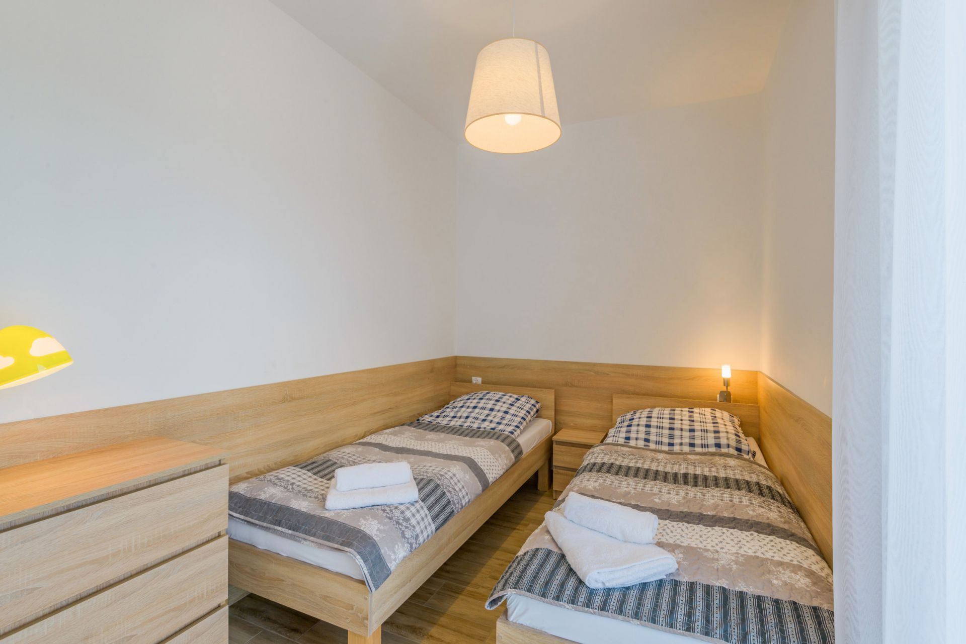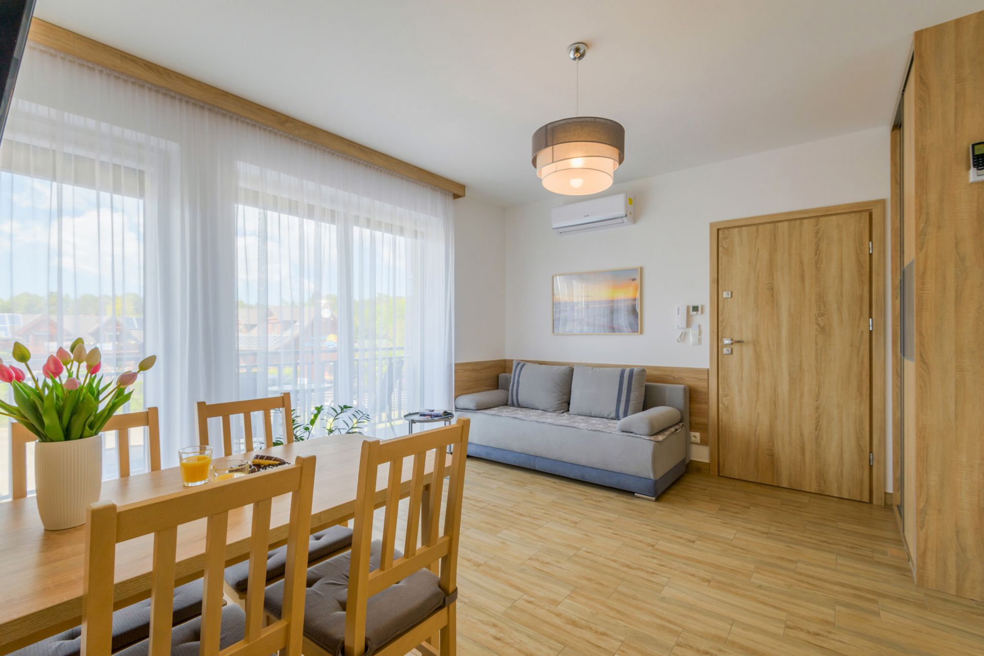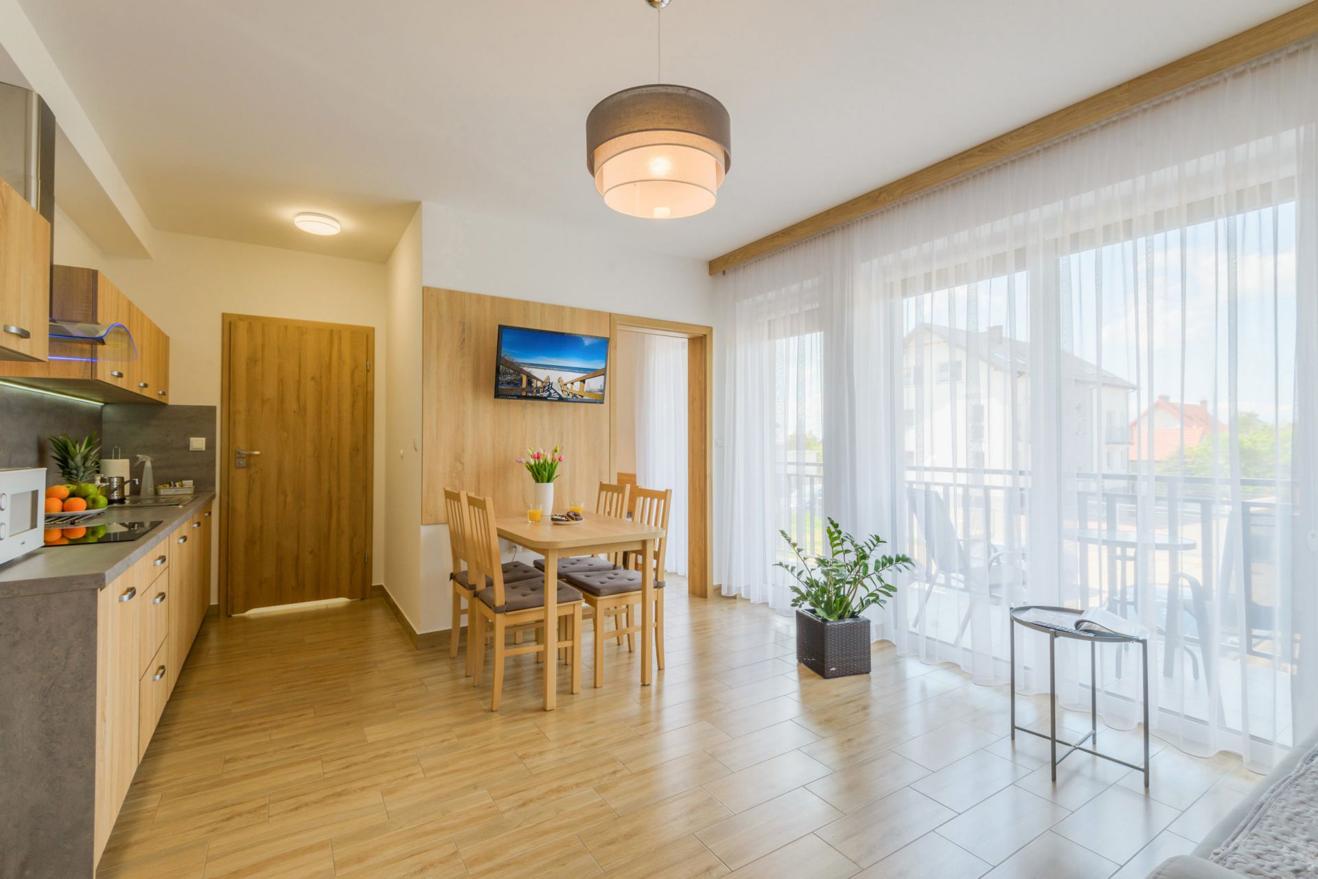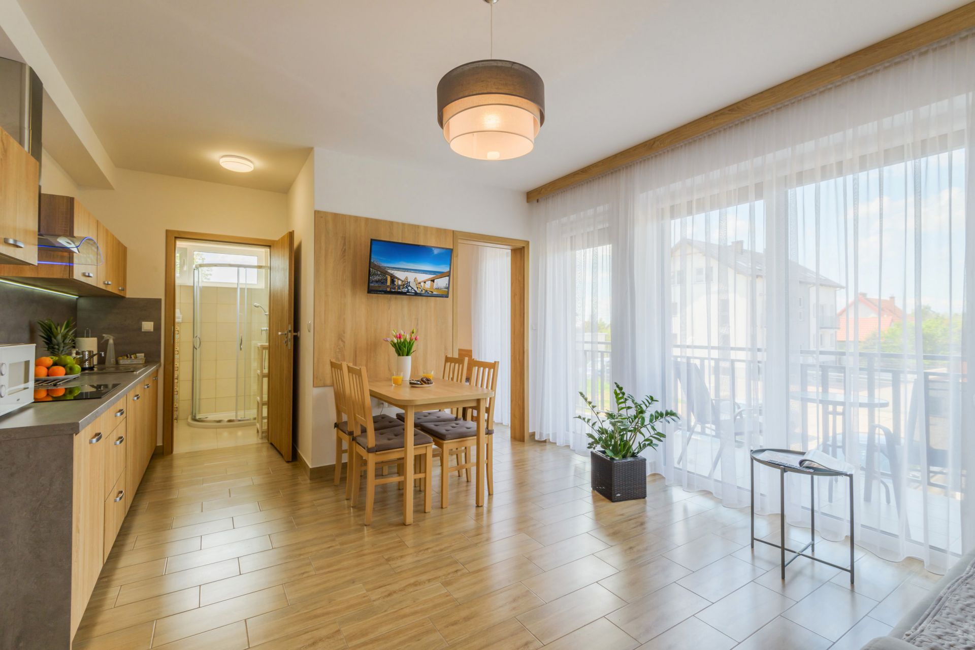 Apartament w obiekcie Willa Zacisze to bardzo stylowy i przestronny lokal przeznaczony dla maksymalnie 4 osób. 30-metrowy apartament składa się z salonu połączonego z aneksem kuchennym, osobnej sypialni wyposażonej w dwa pojedyncze łóżka, łazienki oraz balkonu. Część kuchenna to w pełni wyposażony aneks. Oprócz płyty grzewczej i lodówki znalazły się tam także mikrofalówka oraz czajnik. Dla naszych gości przygotowaliśmy także niezbędne naczynia, sztućce, kawę, herbatę oraz przyprawy. Na komfortowe zjedzenie posiłku pozwoli stół jadalniany. Duży balkon jest doskonałym miejscem, skąd przy stoliku możemy podziwiać okolice, popijając poranną kawę. W upalne dni, możemy obniżyć temperaturę za sprawa klimatyzacji. W apartamencie przeważają kolory drewna, co powoduje że czujemy się przytulnie i komfortowo.