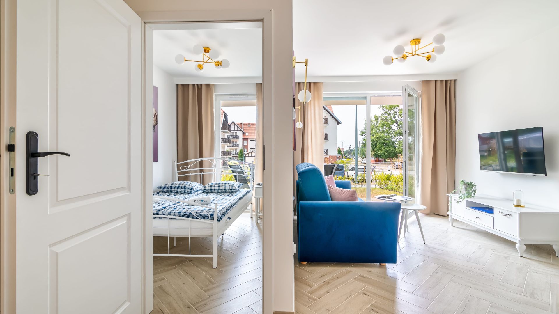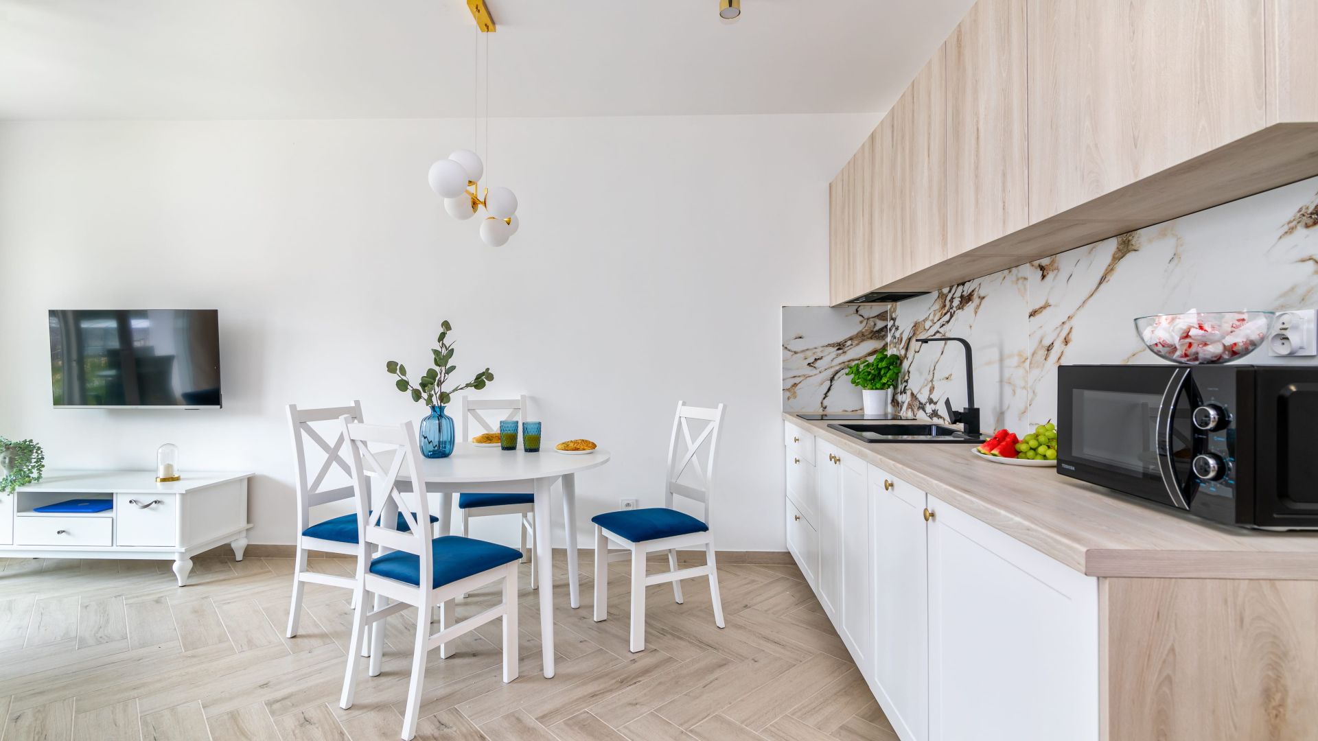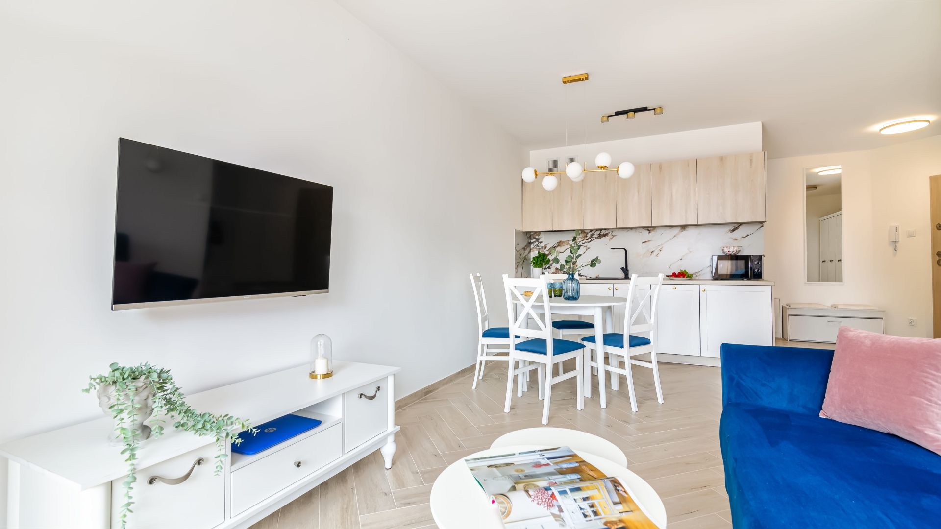 Apartament o powierzchni 38 m2, charakteryzuje się jasnym, przestronnym salonem z wyjściem na taras. Pokój dzienny płynnie przechodzi w pełni wyposażony aneks kuchenny, w którym znajduje się lodówka, mikrofala, czajnik oraz wszystkie niezbędne akcesoria ułatwiające przygotowywanie posiłków. Nasi Goście do dyspozycji będą mieli również żelazko oraz suszarkę.