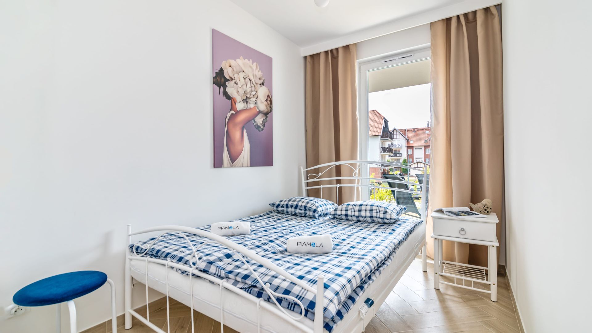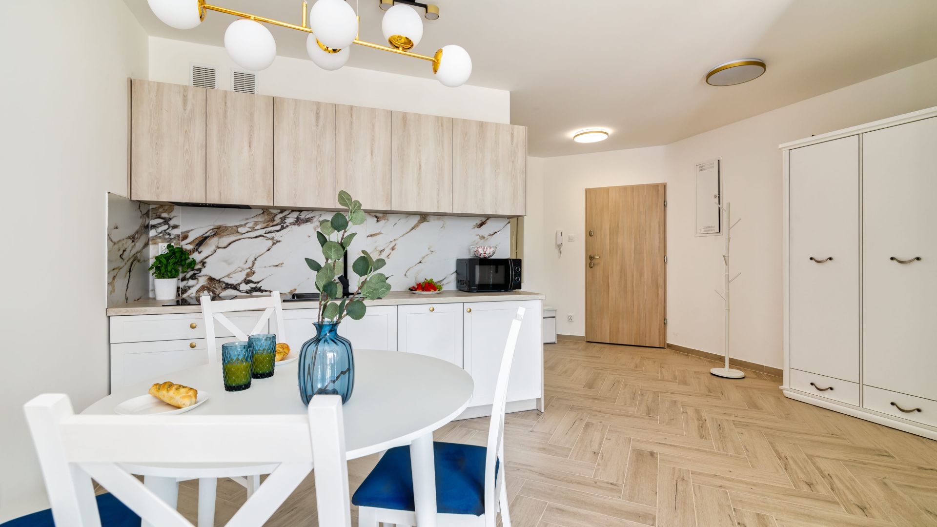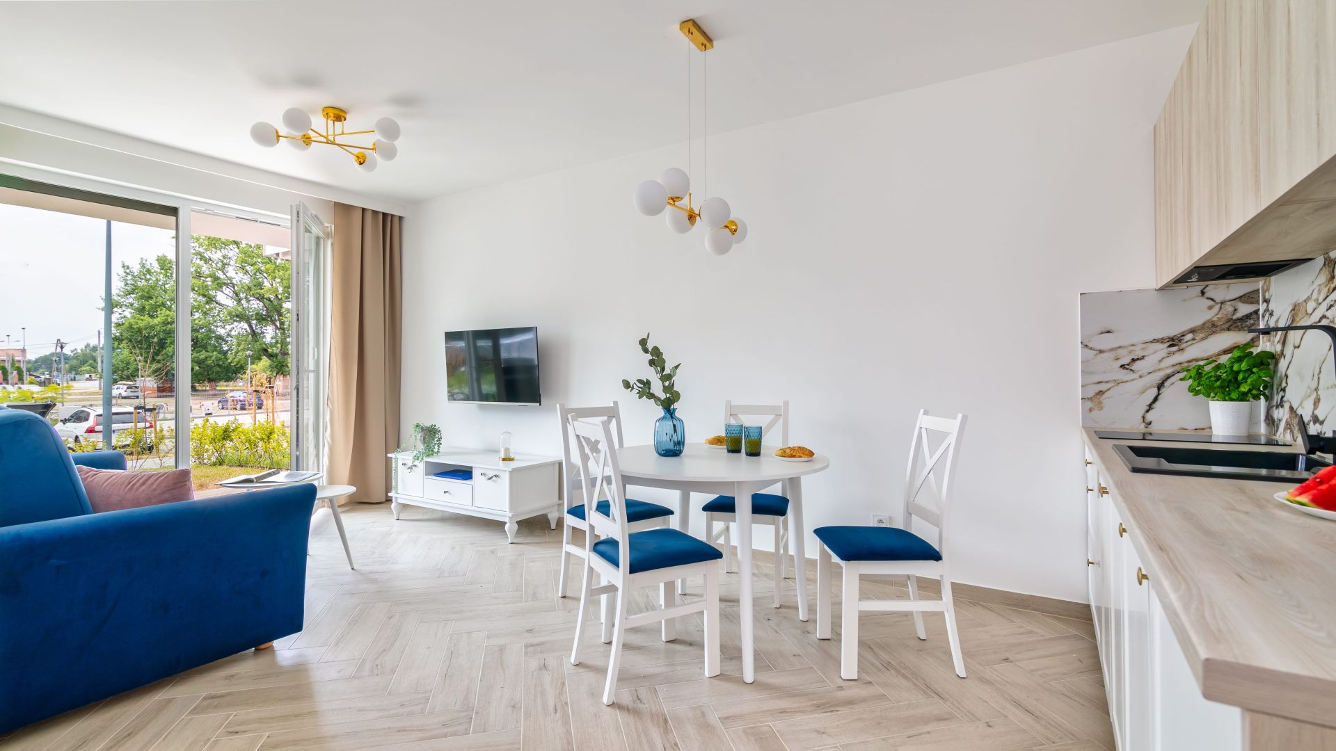 Apartament o powierzchni 38 m2, charakteryzuje się jasnym, przestronnym salonem z wyjściem na taras. Pokój dzienny płynnie przechodzi w pełni wyposażony aneks kuchenny, w którym znajduje się lodówka, mikrofala, czajnik oraz wszystkie niezbędne akcesoria ułatwiające przygotowywanie posiłków. Nasi Goście do dyspozycji będą mieli również żelazko oraz suszarkę.