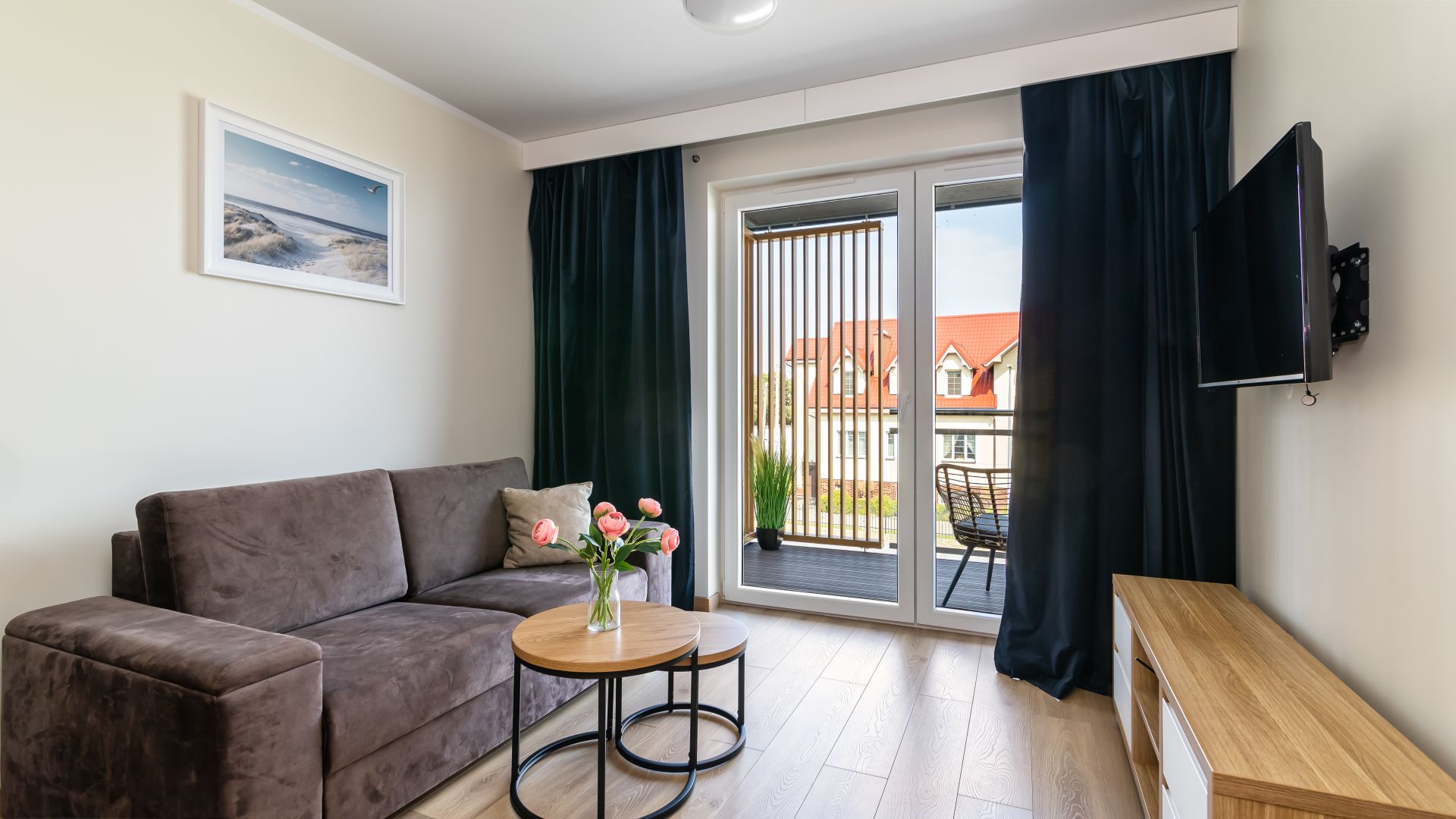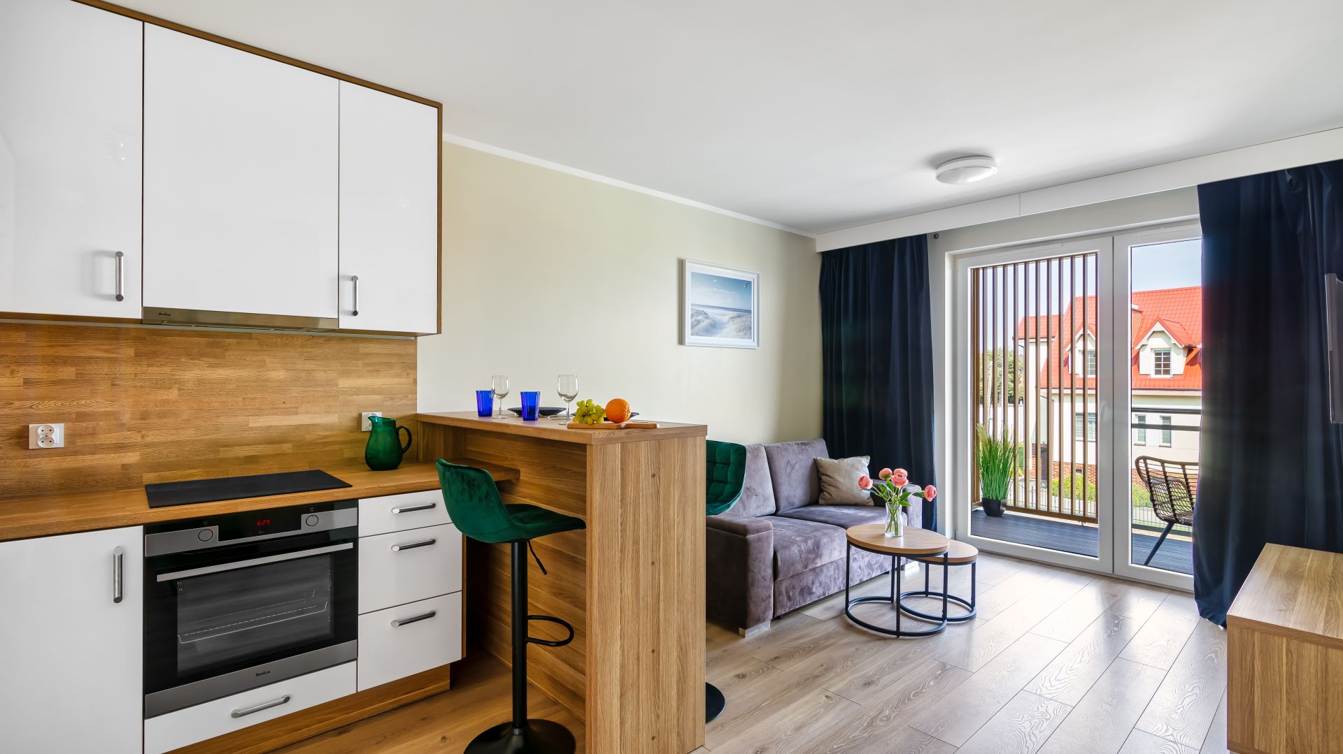 Oferujemy Państwu nowoczesny apartament, który został wyposażony i zaprojektowany z myślą o komforcie i wygodzie naszych Gości. Jest to idealne miejsce na wakacyjny pobyt, zlokalizowane w ścisłym centrum nadmorskiej miejscowości Kąty Rybackie. Apartament ma 32 m2 powierzchni i posiada balkon z meblami ogrodowymi. W mieszkaniu może nocować do 4 osób. Otwarty salon połączono z w pełni wyposażonym aneksem kuchennym. Oprócz płyty grzewczej i lodówki znalazły się tam także mikrofalówka oraz czajnik. Dla naszych gości przygotowaliśmy również niezbędne naczynia, sztućce, kawę i herbatę. Na komfortowe zjedzenie posiłku pozwoli wyspa z hokerami. Apartament posiada własną łazienkę z prysznicem, WC oraz suszarką do włosów. W sypialni znajdują się podwójne łóżko oraz przestronna szafa , natomiast w salonie do dyspozycji Gości jest wygodna rozkładana sofa. Zapewniamy ręczniki i pościel. Do apartamentu przynależy prywatne miejsce postojowe przed budynkiem dedykowane dla jednego samochodu. Mieszkanie mieści się na pierwszym piętrze. Osiedle, w którym znajduje się apartament, jest nowe, ogrodzone i bezpieczne. Dużym atutem jest lokalizacja, gdyż wszystkie atrakcje, sklepy, restauracje i kawiarnie są na wyciągnięcie ręki. Jest to też świetna baza wypadowa np. do Trójmiasta (50 km). Obiekt znajduje się nieopodal lasu sosnowego, w którym znajdziemy ścieżkę prowadzącą na piaszczystą plażę (1,2 km). Istnieje również możliwość podjechania pod samą plażę meleksem, co stanowi dużą frajdę i atrakcję dla dzieci, jak i dla dorosłych. Dla osób ceniących sobie aktywny wypoczynek - liczne trasy rowerowe i nordic walking. Nasz apartament to idealne miejsce dla osób, które poszukują odskoczni od codzienności w błogiej ciszy w otoczeniu darów natury.