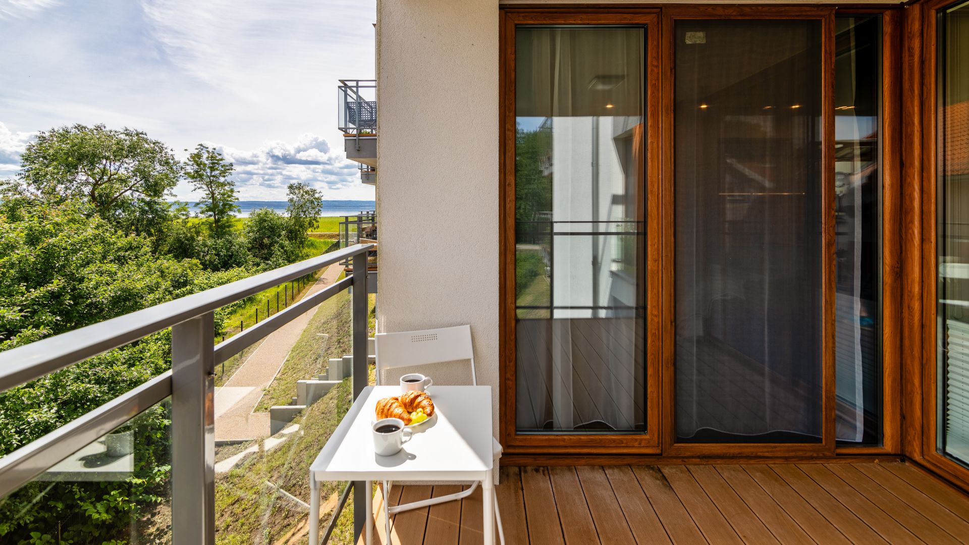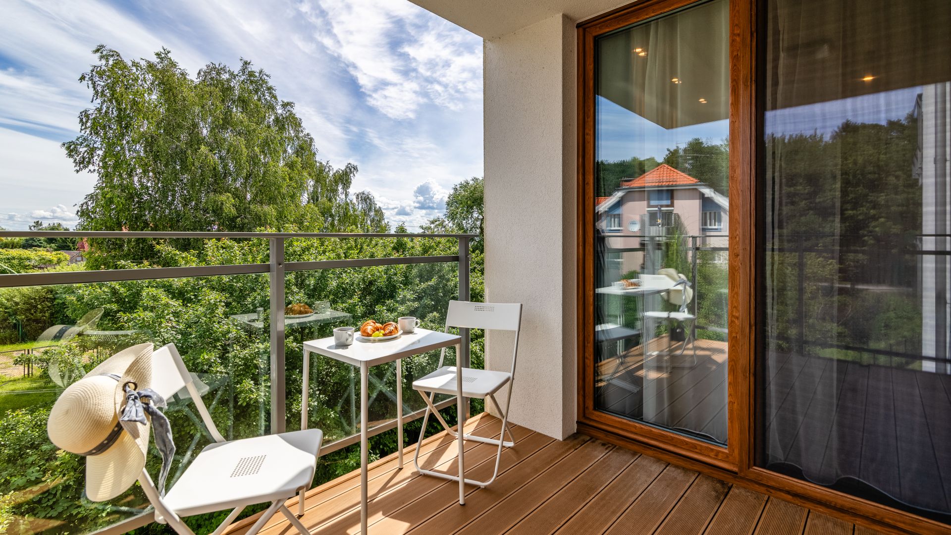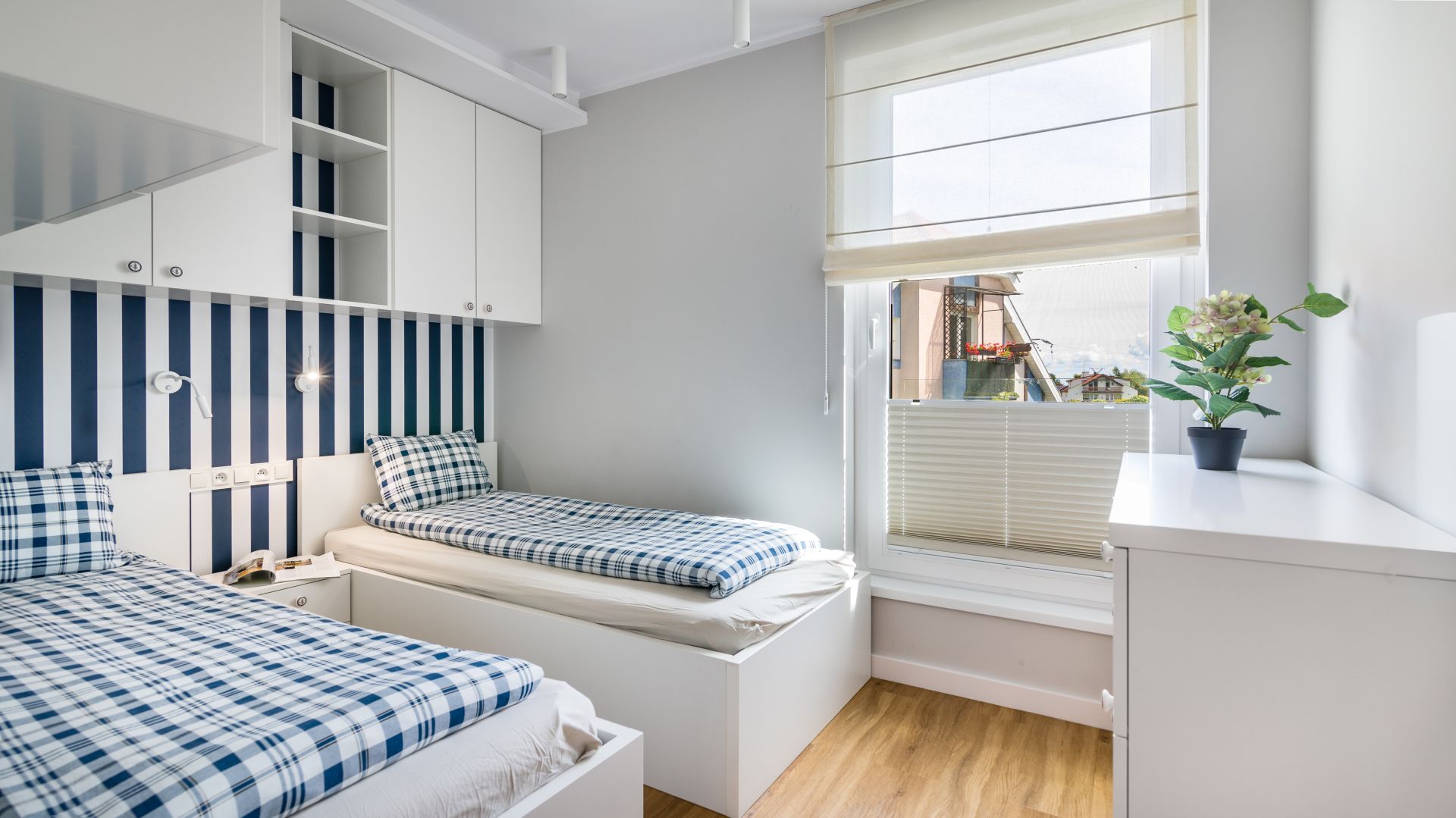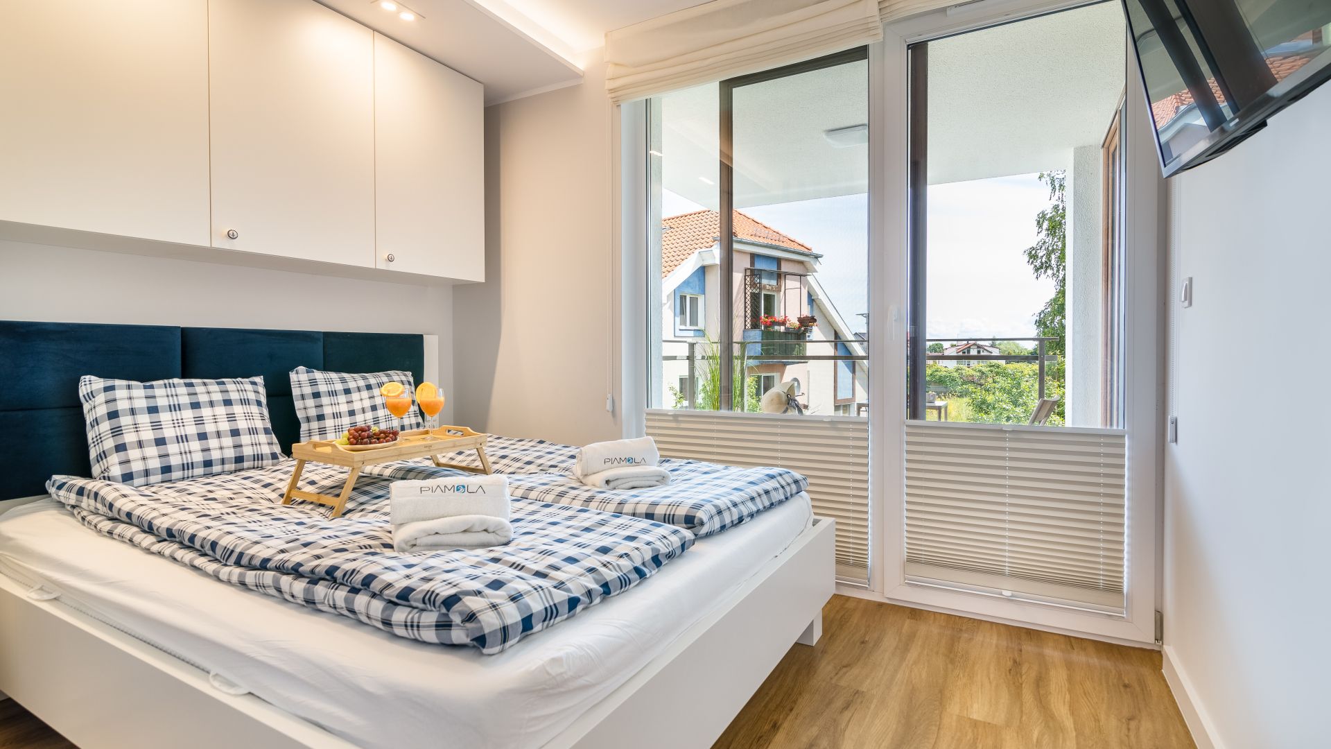Apartament posiada dwie sypialnie. W jednej z nich znajduje się łóżko małżeńskie oraz wejście na balkon, na którym znajdują się meble ogrodowe. W drugiej sypialni znajdują się dwa łóżka jednoosobowe.