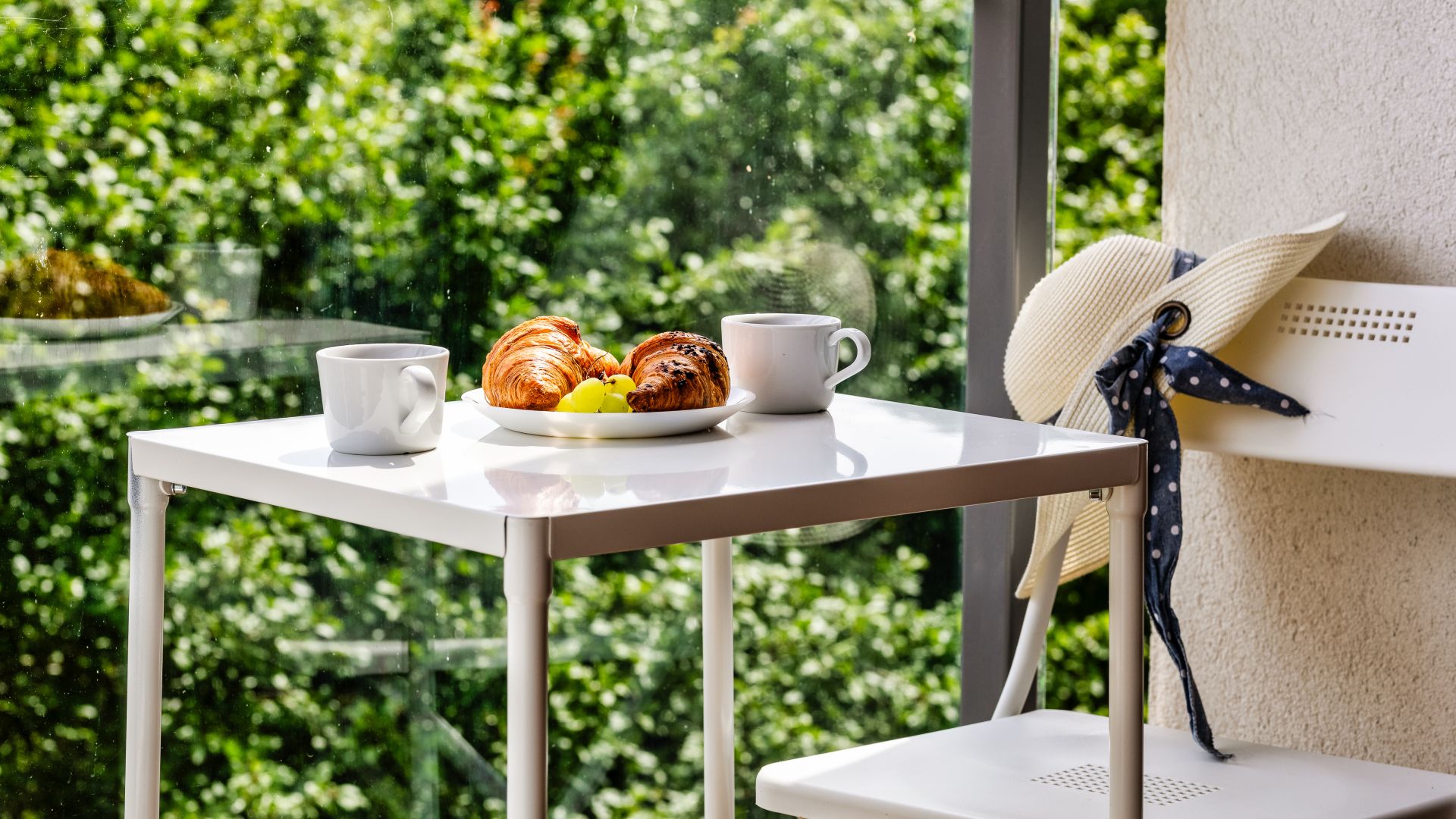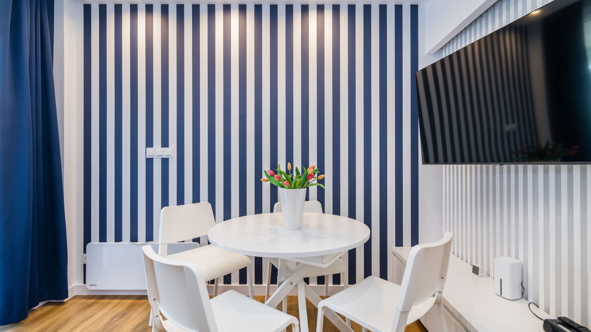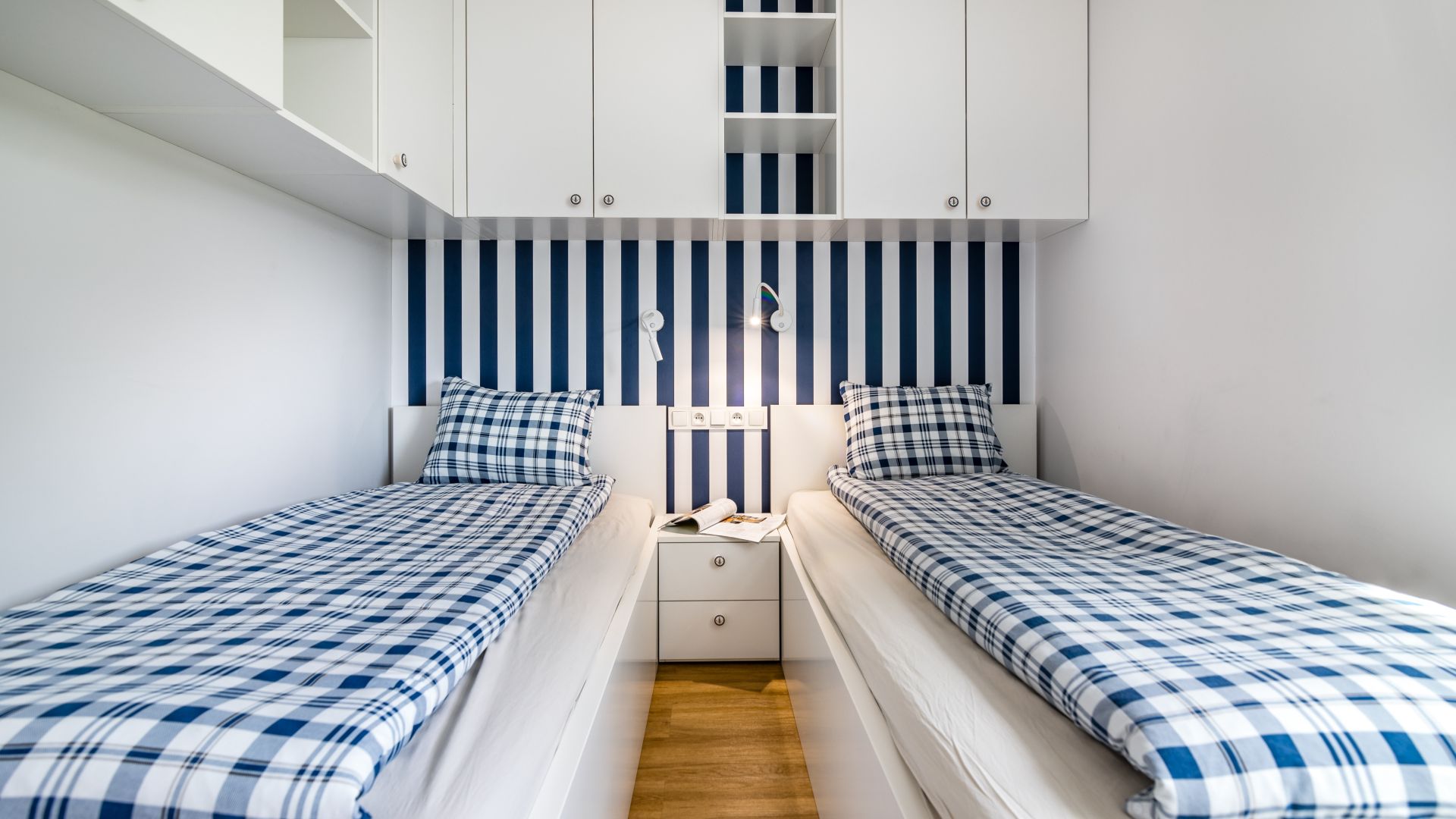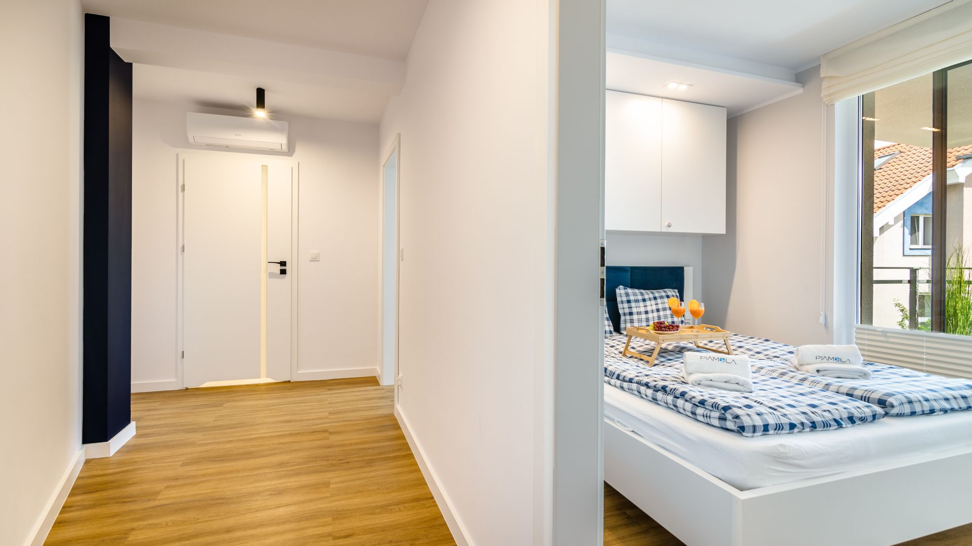 Apartament posiada dwie sypialnie. W jednej z nich znajduje się łóżko małżeńskie oraz wejście na balkon, na którym znajdują się meble ogrodowe. W drugiej sypialni znajdują się dwa łóżka jednoosobowe.
