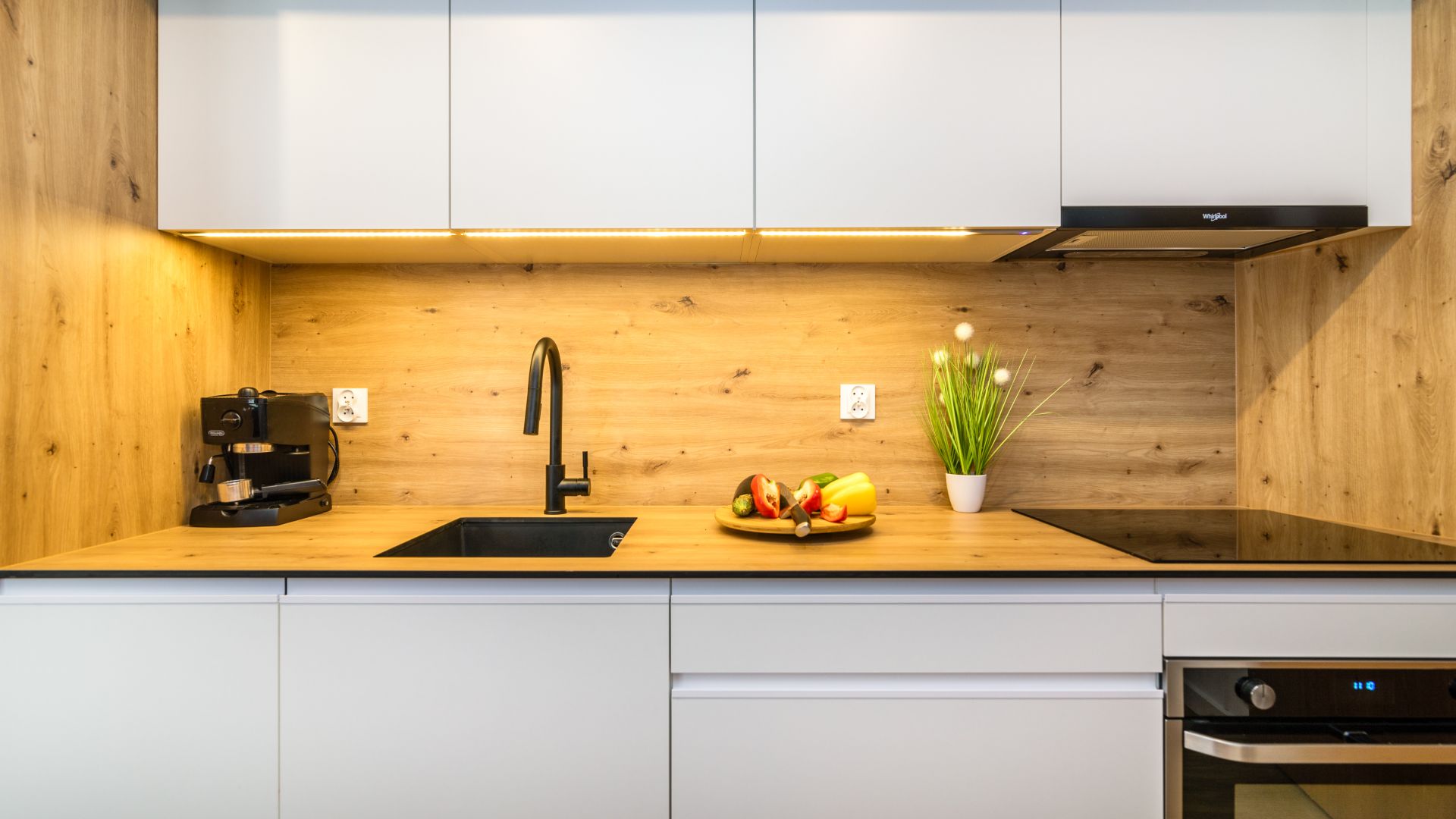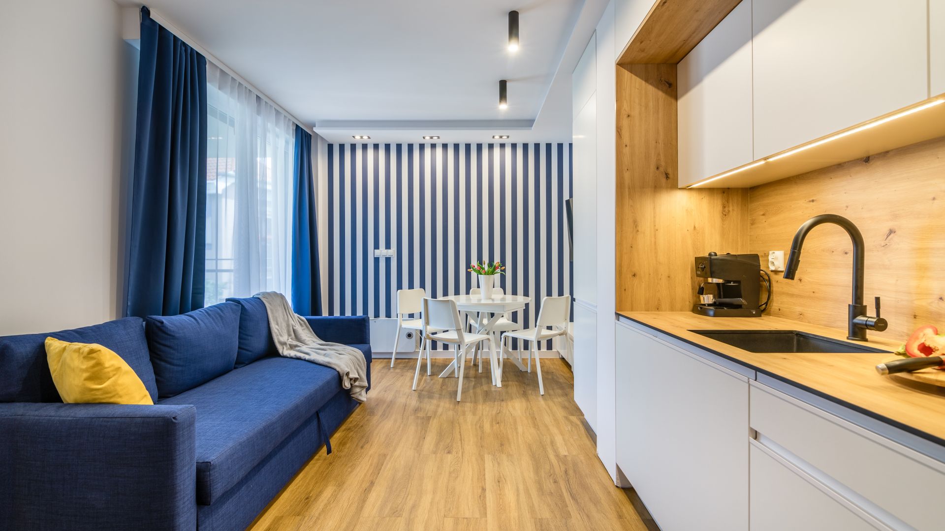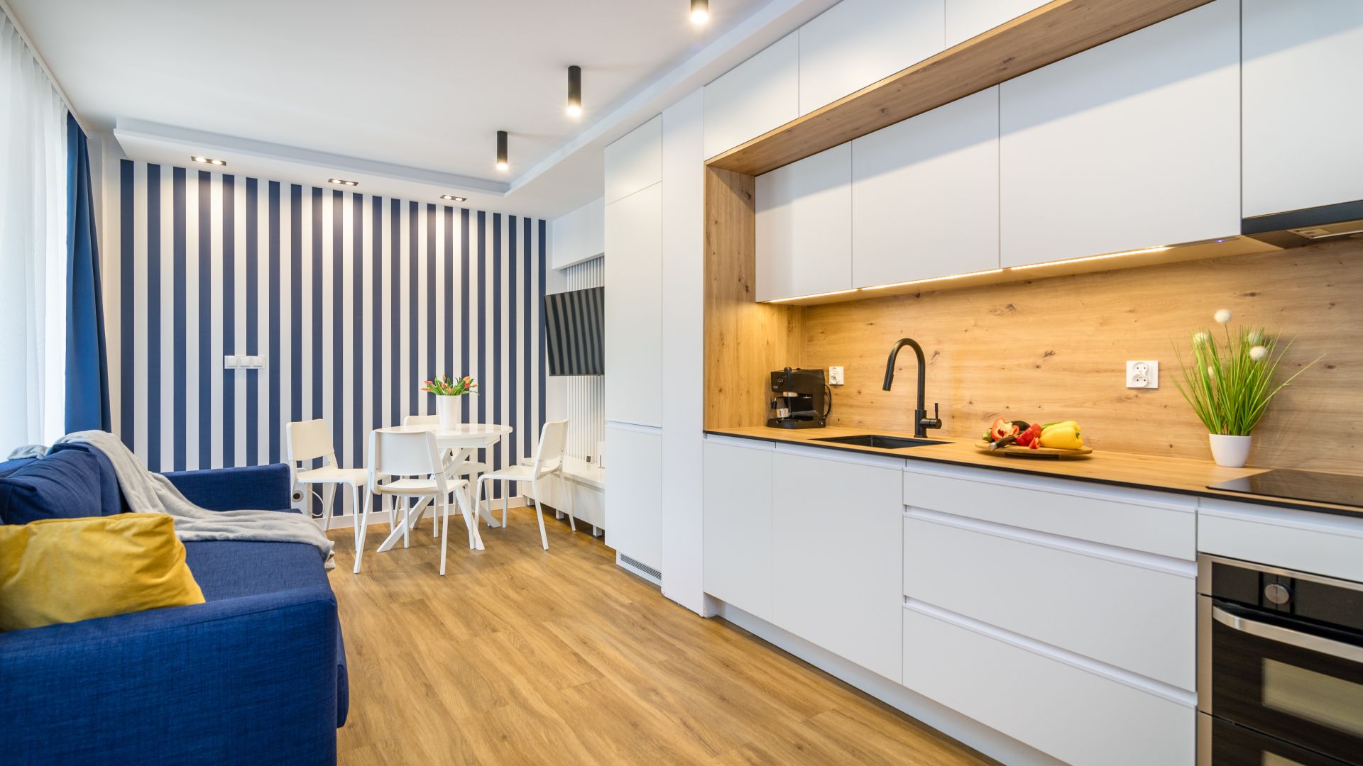 W salonie znajduje się również stół oraz aneks kuchenny, który jest wyposażony we wszystko, czego potrzebujesz do przygotowania posiłków: piekarnik, lodówkę, ekspres do kawy, czajnik oraz talerze i sztućce.