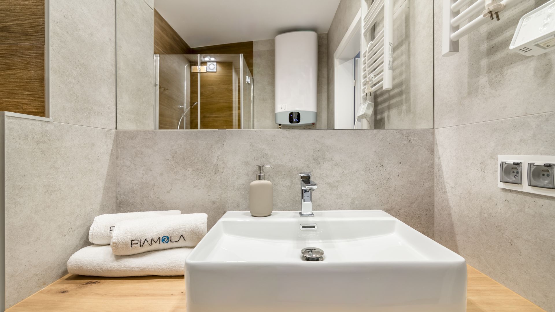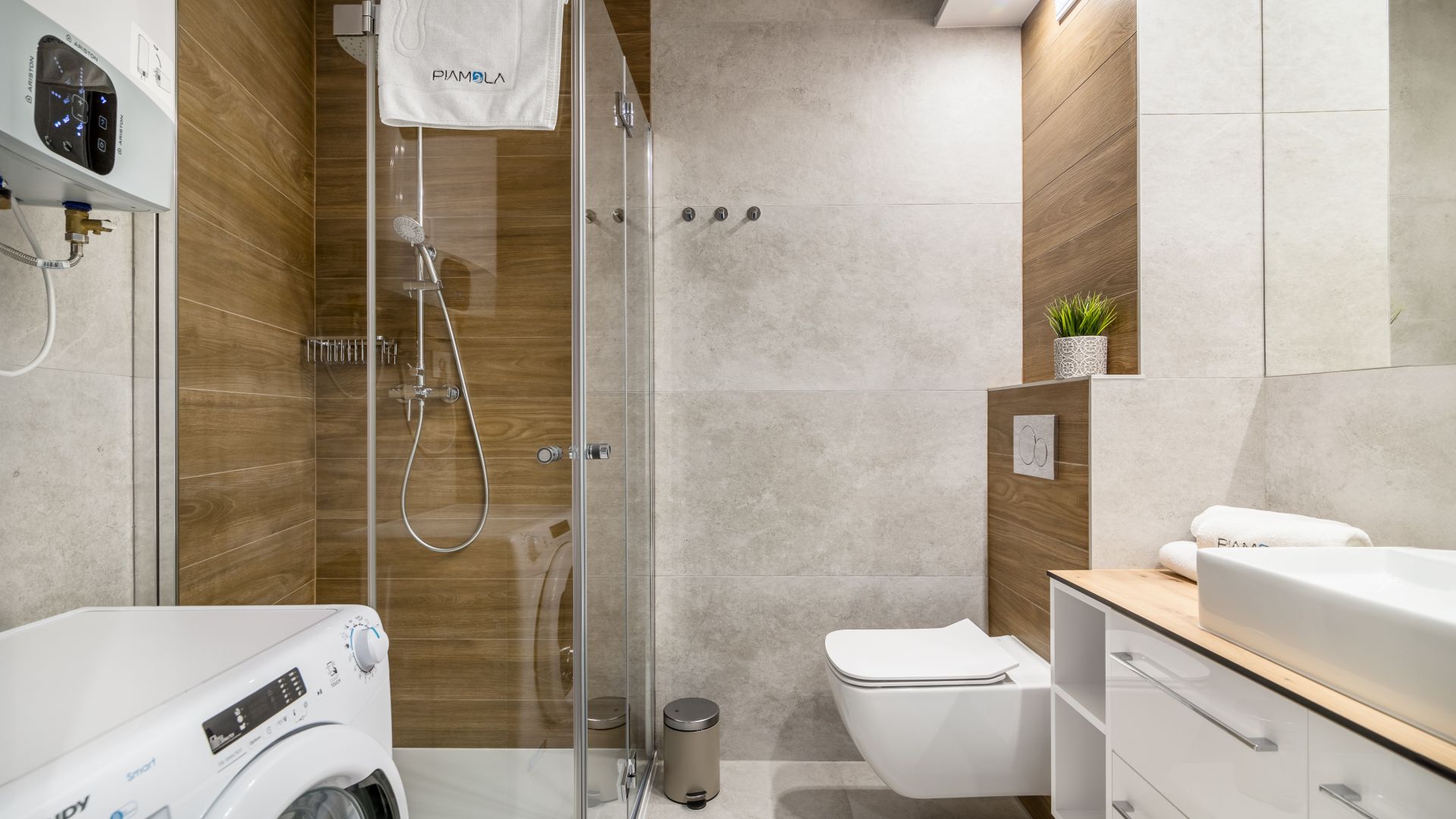 W łazience znajduje się prysznic, pralka, suszarka na pranie, suszarka do włosów oraz ręczniki. Apartament jest również wyposażony w deskę do prasowania i żelazko.