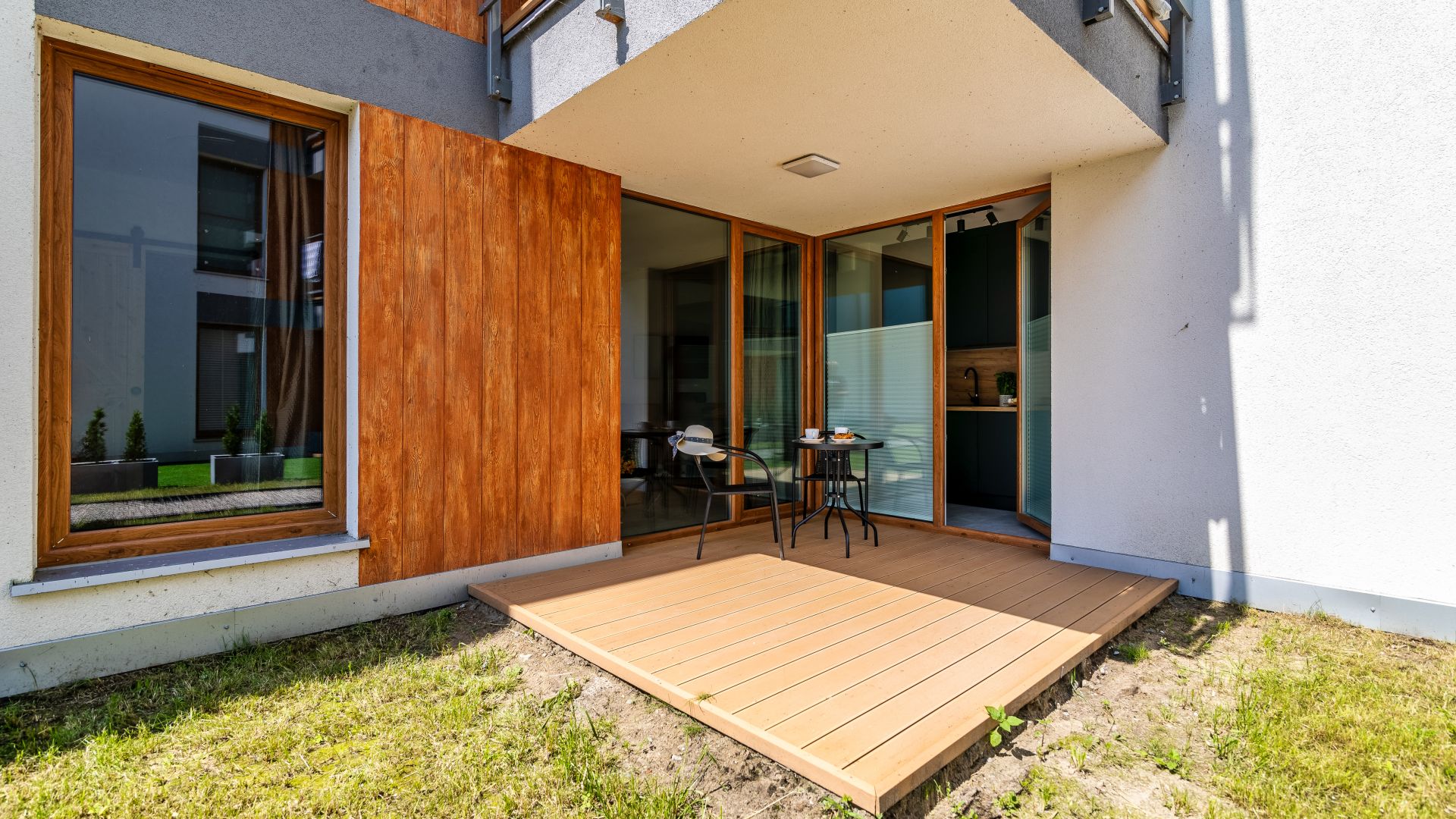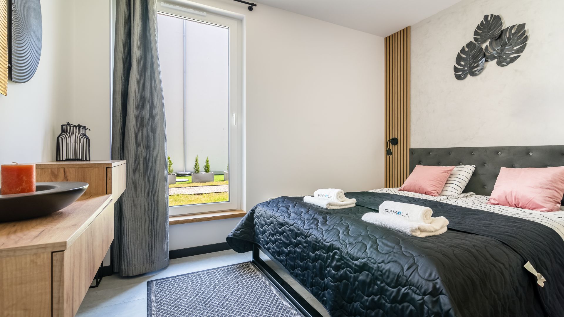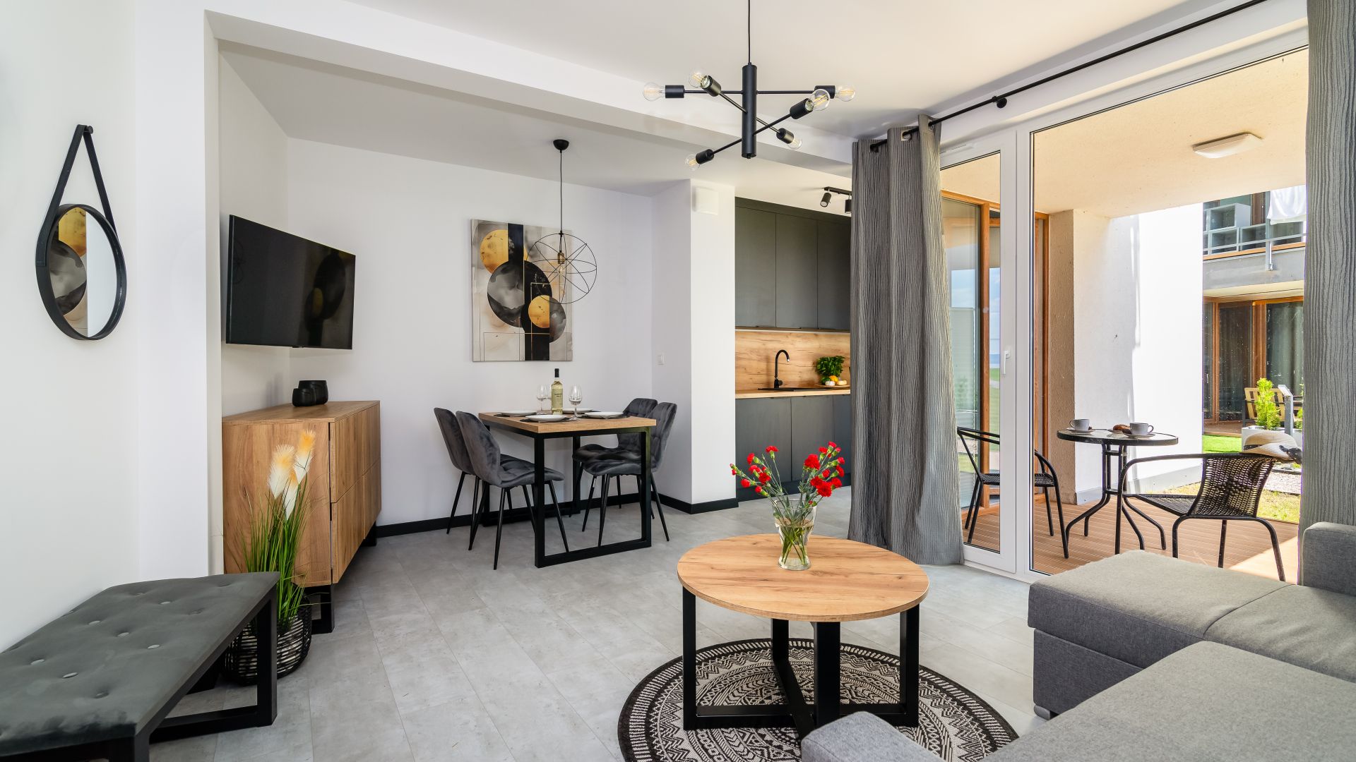 Ten uroczy apartament o powierzchni 39 m², położony w malowniczej Krynicy Morskiej przy Zalewie Wiślanym, oferuje komfortowe warunki pobytu dla każdego gościa. Salon z aneksem kuchennym to przestrzeń, gdzie można nie tylko przygotować posiłki dzięki dobrze wyposażonej kuchni z piekarnikiem, mikrofalówką, zmywarką i czajnikiem elektrycznym, ale również zrelaksować się przy stole lub na kanapie, która może służyć jako dodatkowe miejsce do spania dla dwóch osób. W salonie znajduje się również telewizor i klimatyzacja, zapewniające rozrywkę i komfort termiczny niezależnie od pogody. Sypialnia gwarantuje spokojny odpoczynek, a łazienka wyposażona jest w pralkę, suszarkę do włosów oraz ręczniki, co zwiększa wygodę pobytu. Dodatkowym atutem jest taras, z którego można podziwiać widoki i który prowadzi do odkrytego basenu, idealnego do orzeźwienia w ciepłe dni. Dla najmłodszych przygotowano duży plac zabaw, co czyni ten apartament doskonałym wyborem dla rodzin.
