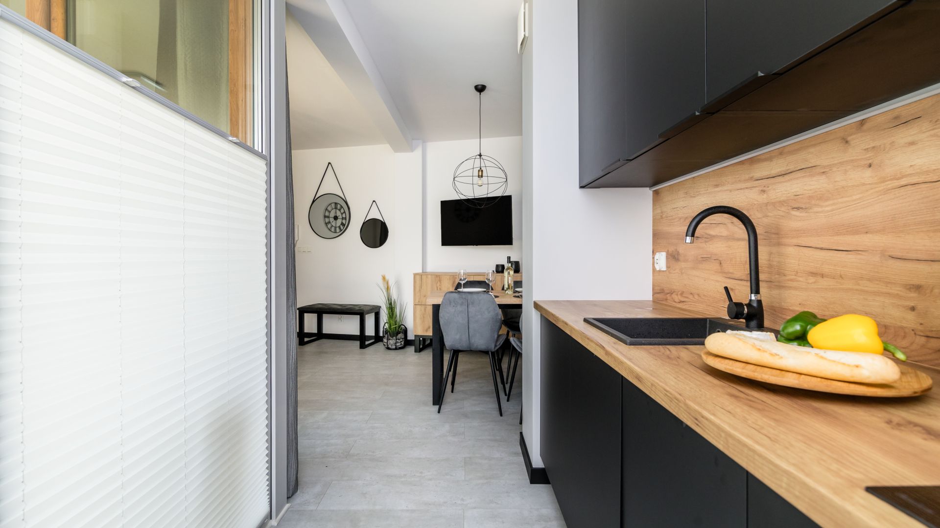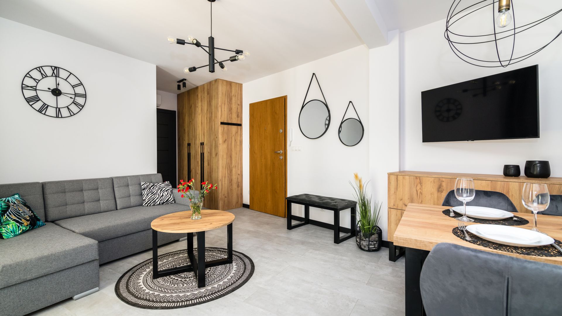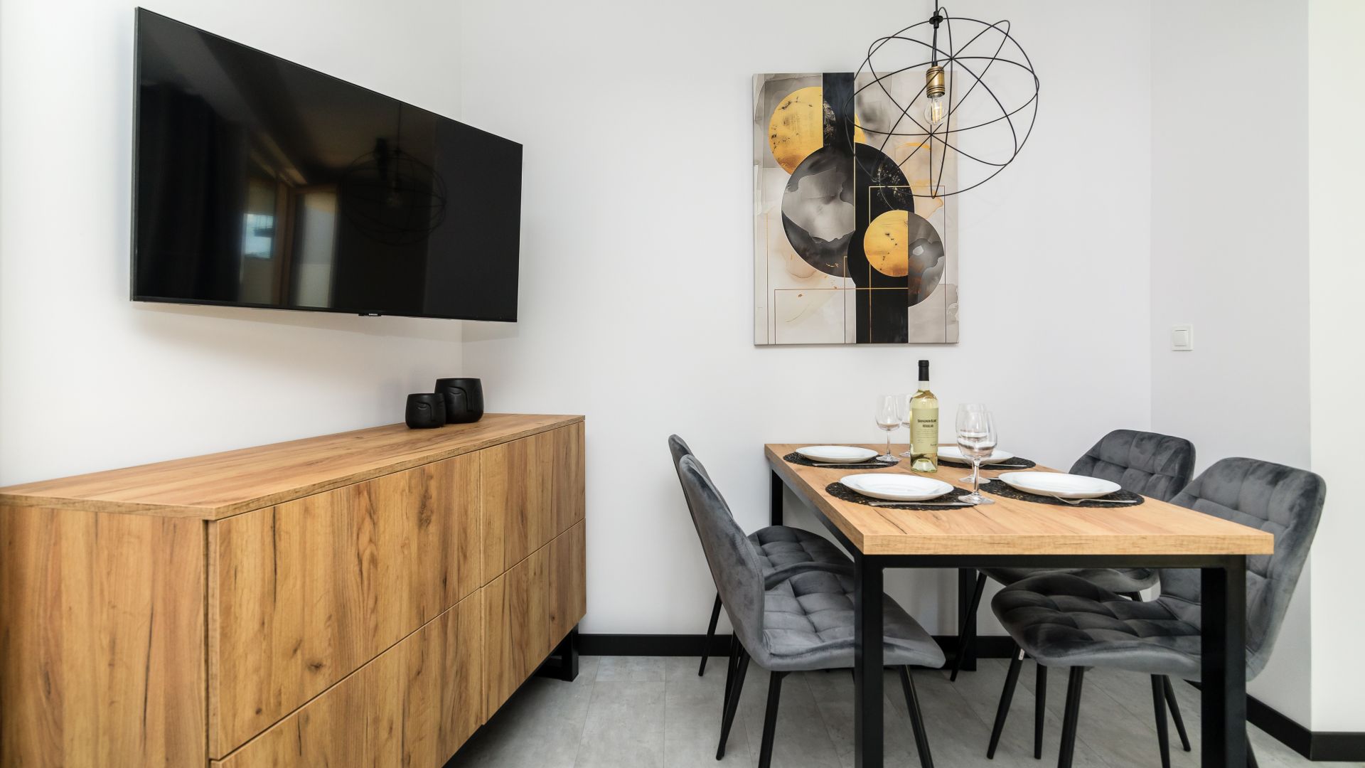 Ten uroczy apartament o powierzchni 39 m², położony w malowniczej Krynicy Morskiej przy Zalewie Wiślanym, oferuje komfortowe warunki pobytu dla każdego gościa. Salon z aneksem kuchennym to przestrzeń, gdzie można nie tylko przygotować posiłki dzięki dobrze wyposażonej kuchni z piekarnikiem, mikrofalówką, zmywarką i czajnikiem elektrycznym, ale również zrelaksować się przy stole lub na kanapie, która może służyć jako dodatkowe miejsce do spania dla dwóch osób. W salonie znajduje się również telewizor i klimatyzacja, zapewniające rozrywkę i komfort termiczny niezależnie od pogody. Sypialnia gwarantuje spokojny odpoczynek, a łazienka wyposażona jest w pralkę, suszarkę do włosów oraz ręczniki, co zwiększa wygodę pobytu. Dodatkowym atutem jest taras, z którego można podziwiać widoki i który prowadzi do odkrytego basenu, idealnego do orzeźwienia w ciepłe dni. Dla najmłodszych przygotowano duży plac zabaw, co czyni ten apartament doskonałym wyborem dla rodzin.