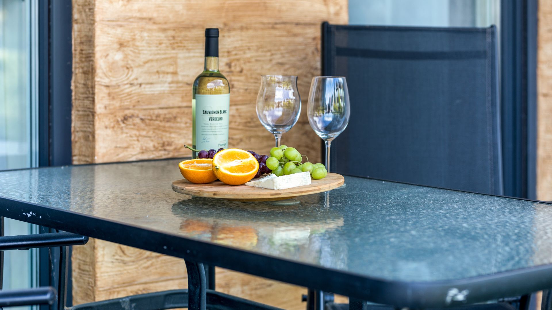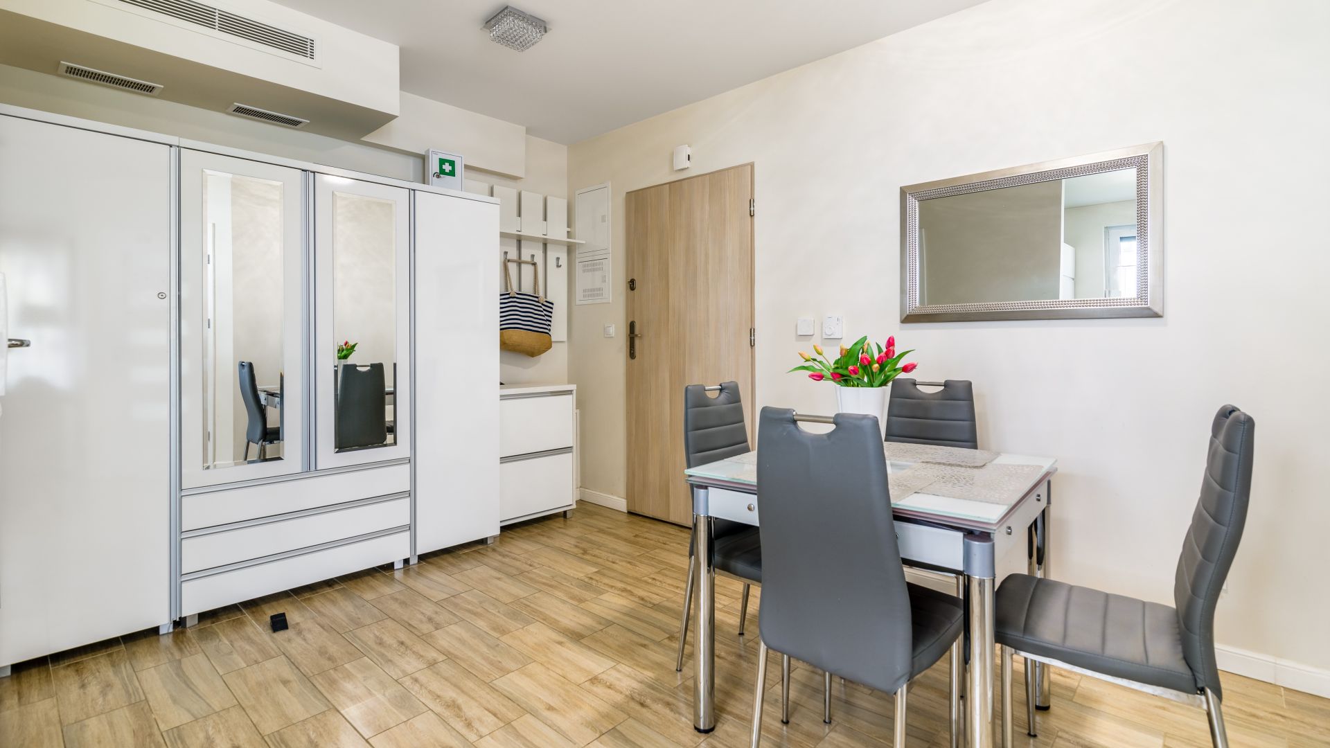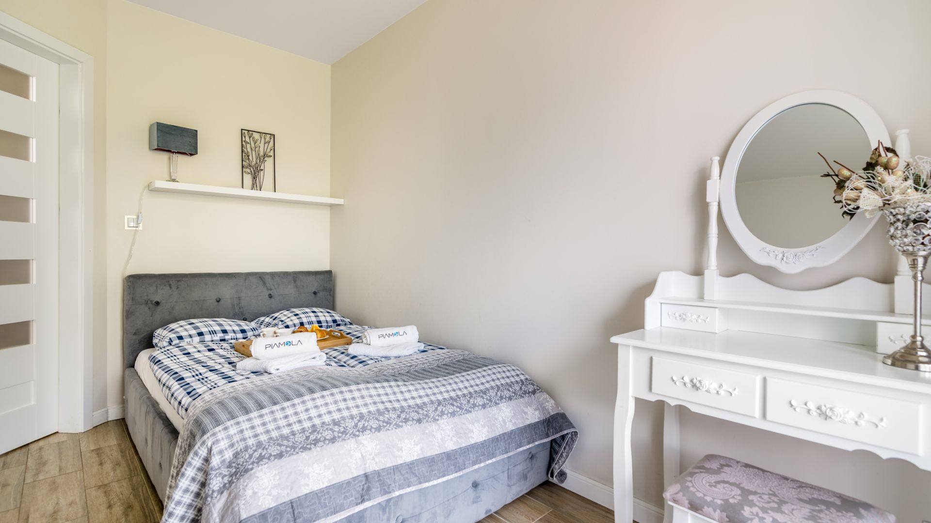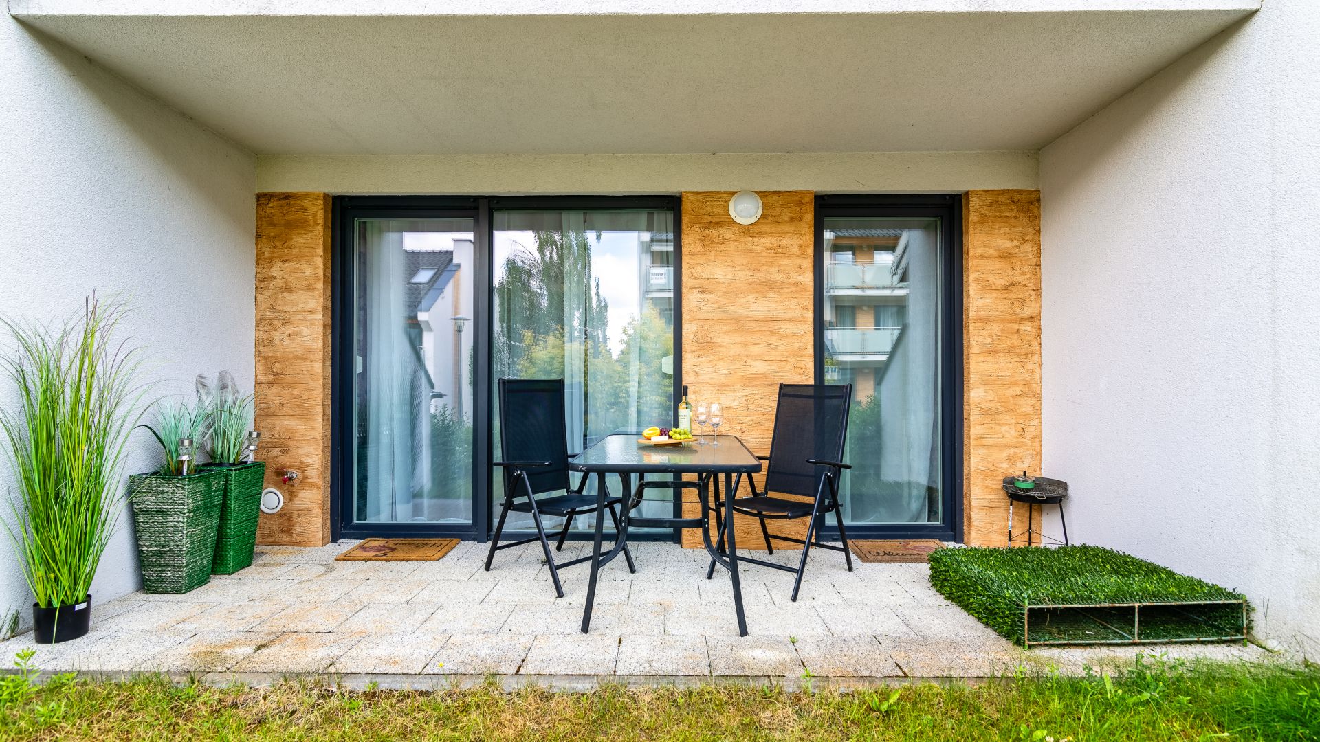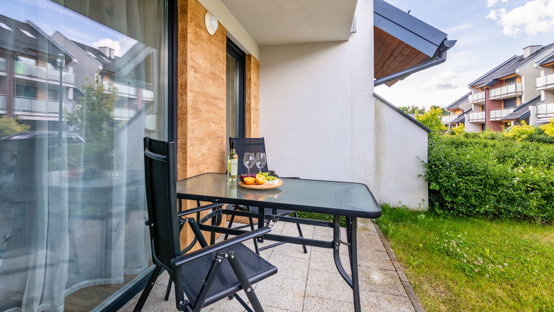 Apartament składa się z salonu z aneksem kuchennym, sypialni, łazienki i tarasu. W salonie znajduje się rozkładana sofa, telewizor z płaskim ekranem oraz stolik kawowy. Aneks kuchenny jest w pełni wyposażony w lodówkę, zmywarkę, mikrofalówkę, piekarnik, ekspres do kawy i wszystkie niezbędne akcesoria kuchenne. Można tu przygotowywać posiłki i spożywać je przy dużym stole z krzesłami. W sypialni znajduje się wygodne łóżko małżeńskie oraz toaletka. Przestronna łazienka wyposażona została w pralkę, suszarkę do włosów i kabinę prysznicową. Z salonu można wyjść na taras, gdzie znajdują się meble ogrodowe. Można tu odpoczywać, czytać, opalać się lub podziwiać widok na okolicę. Do apartamentu przynależy także miejsce parkingowe na zamkniętym parkingu podziemnym. Goście mogą korzystać z niego bez dodatkowych opłat.