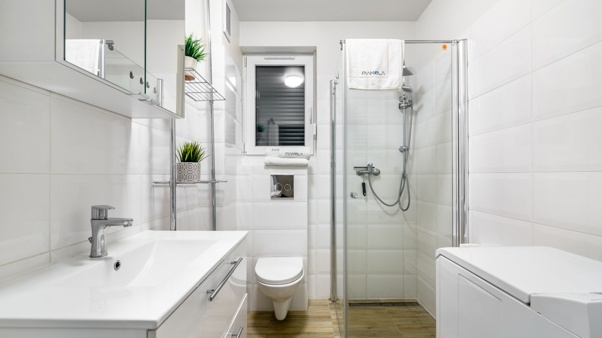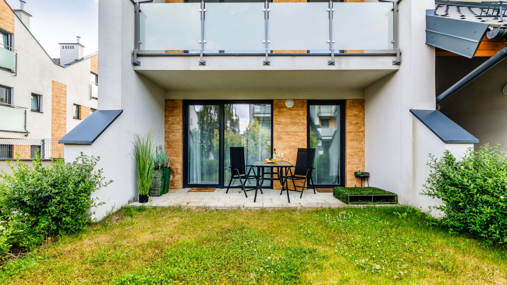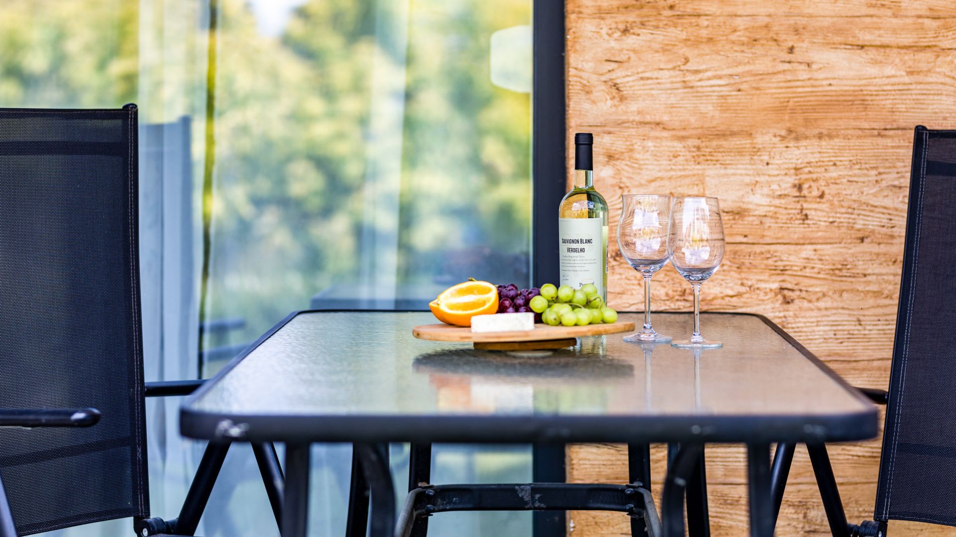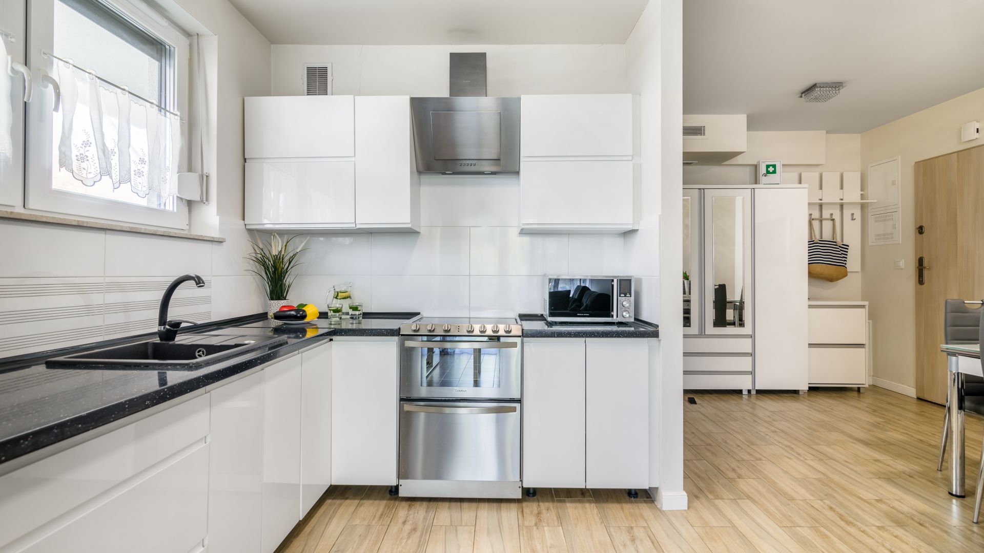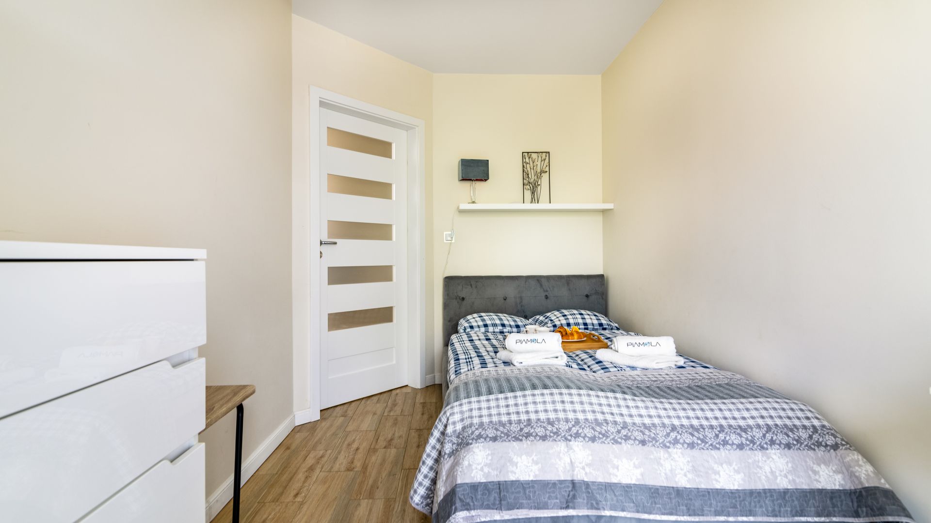 Apartament składa się z salonu z aneksem kuchennym, sypialni, łazienki i tarasu. W salonie znajduje się rozkładana sofa, telewizor z płaskim ekranem oraz stolik kawowy. Aneks kuchenny jest w pełni wyposażony w lodówkę, zmywarkę, mikrofalówkę, piekarnik, ekspres do kawy i wszystkie niezbędne akcesoria kuchenne. Można tu przygotowywać posiłki i spożywać je przy dużym stole z krzesłami. W sypialni znajduje się wygodne łóżko małżeńskie oraz toaletka. Przestronna łazienka wyposażona została w pralkę, suszarkę do włosów i kabinę prysznicową. Z salonu można wyjść na taras, gdzie znajdują się meble ogrodowe. Można tu odpoczywać, czytać, opalać się lub podziwiać widok na okolicę. Do apartamentu przynależy także miejsce parkingowe na zamkniętym parkingu podziemnym. Goście mogą korzystać z niego bez dodatkowych opłat.