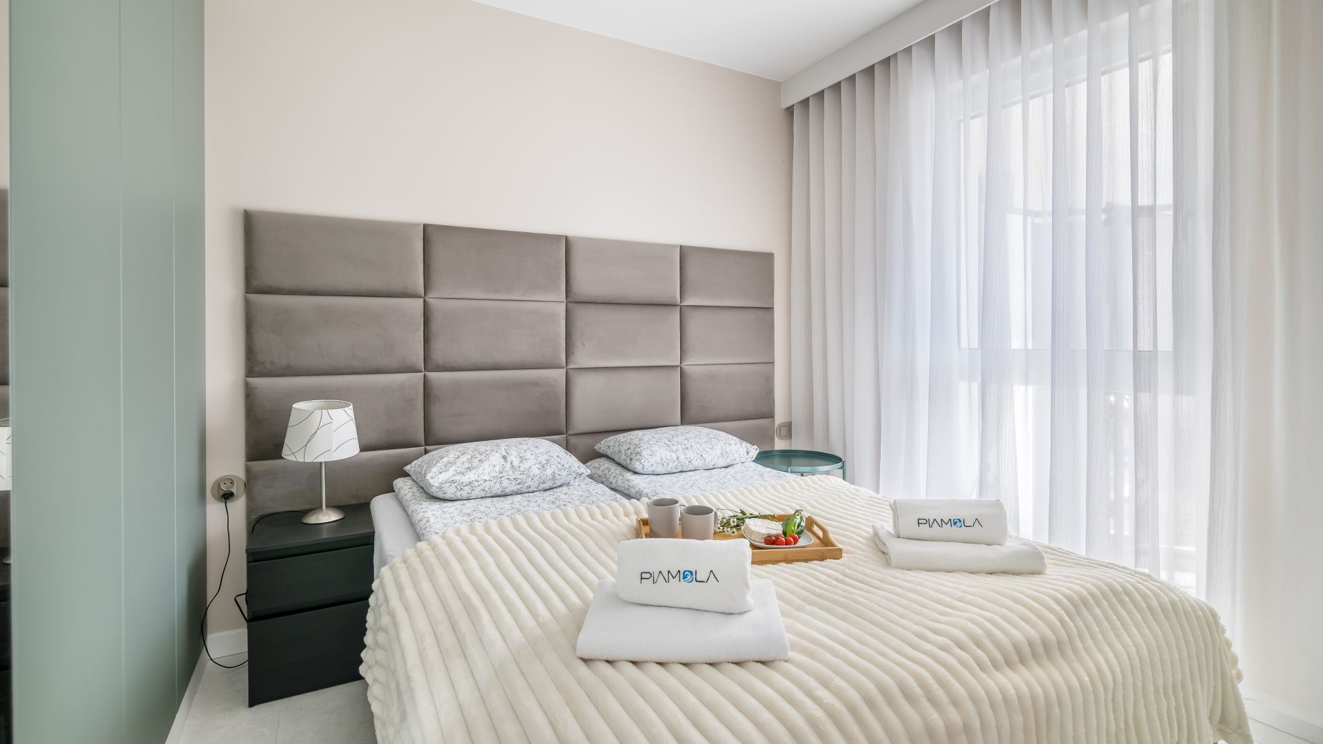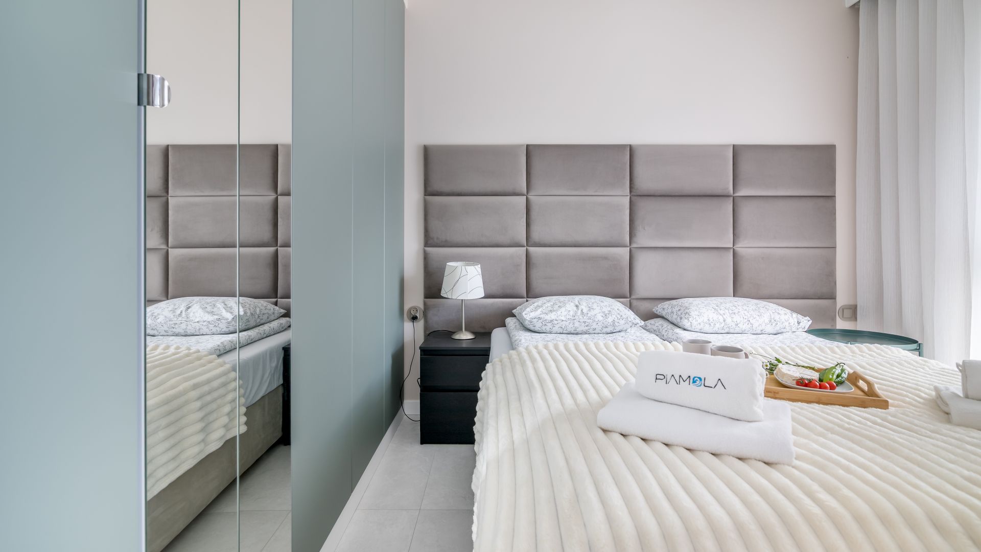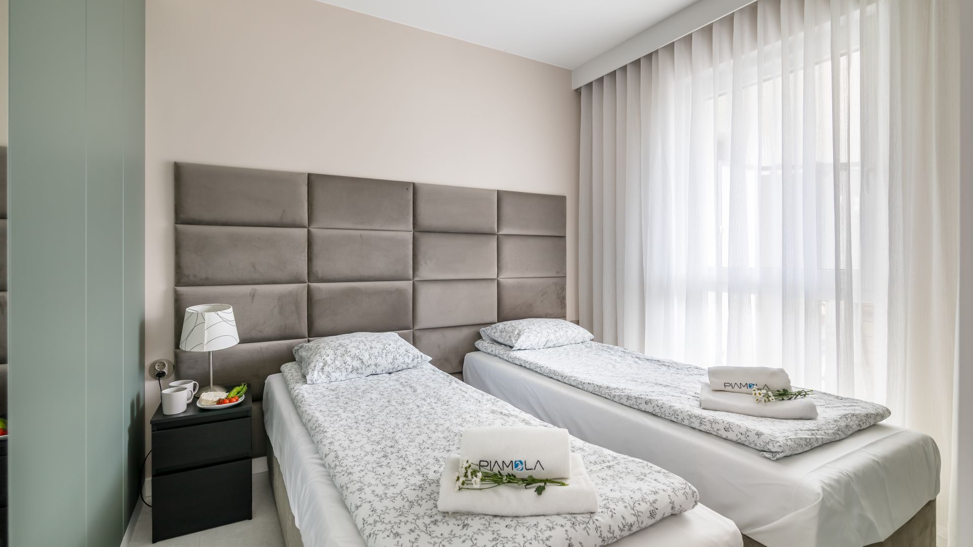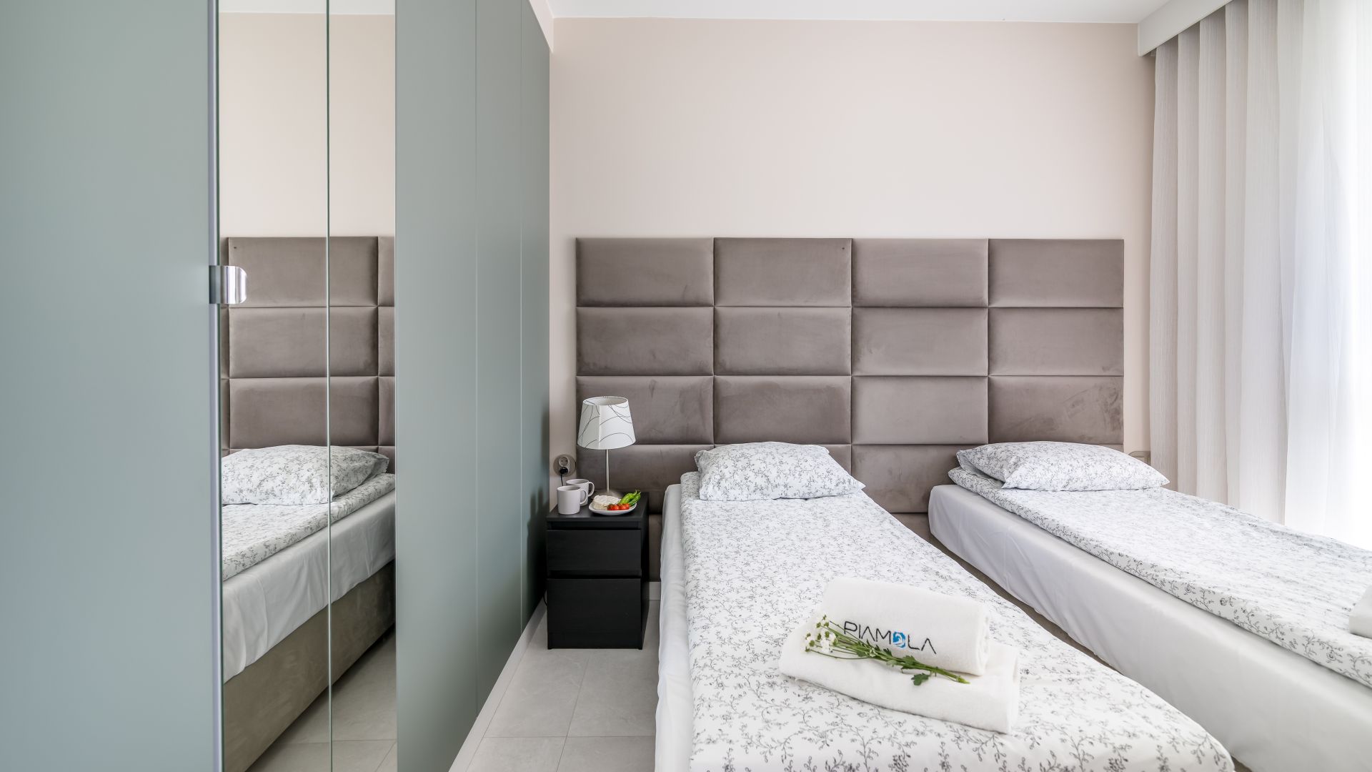 Sypialnia wyposażona jest w dwa pojedyncze łóżka, które można połączyć w wygodne łóżko małżeńskie, dostosowując się do potrzeb gości.