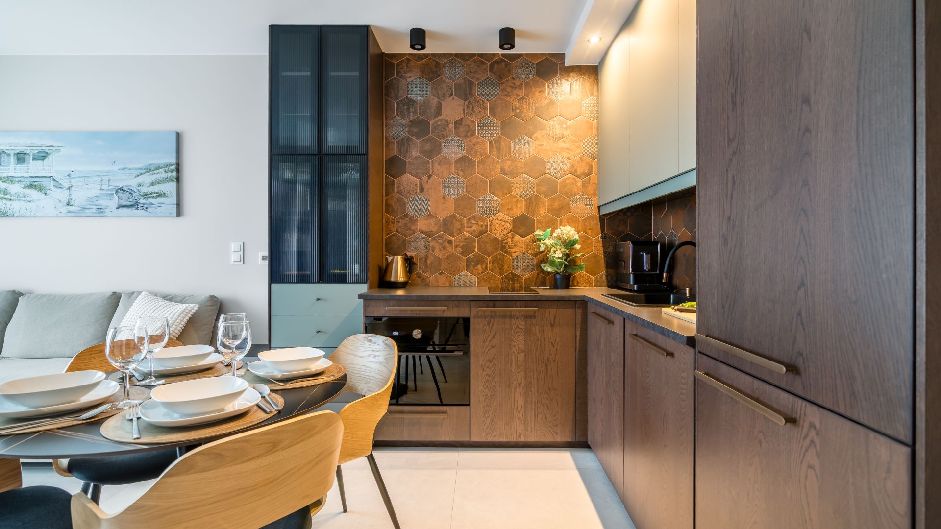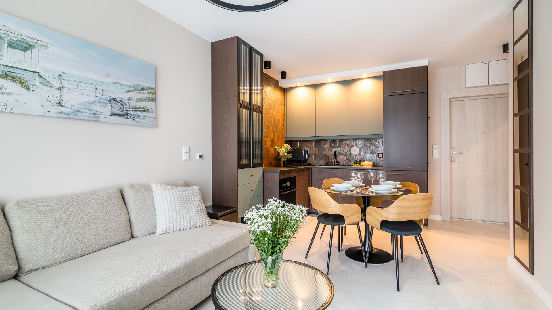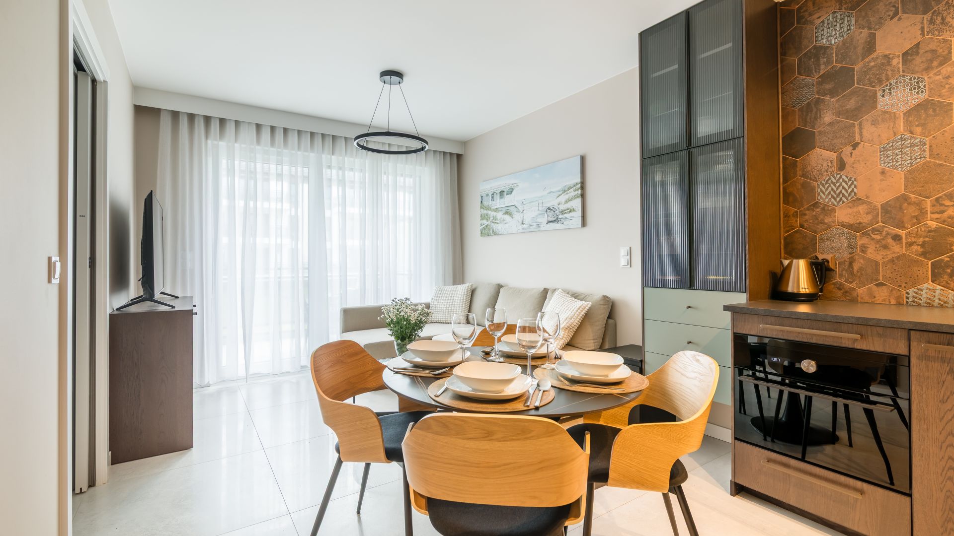 Wewnątrz znajdziesz przestronny salon z aneksem kuchennym, wyposażonym w wszystko, co niezbędne do komfortowego gotowania i spożywania posiłków. Aneks kuchenny obejmuje m.in. zmywarkę, piekarnik z funkcją mikrofalówki, czajnik elektryczny oraz inne przydatne urządzenia. Przy stole jadalnym można wspólnie spędzić czas, a w salonie znajduje się rozkładana sofa, na której mogą nocować dwie osoby.
