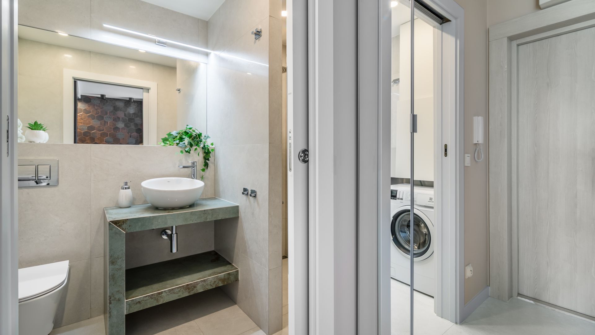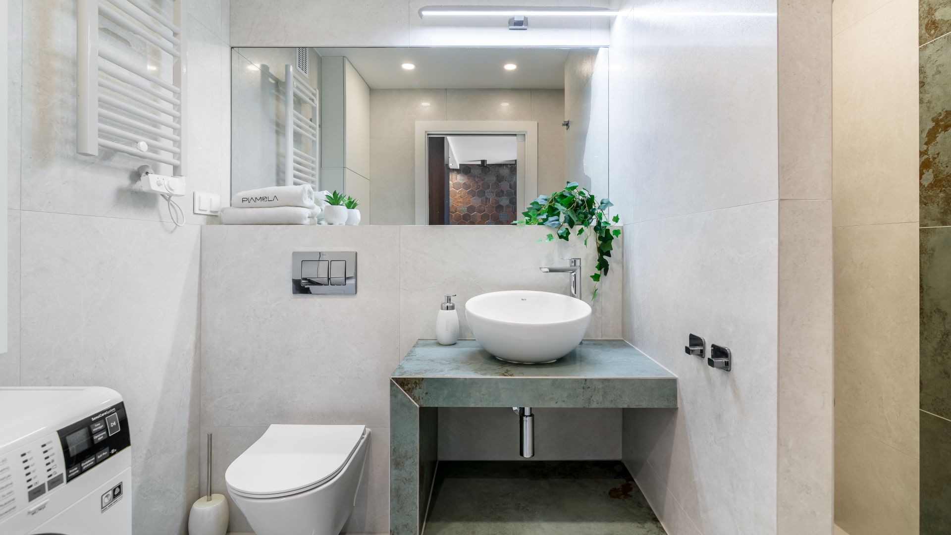 W łazience znajduje się pralka, suszarka do włosów oraz zabudowany prysznic, zapewniający komfort podczas pobytu.