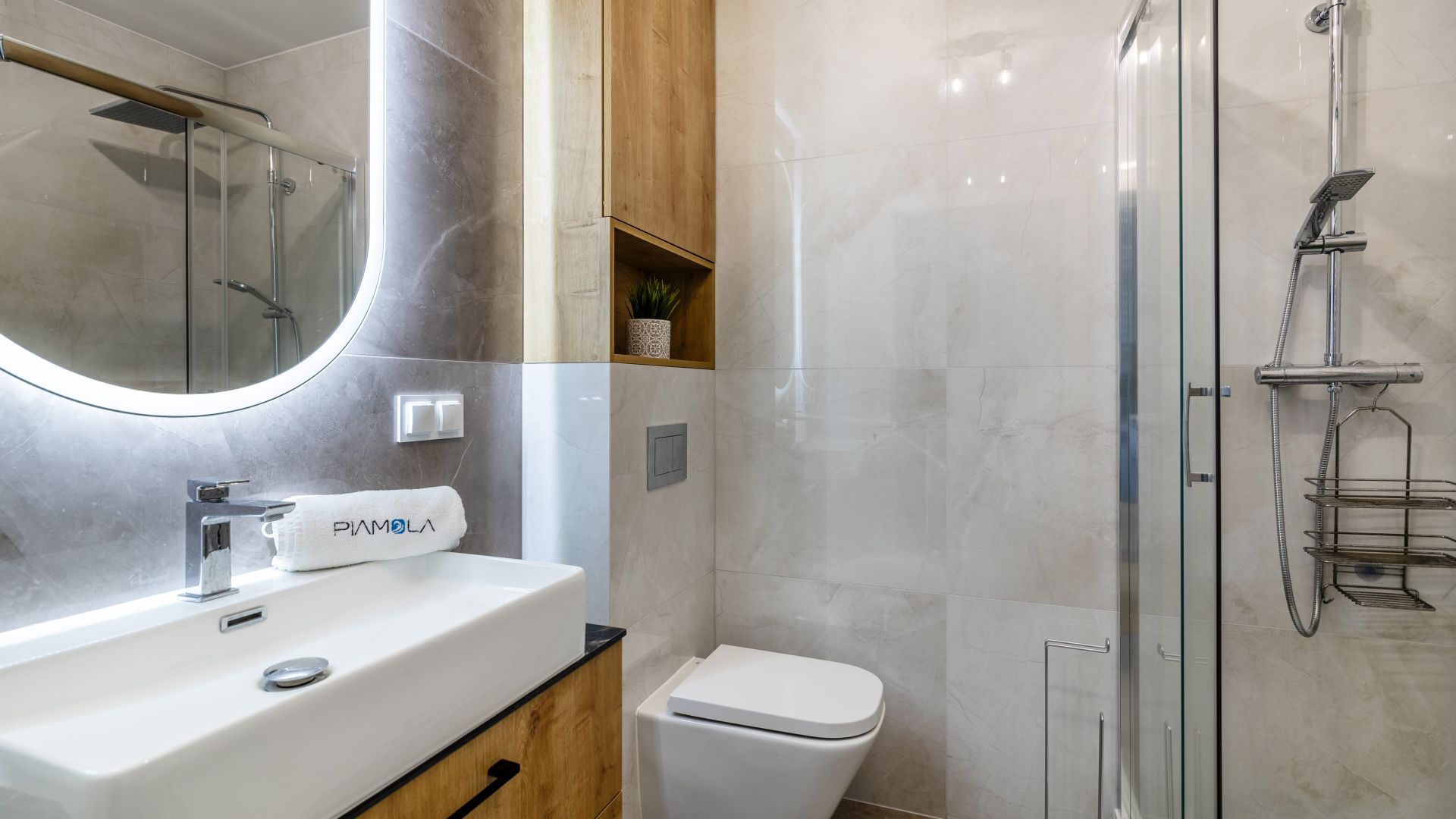 Łazienka jest równie funkcjonalna, z kabiną prysznicową i suszarką do włosów, co zapewnia dodatkowy komfort podczas pobytu.