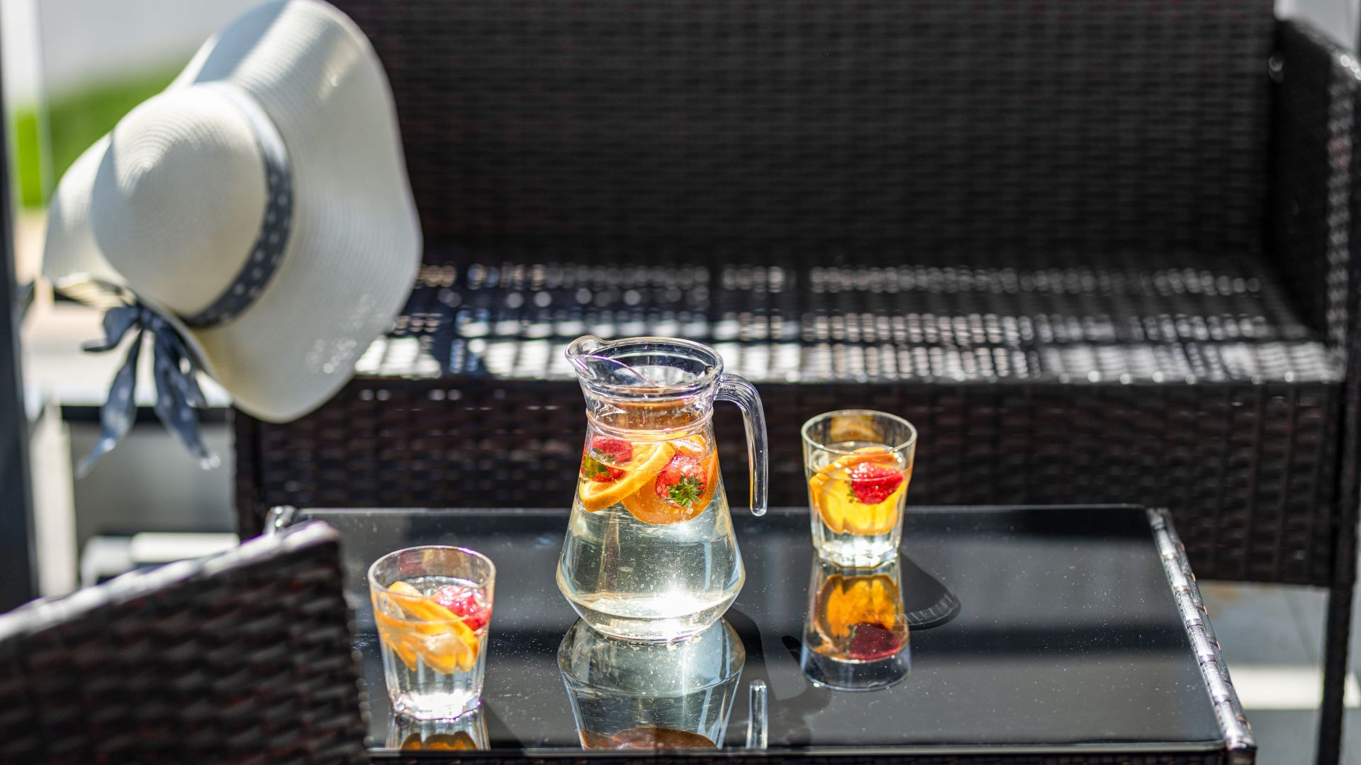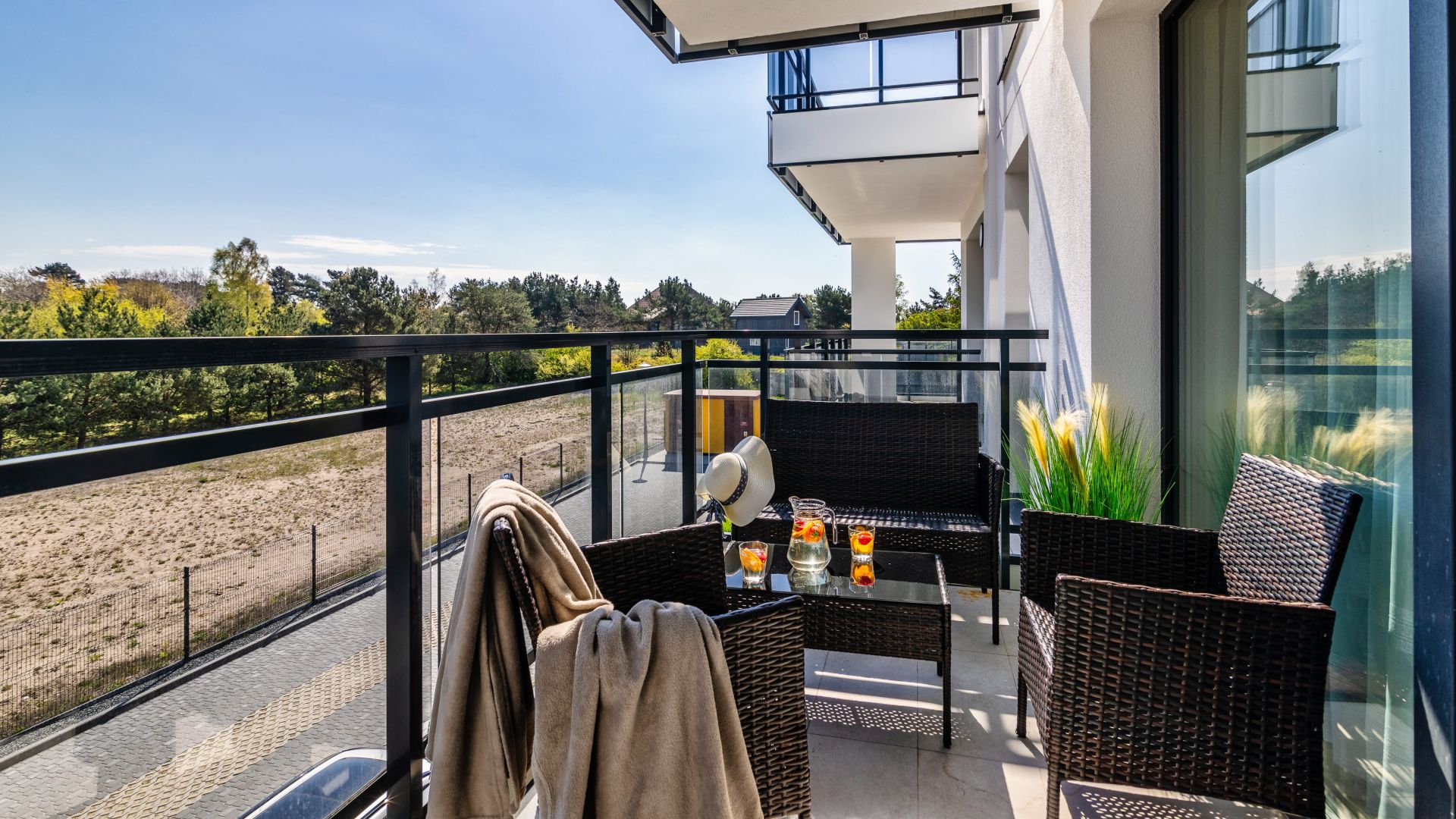 Z salonu można wyjść na balkon, gdzie znajdują się wygodne meble ogrodowe, idealne do wypicia porannej kawy czy wieczornego relaksu z książką w dłoni, z widokiem na spokojną okolicę.