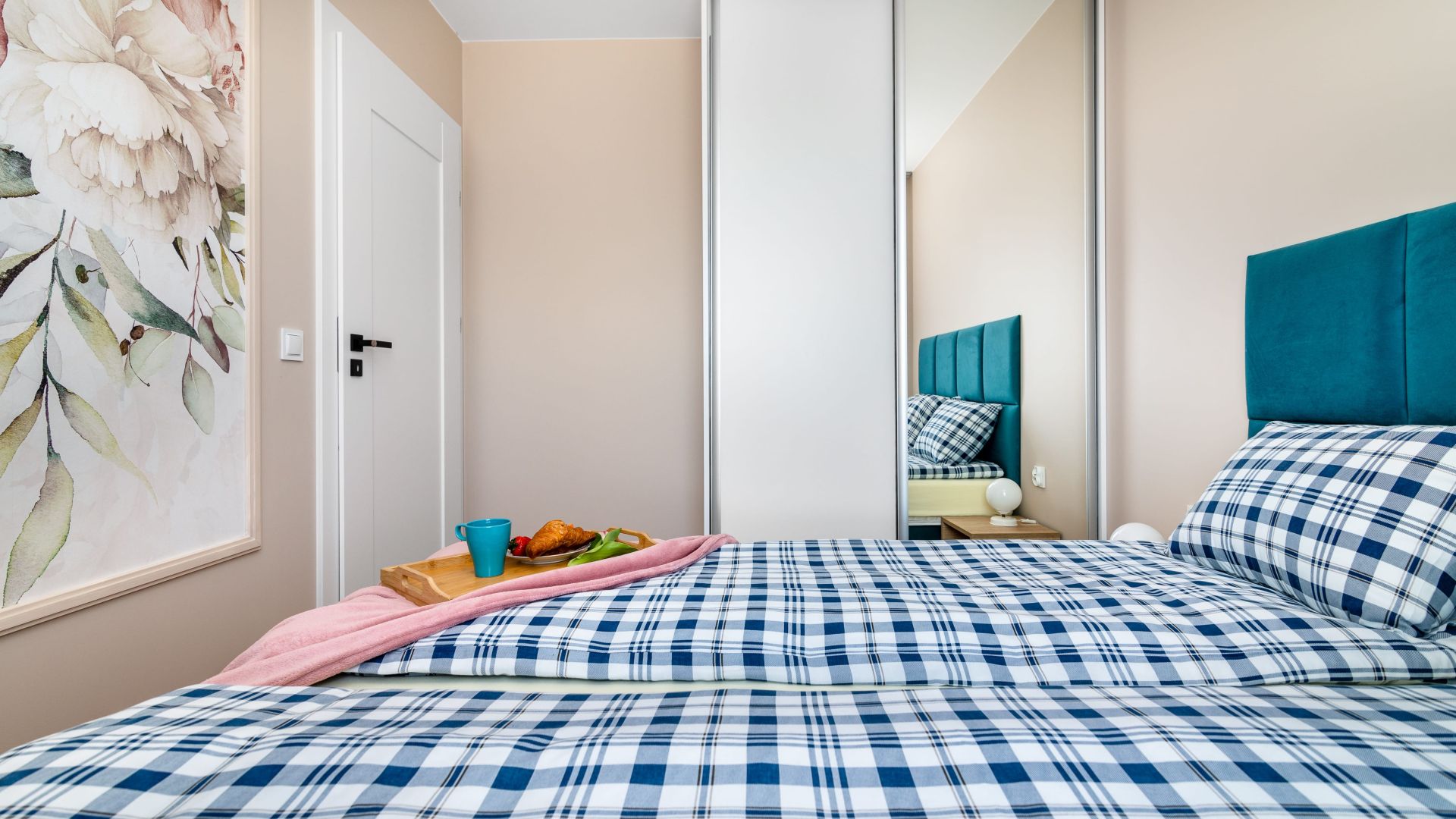 Salon to przestrzeń zaprojektowana z myślą o komforcie i funkcjonalności. Znajduje się tu telewizor, który umili wieczory filmowe oraz rozkładana sofa, która może pomieścić dwie osoby do spania, co czyni apartament idealnym dla rodzin lub grupy przyjaciół. Sypialnia zapewnia spokojny sen dzięki wygodnemu łóżku małżeńskiemu, gwarantującemu regenerację sił po dniu pełnym wrażeń.