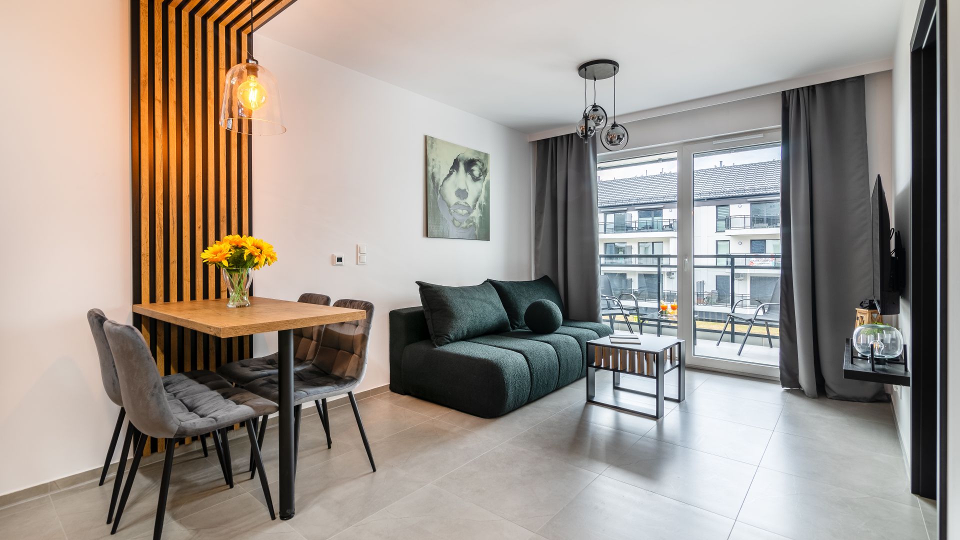 Z salonu prowadzi wejście na balkon, na którym znajdują się meble ogrodowe - idealne do relaksu na świeżym powietrzu.