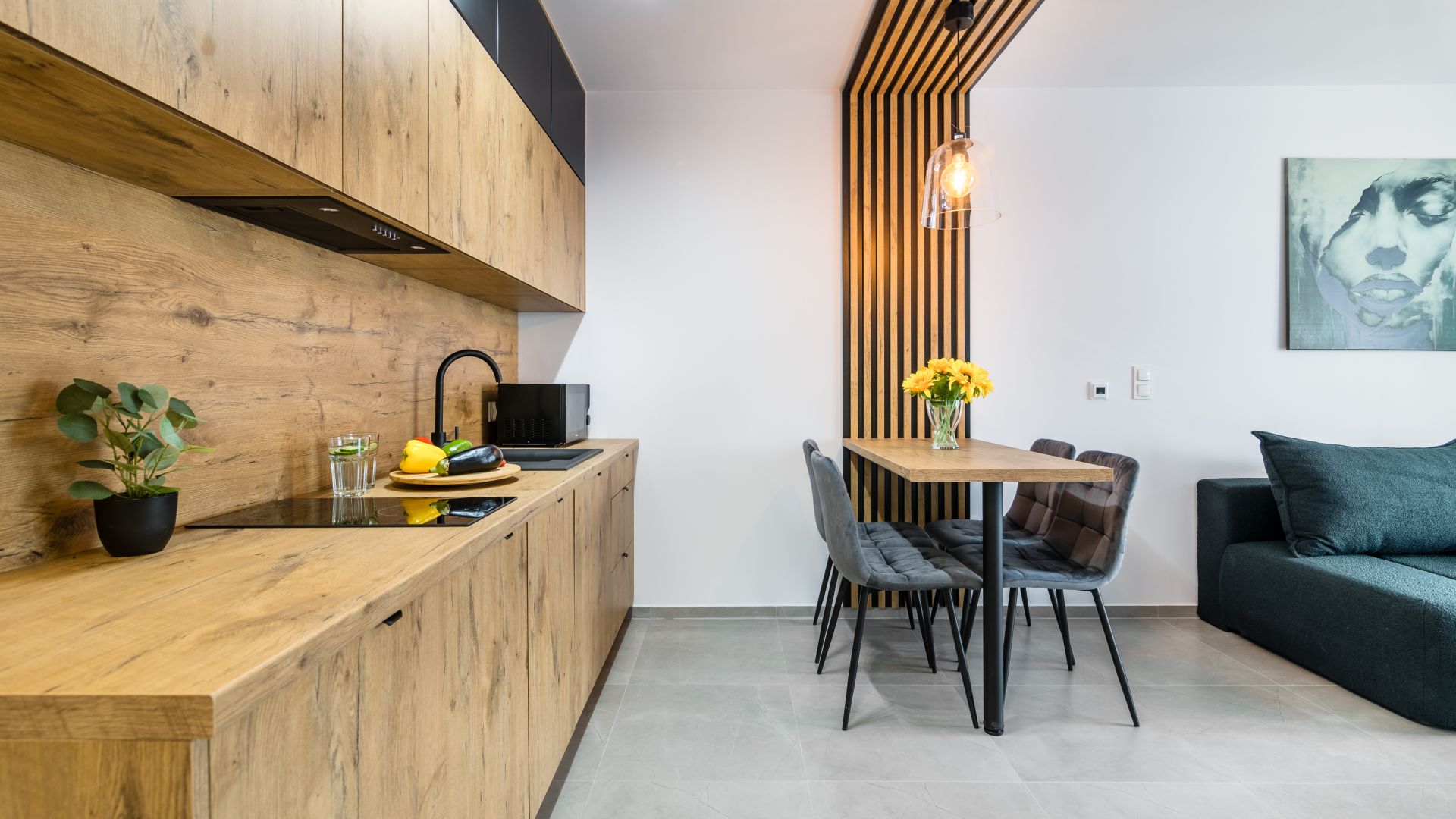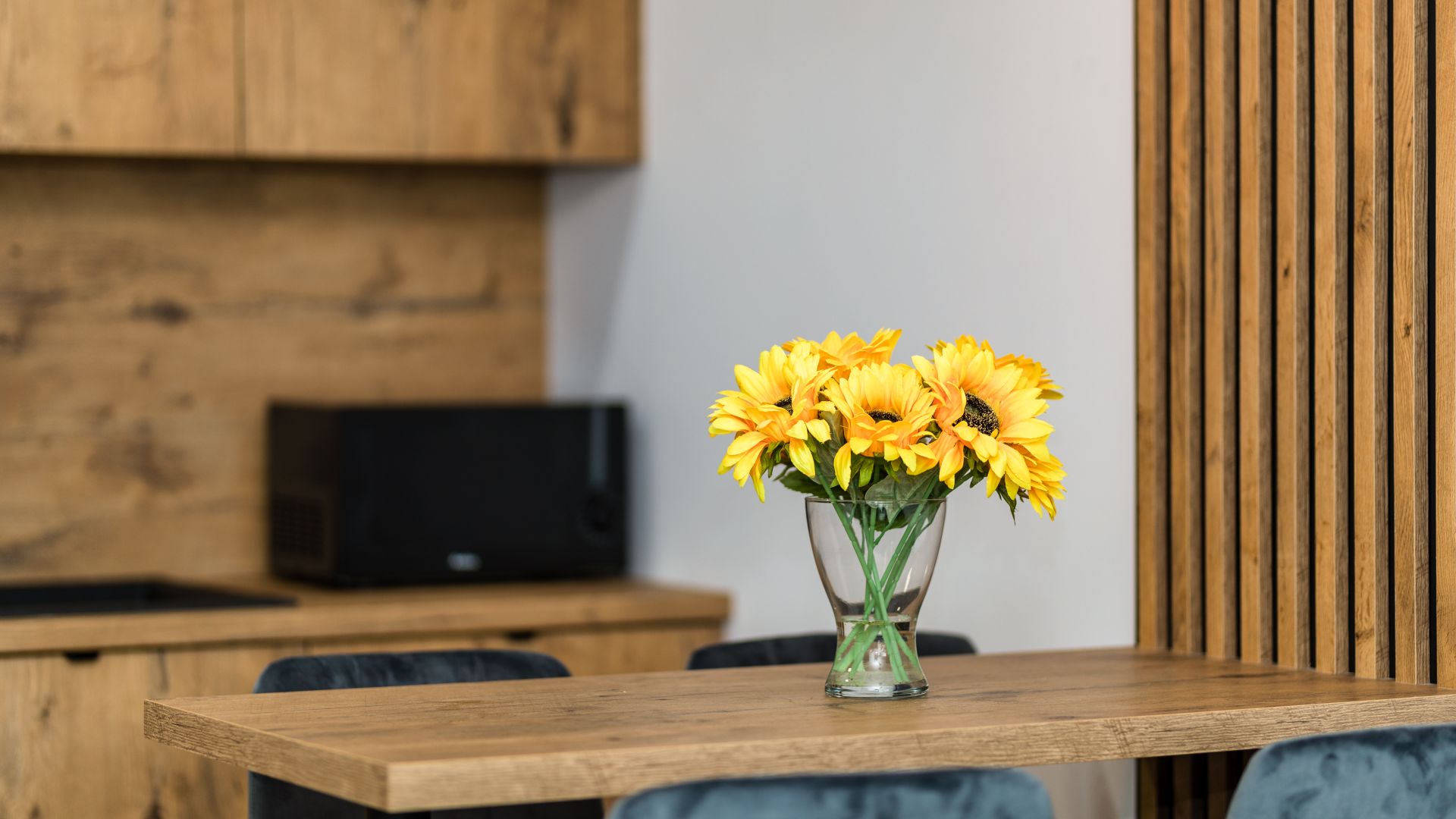 Salon łączy się z aneksem kuchennym, który jest wyposażony we wszystko, co niezbędne do przygotowania posiłków: lodówkę, zmywarkę i mikrofalówkę. Dodatkowo, na wyposażeniu są czajnik, talerze oraz sztućce.