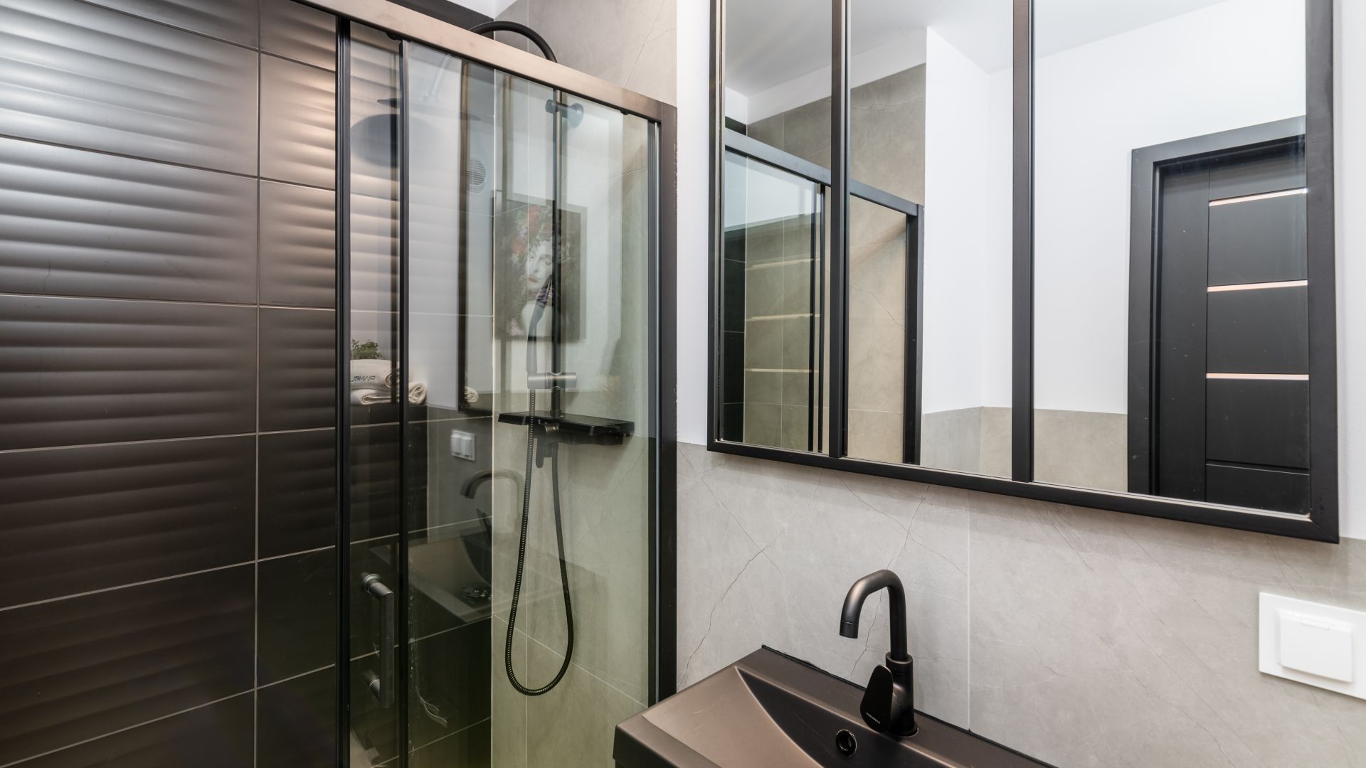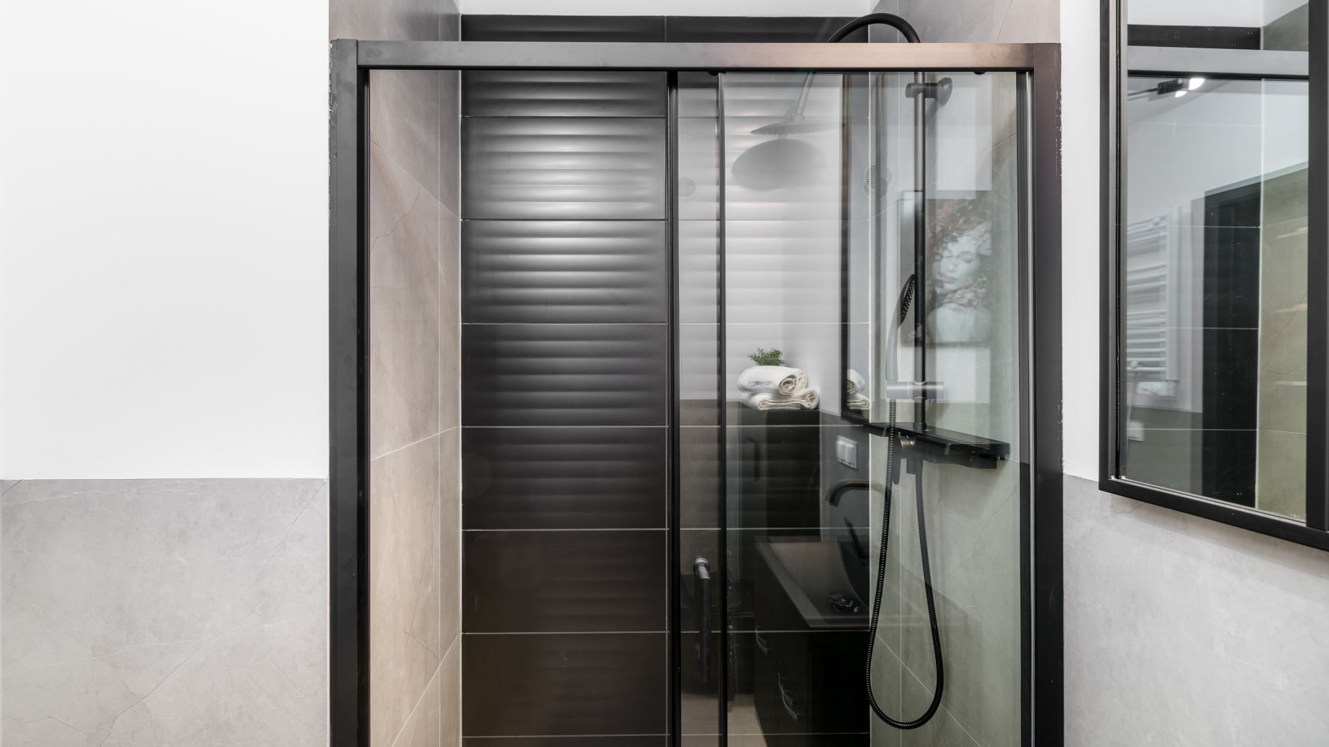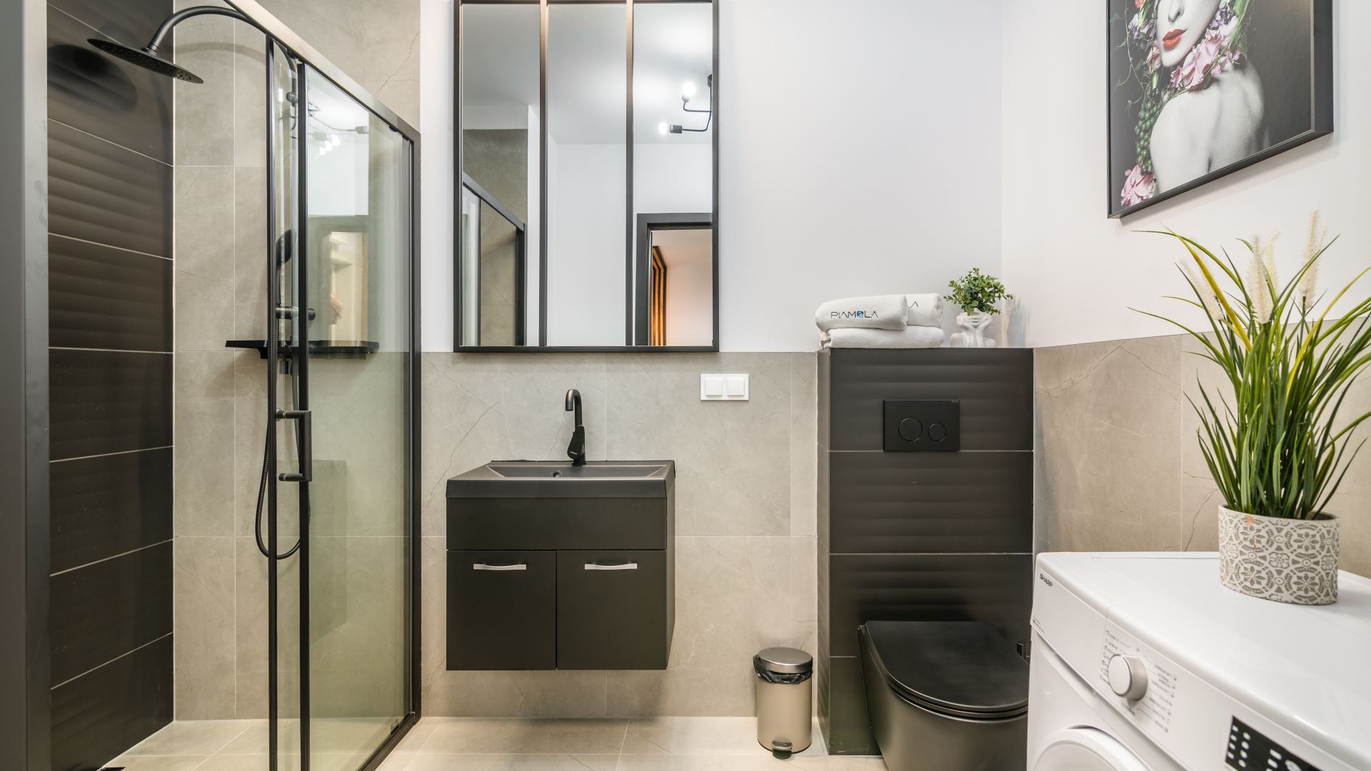 Łazienka jest wyposażona w prysznic, pralkę, suszarkę do włosów oraz ręczniki.